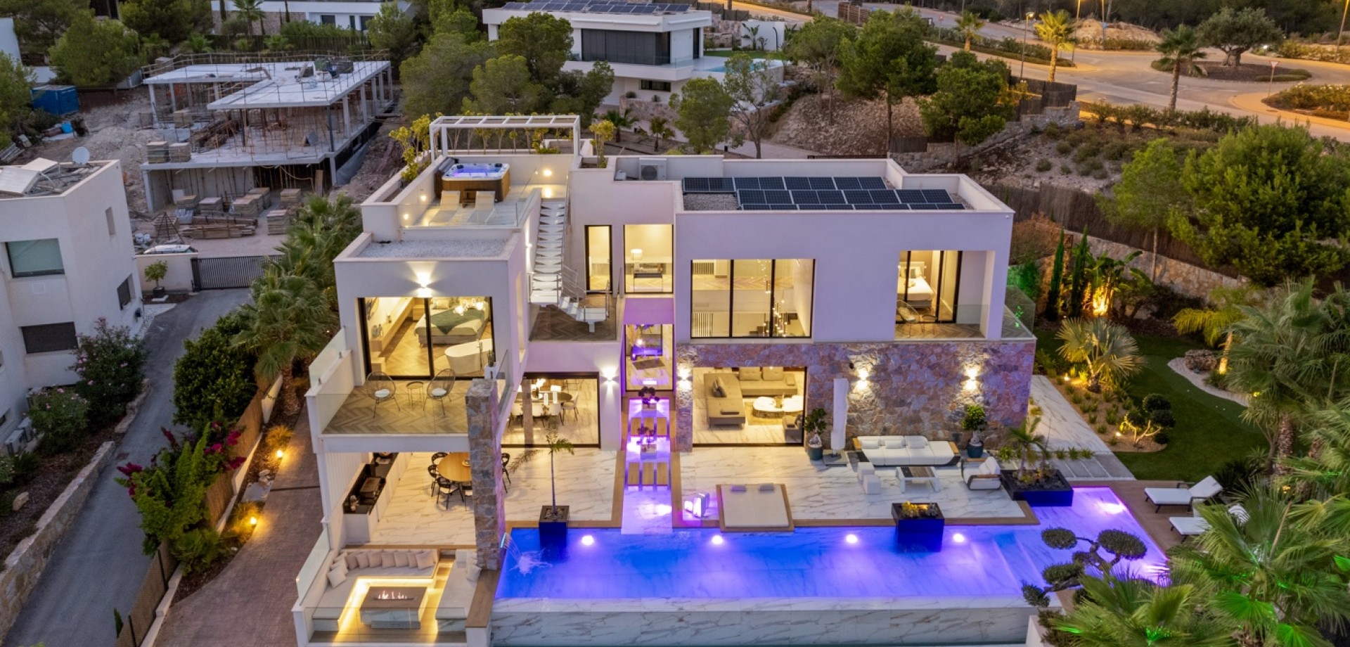 Willkommen in einer unserer prestigeträchtigsten Villen, einem einzigartigen Anwesen in der prestigeträchtigen Gemeinde Las Colinas. Wenn Sie sich der Villa nähern, öffnet sich der große Eingang zum wunderschön gepflegten Garten und bietet den perfekten Einstieg in die Eleganz, die darin steckt. Der Zugang zur Villa erfolgt über eine großzügige Auffahrt und beim Betreten werden Sie von einer beeindruckenden Eingangshalle begrüßt, die den Ton für die gesamte Residenz vorgibt. Das markante Herzstück fällt sofort ins Auge: ein prächtiger Bonsai-Baum, sorgfältig platziert in einem ruhigen Garten, der Gelassenheit ausstrahlt. Das Erdgeschoss ist ein Meisterwerk der Raffinesse, mit luxuriösen Marmorböden, die ein Gefühl von Erhabenheit vermitteln. Das sorgfältig ausgewählte Interieur verbindet moderne Eleganz mit zeitloser Raffinesse und schafft so einen einladenden und exklusiven Raum. Jeder Quadratzentimeter dieser Villa wurde mit viel Liebe zum Detail gestaltet, um ein wirklich einzigartiges Wohnerlebnis zu bieten. Eines der auffälligsten Merkmale der Villa ist ihr weitläufiger, offener Grundriss, in dem Küche, Esszimmer und Wohnzimmer nahtlos ineinander übergehen. Dieser großzügige Raum wurde sowohl für den Genuss als auch für die Entspannung konzipiert. Vom Boden bis zur Decke reichende Fenster lassen viel natürliches Licht herein und verwischen die Grenzen zwischen Innen und Außen. Die Hinzufügung eines schönen Swimmingpools, der sich durch die Architektur der Villa schlängelt, verleiht ihr einen besonderen Hauch von Luxus. Das Ergebnis ist eine außergewöhnlich friedliche Umgebung, in der Wasser, Licht und Raum harmonisch verschmelzen. Man muss dieses Viertel unbedingt persönlich erleben, um sein einzigartiges Design voll und ganz zu schätzen. Bevor Sie mit dem privaten Aufzug in die oberen Etagen gelangen, finden Sie im Erdgeschoss ein geräumiges Doppelzimmer mit eigenem Bad. Dieses Zimmer bietet einen atemberaubenden Blick auf den wunderschön angelegten Garten und die elegante Poolterrasse und bietet Gästen und Bewohnern eine Oase der Ruhe. Die Master-Suite im ersten Stock ist eine Oase des Komforts und Stils. Das Hauptschlafzimmer verfügt über ein eigenes Bad, einen begehbaren Kleiderschrank und eine große freistehende Badewanne, die von schönen Lampen beleuchtet wird. Es wurde im Hinblick auf ultimative Entspannung gestaltet. Das Hauptschlafzimmer verfügt über eine private Terrasse mit Panoramablick auf die Umgebung, ein idealer Ort für eine morgendliche Tasse Kaffee oder abendliche Besinnung. Auf dieser Ebene gibt es auch Zugang zur großzügigen Dachterrasse der Villa. Hier können Sie atemberaubende Ausblicke genießen, egal ob Sie in Ihrem eigenen Whirlpool sitzen oder in der Sonne faulenzen. Diese Oase auf dem Dach ist sowohl zum Entspannen als auch zum geselligen Beisammensein konzipiert und somit der perfekte Ort, um Gäste zu unterhalten oder ruhige Momente der Einsamkeit zu genießen. Ein wunderschöner Glasflur führt zu einem weiteren geräumigen Schlafzimmer mit eigenem Bad und einer privaten Terrasse, die einen bezaubernden Blick auf den darunter liegenden Pool und Garten bietet. Dieses durchdachte Design sorgt dafür, dass sich jedes Schlafzimmer wie ein privater Rückzugsort innerhalb der Villa anfühlt. Diese prestigeträchtige Villa in Las Colinas ist wirklich eines der exklusivsten Anwesen der Welt und bietet eine unvergleichliche Kombination aus Luxus, Privatsphäre und zeitgenössischem Design. Mit atemberaubender Aussicht, weitläufigen Räumen und einem Swimmingpool, der einen atemberaubenden architektonischen Mittelpunkt darstellt, ist diese Villa der Inbegriff anspruchsvollen Wohnens. Wir laden Sie ein, einen Besichtigungstermin zu vereinbaren und den einzigartigen Charme und die Raffinesse dieser außergewöhnlichen Immobilie zu entdecken.