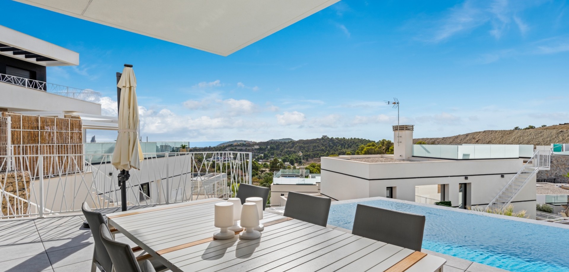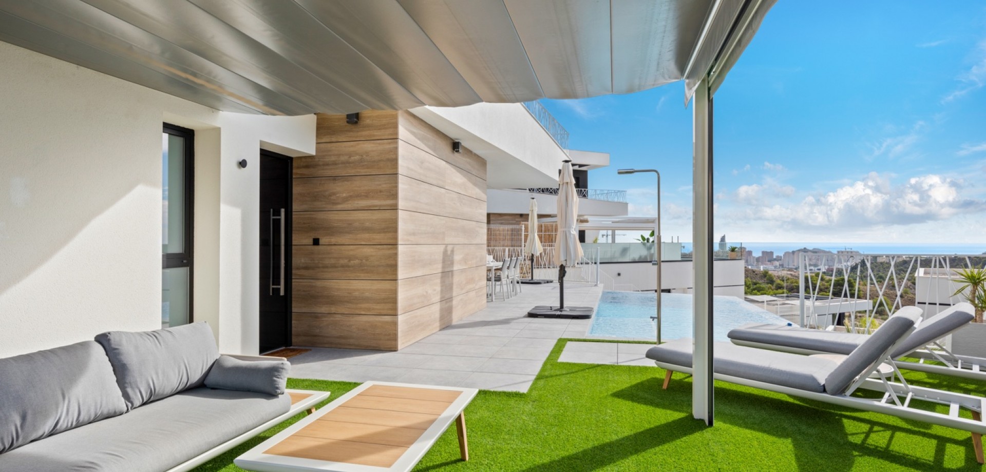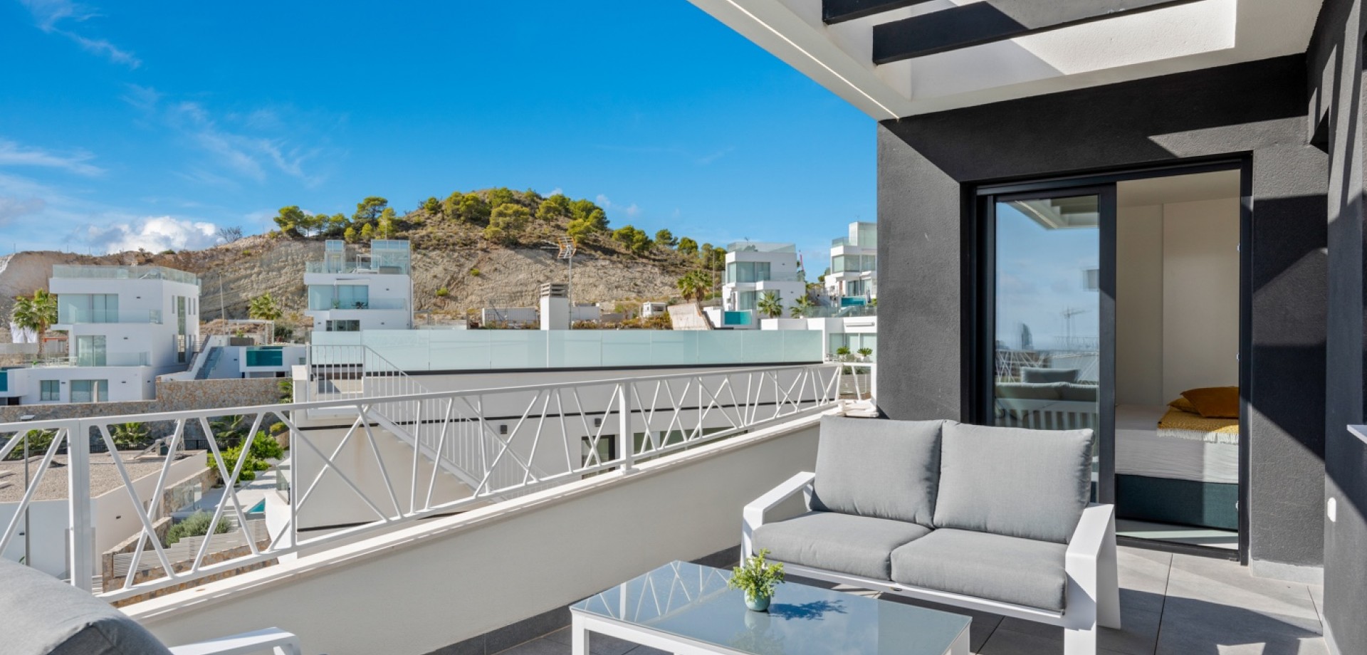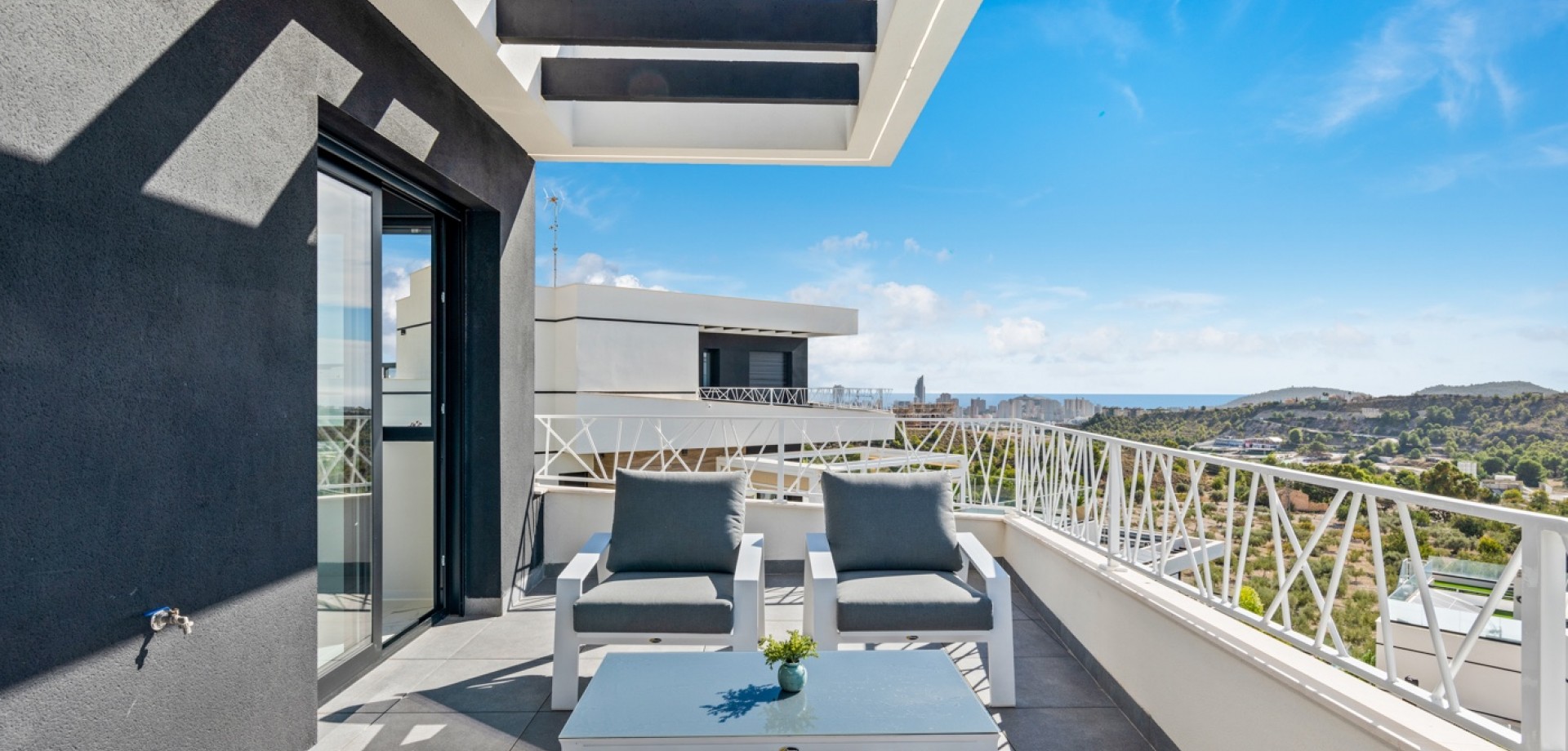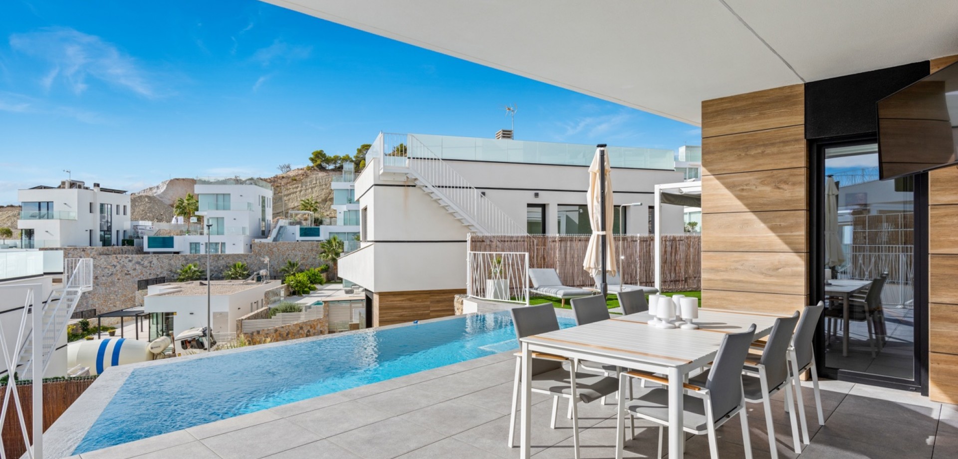 Komplett möblierte, moderne Villa in Finestrat mit spektakulärem Blick über die Skyline von Benidorm Hoch oben im prestigeträchtigen Stadtteil Finestrat gelegen, bietet diese wunderschöne, komplett eingerichtete Villa einen atemberaubenden Blick auf die berühmte Skyline von Benidorm und das glitzernde Mittelmeer. Das Haus wurde im Hinblick auf luxuriöses Wohnen konzipiert und verfügt über 3 geräumige Schlafzimmer und 3 moderne Badezimmer, was es perfekt für Familien oder Gäste macht. Die Villa verfügt über einen geräumigen, offenen Wohnraum, der Innen- und Außenbereiche nahtlos miteinander verbindet. Betreten Sie Ihren privaten Rückzugsort: einen kristallklaren Swimmingpool mit einem ruhigen Ruhebereich und einer erfrischenden Außendusche, perfekt zum Sonnenbaden oder zum stilvollen Entspannen. In erhöhter Lage gelegen, vereint dieses Haus Privatsphäre und unvergleichliche Ausblicke und schafft ein Gefühl von Ruhe und Exklusivität. Das elegante Design wird durch hochwertige Oberflächen und den zusätzlichen Komfort einer vollständigen Möblierung ergänzt und sorgt so für ein reibungsloses Umzugserlebnis. Egal, ob Sie den Sonnenuntergang auf der Terrasse genießen oder mit Panoramablick speisen, diese Villa verkörpert das Beste des mediterranen Lebens – perfekt, um das ganze Jahr über zu genießen.