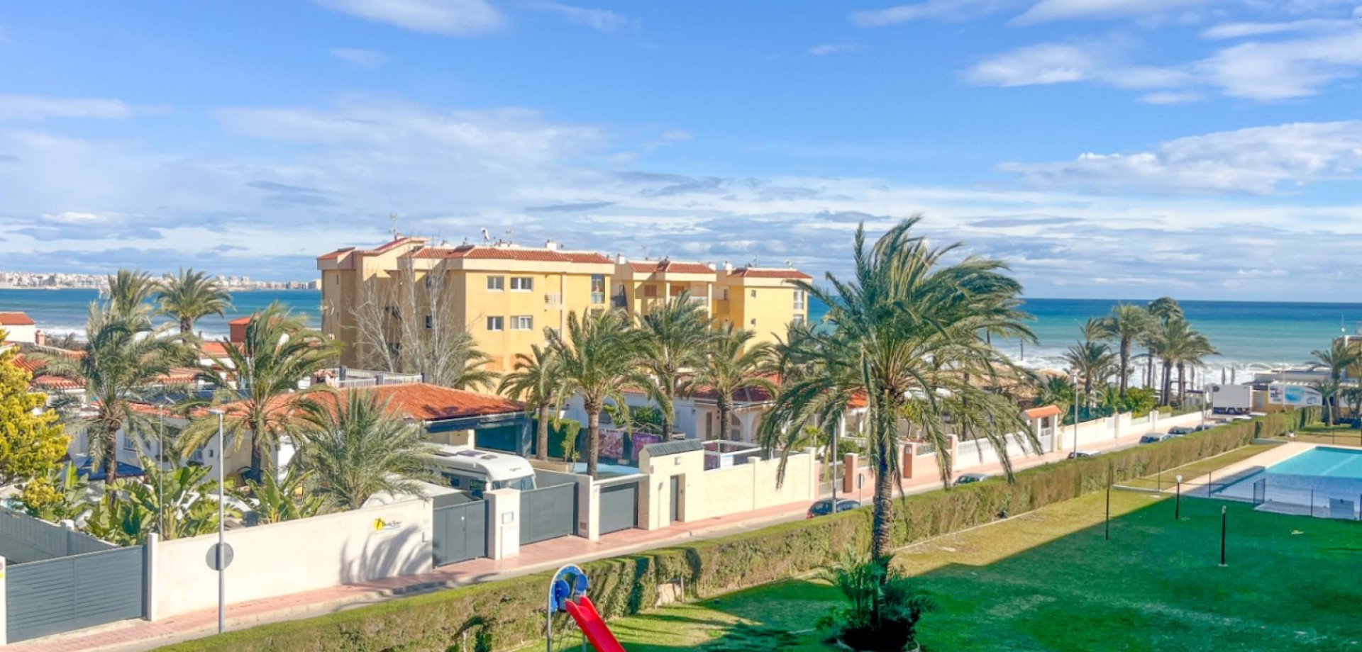 Diese aufgewertete Dreizimmerwohnung befindet sich im Edificio Nautilus II, einer der bekanntesten Küstenanlagen in Punta Prima, nur wenige Gehminuten vom Strand Cala Piteras und dem Restaurant Nautilus entfernt. Die Lage kombiniert den einfachen Zugang zur Uferpromenade mit praktischen Annehmlichkeiten für den Alltag — ein etabliertes Umfeld innerhalb der Orihuela Costa. Die Wohnung ist komplett möbliert und bezugsfertig. Im Inneren fühlt sich der Grundriss offen und ausgewogen an: Ein gemütlicher Wohn- und Essbereich verbindet sich mit einer modernen, komplett renovierten Küche, die über ein Insel-Design, qualitativ hochwertige integrierte Geräte und gut organisierte Stauräume verfügt. Es gibt insgesamt drei Schlafzimmer. Das Hauptschlafzimmer hat ein eigenes Badezimmer, während die anderen beiden ein zweites voll ausgestattetes Badezimmer teilen. Das Zuhause profitiert auch von einer zentralen Klimaanlage, die ganzjährig für Komfort sorgt. Weitere Höhepunkte sind eine geschlossene Tiefgarage, ein privater Solarium-Abstellraum und Meerblick von der Terrasse, die sowohl Bequemlichkeit als auch einen angenehmen Küstenblick bieten. Im Edificio Nautilus II genießen die Bewohner Zugang zu einem Gemeinschaftspool, der von gepflegten Landschaftsbereichen umgeben ist. Die Gemeinschaft ist sicher, gut gepflegt und wird nach hohen Standards verwaltet. Vom Gebäude aus ist der Strand Cala Piteras nur einen kurzen Spaziergang entfernt — vor Ort bekannt für seine ruhigen Gewässer und Küstenwege, die zur Frontpromenade von Torrevieja führen. Alltagsannehmlichkeiten wie Supermärkte, Cafés und öffentliche Verkehrsmittel sind in der Nähe, was es einfach macht, sich ohne Auto fortzubewegen. Die weitere Region Orihuela Costa ist gut angebunden. La Zenia Boulevard, mehrere bekannte Golfplätze wie Villamartín und Las Ramblas sowie zahlreiche Strände sind in kurzer Fahrzeit erreichbar. Sowohl der Flughafen Alicante (45 Minuten) als auch der Flughafen Murcia (35 Minuten) bieten das ganze Jahr über zuverlässigen Zugang für internationale Reisen.