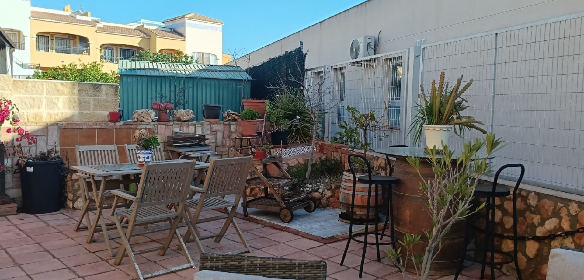 Charmante Erdgeschosswohnung in Los Montesinos, einem ruhigen und gut erreichbaren Viertel, ideal zum dauerhaften Wohnen oder für einen Urlaub an der Costa Blanca. Die Wohnung bietet 63 m² Wohnfläche und ein großzügiges, 167 m² großes Privatgrundstück, das in eine wunderschöne Gartenterrasse verwandelt wurde – perfekt für entspannte Stunden im Freien. Hier finden Sie einen schönen Grillplatz mit Bar, verschiedene Sitzgelegenheiten und üppiges Grün. Gleich beim Betreten der Wohnung gelangen Sie auf eine einladende Veranda, ideal für ein Frühstück im Freien oder zum Entspannen. Die Veranda ist geschlossen und somit ganzjährig nutzbar. Im Inneren der Wohnung befinden sich zwei helle Schlafzimmer, jeweils mit Einbauschränken, und ein kürzlich renoviertes Badezimmer. Die separate Küche bietet einen komfortablen und funktionalen Raum, ist komplett ausgestattet und verfügt über einen praktischen Hauswirtschaftsraum mit Waschmaschine und Trockner. Die Wohnung ist im Wohnzimmer mit einer Klimaanlage ausgestattet, die ganzjährigen Komfort gewährleistet. Die jetzigen Eigentümer haben zahlreiche Verbesserungen vorgenommen, darunter neue Fußböden, mediterrane Fliesen an den Wänden, ein neues Badezimmer und vieles mehr. Dank seiner Südlage ist die Wohnung den ganzen Tag über lichtdurchflutet und bietet eine warme, einladende Atmosphäre. Sie ist bezugsfertig und wird unmöbliert angeboten, sodass Sie sie ganz nach Ihrem Geschmack einrichten können. Die Immobilie befindet sich in einer gepflegten Wohnanlage mit Gemeinschaftspool – ideal zum Abkühlen in den Sommermonaten. Ein privater, schattiger Parkplatz, ein Abstellraum und eine verstärkte Sicherheitstür sorgen für zusätzlichen Komfort und Sicherheit. Die Lage ist hervorragend:Nur 15 Minuten zu den Stränden40 Minuten zum Flughafen3 Minuten zu Freizeiteinrichtungen, Geschäften und anderen Annehmlichkeiten10 Minuten zu Golfplätzen Eine Immobilie mit großem Potenzial, außergewöhnlichen Außenbereichen und strategischer Lage – ideal als Hauptwohnsitz, Zweitwohnsitz oder Kapitalanlage.