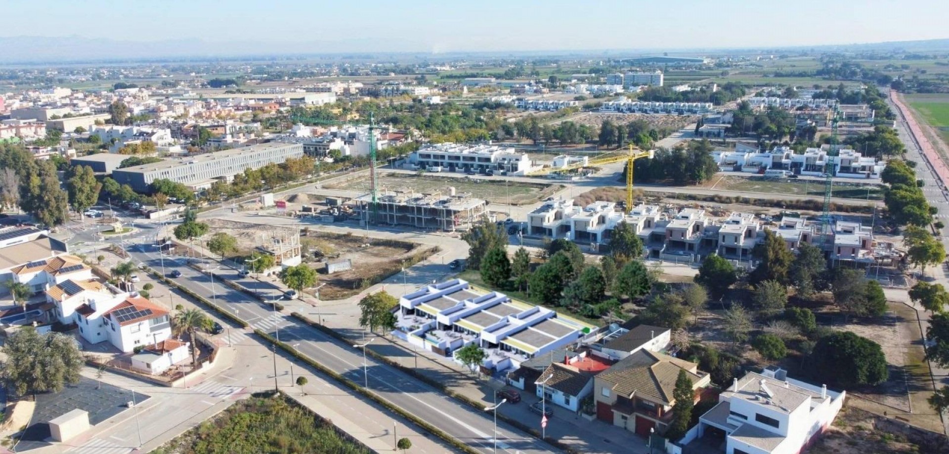 Neubau-Reihenhäuser im Ibiza-Stil in Dolores an der Costa Blanca Exklusive Wohnvillen in ruhiger Lage Diese Boutique-Wohnanlage besteht aus nur 6 neu gebauten Reihenhäusern mit eleganter Architektur im Ibiza-Stil und befindet sich in der charmanten Stadt Dolores im Süden der Provinz Alicante. Diese Häuser liegen in einem neuen Erweiterungsgebiet in der Nähe des Stadtzentrums und bieten eine ruhige Wohnumgebung, während lokale Dienstleistungen wie Geschäfte, Restaurants, Supermärkte und medizinische Einrichtungen zu Fuß erreichbar sind. Dolores ist umgeben von der fruchtbaren Landschaft der Vega Baja, die für ihre entspannte Atmosphäre und ihre ausgezeichnete Lebensqualität bekannt ist. Ebenerdiges Design mit großzügigen Außenbereichen Jede Villa ist ebenerdig gestaltet, um maximalen Komfort und Barrierefreiheit zu bieten. Die Innenausstattung umfasst eine offene Küche, die mit einem hellen Wohn- und Essbereich verbunden ist, drei geräumige Schlafzimmer und zwei moderne Badezimmer. Im Außenbereich verfügt jede Immobilie über ein privates Grundstück mit Terrasse, Landschaftsgarten, privatem Swimmingpool und einem Parkplatz auf dem Grundstück (außer 2 Einheiten). Ein Highlight dieser Häuser ist das großzügige private Solarium, das einen freien Blick auf die umliegende Landschaft bietet und den perfekten Ort darstellt, um das ganze Jahr über das mediterrane Klima zu genießen. Moderne Ausstattung und energieeffiziente Merkmale Diese neu gebauten Villen sind mit modernen Materialien und hochwertigen Oberflächen ausgestattet. Zur Ausstattung gehören elektrische Rollläden, ein komplettes Innen- und Außenbeleuchtungspaket sowie Badezimmer mit Möbeln, Spiegeln und Duschwänden. Die Warmwasserversorgung erfolgt über ein effizientes aerothermisches System, das die Energieeffizienz und Nachhaltigkeit verbessert. Die Häuser verfügen außerdem über eine Vorinstallation für eine Klimaanlage, sodass zukünftige Eigentümer das Klimasystem an ihre Bedürfnisse anpassen können. Gute Anbindung an Strände und Golfplätze Dolores genießt eine ausgezeichnete Lage mit guter Anbindung an die wichtigsten Küsten- und Freizeitgebiete der Costa Blanca. Die Sandstrände von Guardamar del Segura und Torrevieja sind etwa 12 km entfernt und bieten lange Promenaden, natürliche Dünen und eine Vielzahl von Strandaktivitäten. Mehrere bekannte Golfplätze wie La Finca, La Marquesa und Vistabella Golf befinden sich in einem Umkreis von 10 bis 15 km. Wasserparks und Freizeitattraktionen finden Sie in der Nähe in Rojales und Torrevieja. Wichtige Entfernungen und Sehenswürdigkeiten Die Strände von Guardamar und Torrevieja sind etwa 12 km entfernt. Der Flughafen Alicante ist etwa 30 km oder 25 Autominuten entfernt und bietet regelmäßige Verbindungen zu den wichtigsten europäischen Städten. Die Stadt Elche ist etwa 20 km entfernt, während das Stadtzentrum von Alicante etwa 35 km entfernt ist. Die nahe gelegenen Yachthäfen und Häfen in Guardamar und Torrevieja tragen zusätzlich zur Attraktivität des Lebensstils bei. Ihr mediterranes Zuhause erwartet Sie Diese exklusiven Stadthäuser im Ibiza-Stil in Dolores bieten modernes Wohnen, Privatsphäre und eine ausgezeichnete Lage in der Nähe von Stränden, Golfplätzen und Annehmlichkeiten. Kontaktieren Sie uns noch heute für weitere Informationen oder um eine Besichtigung zu vereinbaren und sich Ihr neues Zuhause an der Costa Blanca zu sichern.