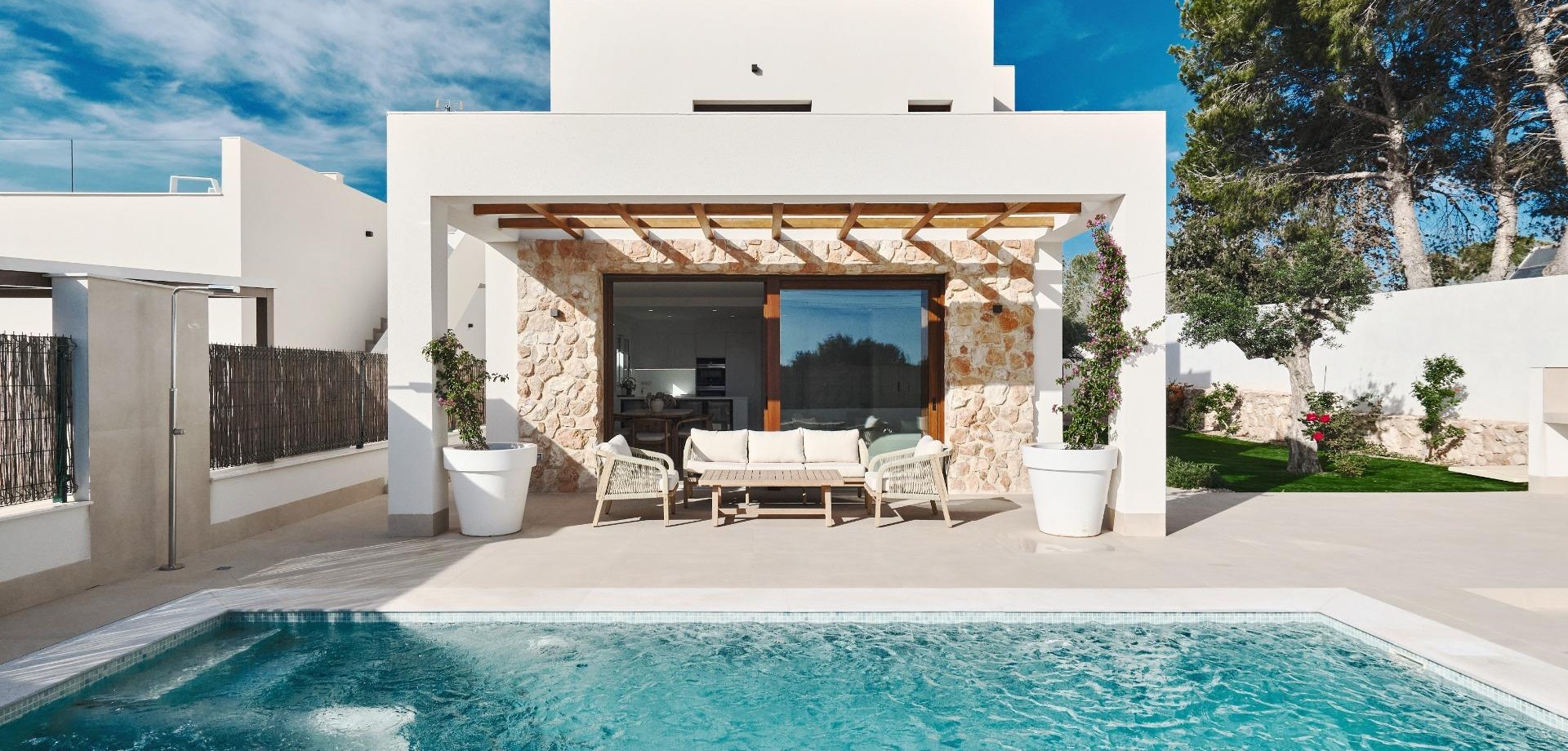 Exklusive Villa mit privatem Pool auf großzügigem Grundstück in Orihuela Costa~~In einer ruhigen Gegend von Orihuela Costa befindet sich dieses exklusive Projekt mit nur drei modernen Villen. Die Häuser verbinden klares Design, hochwertige Materialien und eine hervorragende Lage nahe dem Meer, Golfplätzen und allen Annehmlichkeiten.~~Diese Neubauvilla verfügt über drei Schlafzimmer, drei Badezimmer und ein Gäste-WC. Mit 140 m2 Wohnfläche auf einem 425 m2 großen Grundstück bietet sie viel Platz, Privatsphäre und natürliches Licht. Im Außenbereich finden Sie großzügige Terrassen, ein sonniges Solarium und einen wunderschönen privaten Garten mit Designer-Pool.~~Die Villa wird aus hochwertigen Materialien gebaut und ist inklusive Klimaanlage, Haushaltsgeräten sowie Innen- und Außenbeleuchtung ausgestattet. Solange die Villen noch off-plan verfügbar sind, können bestimmte Ausstattungen nach den Wünschen des Käufers angepasst werden.~~Die Strände La Zenia, Campoamor und Cabo Roig liegen in unmittelbarer Nähe, ebenso wie die beliebte La Zenia Boulevard mit zahlreichen Geschäften, Restaurants und Unterhaltungsmöglichkeiten.~~Eine moderne Villa, in der Raum, Privatsphäre und mediterranes Leben perfekt zusammenkommen.