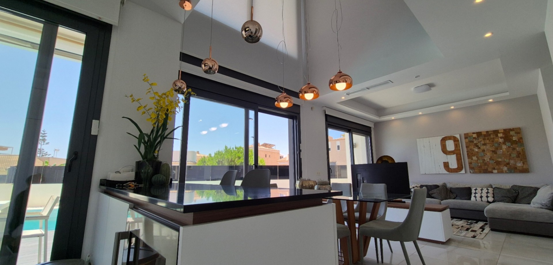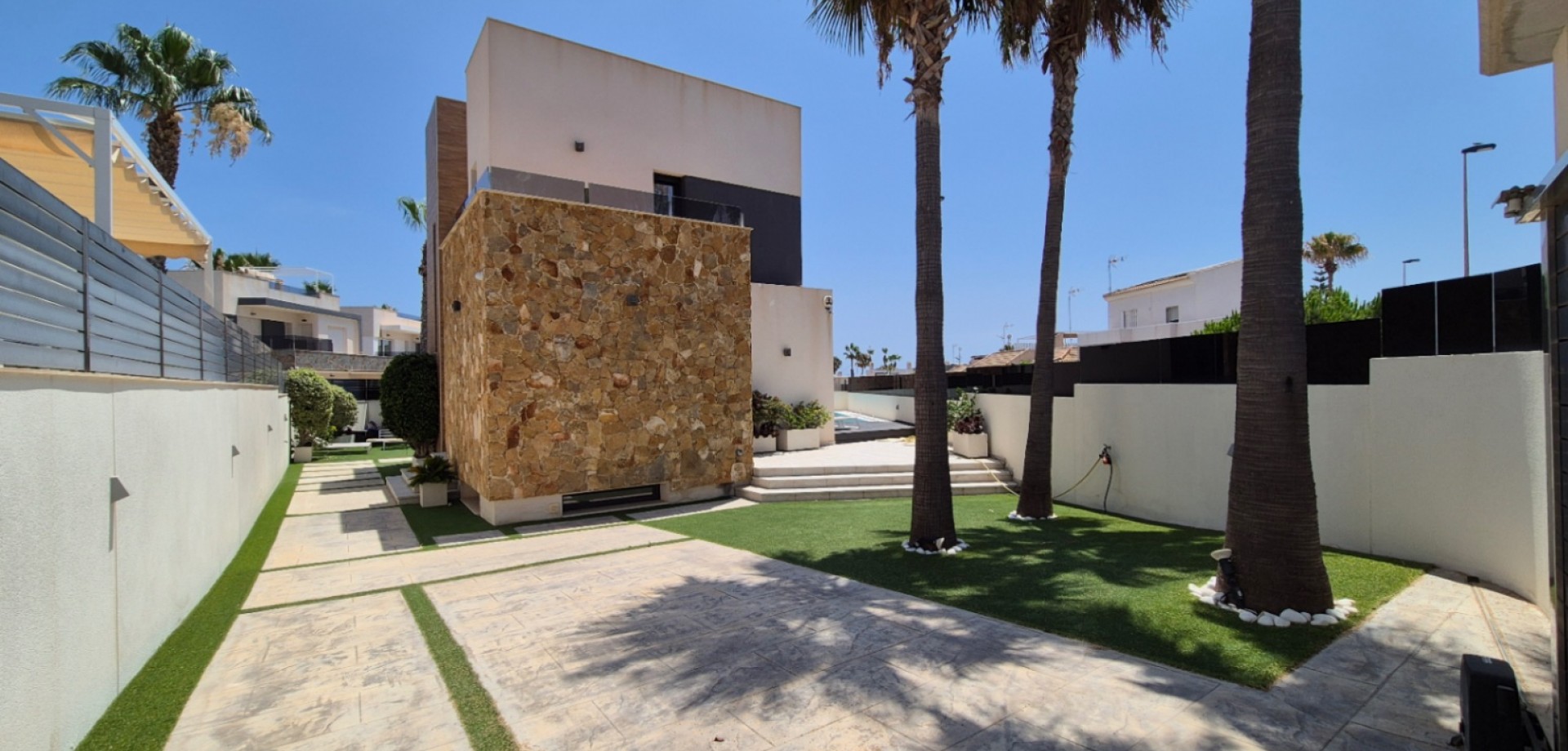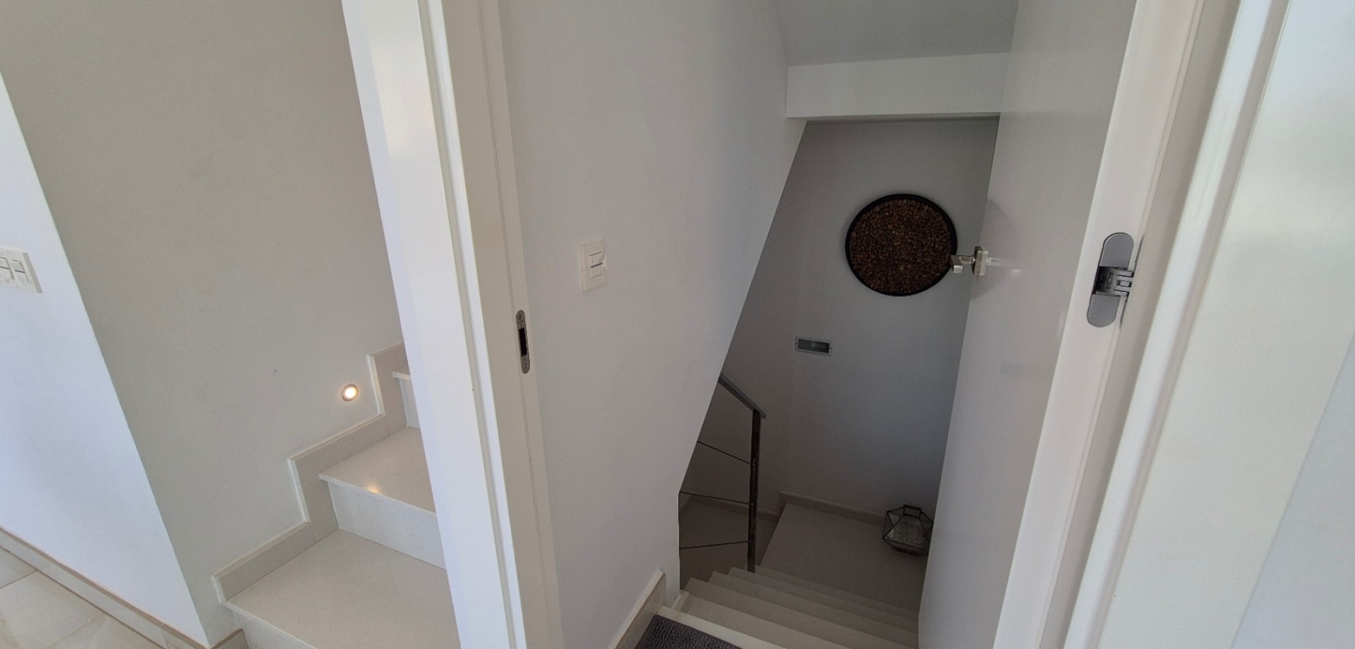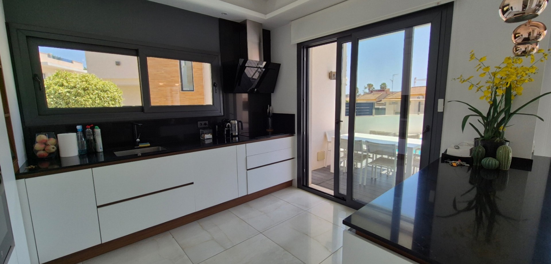 Moderne Villa mit privatem Schwimmbad und Parkplatz abseits der Straße. Diese Immobilie besteht im Erdgeschoss aus einem großen Wohn- und Essbereich, einer Küche, 1 Schlafzimmer und 1 Badezimmer. Im oberen Stockwerk befinden sich 2 weitere Schlafzimmer, jeweils mit eigenem Badezimmer, sowie eine Treppe, die zur Dachterrasse führt, von wo aus man einen Blick auf das Meer hat. Darüber hinaus gibt es einen großen Keller mit einem Unterhaltungsraum, 1 Schlafzimmer, 1 Badezimmer und einem Waschraum. Das perfekte Zuhause für dauerhaftes Wohnen oder als Ferienhaus, in der Nähe aller Annehmlichkeiten und nur 2 Minuten vom Strand entfernt.