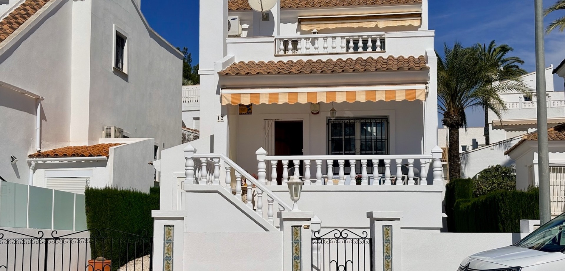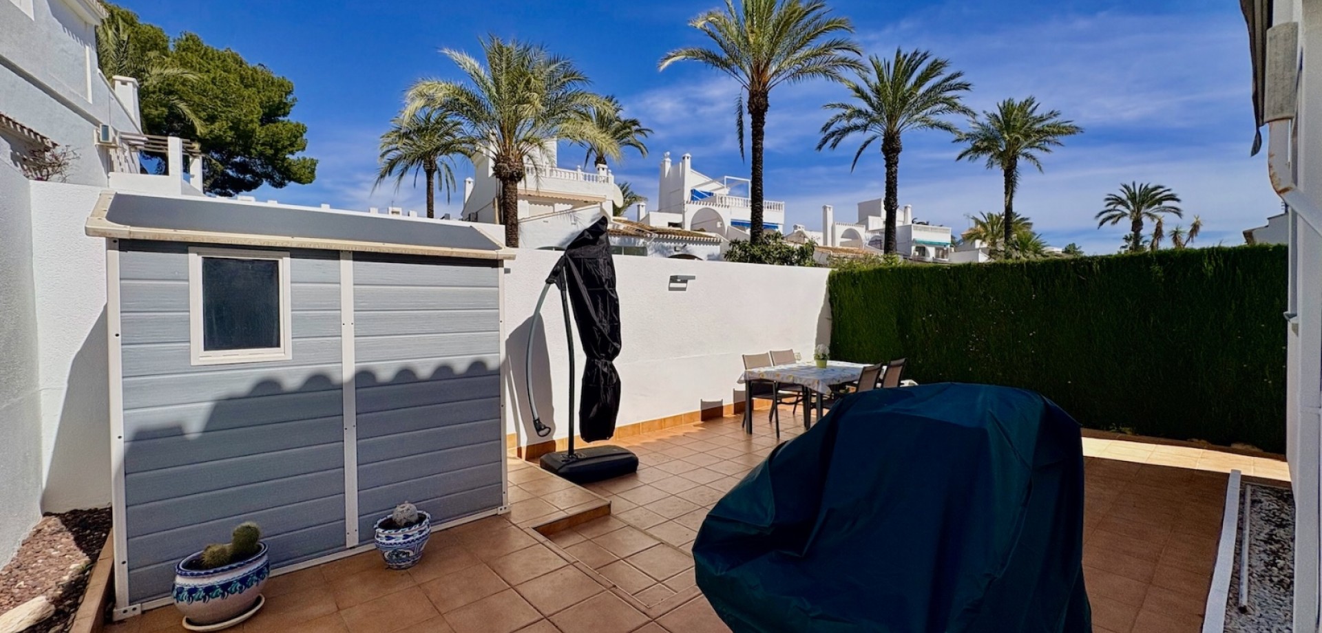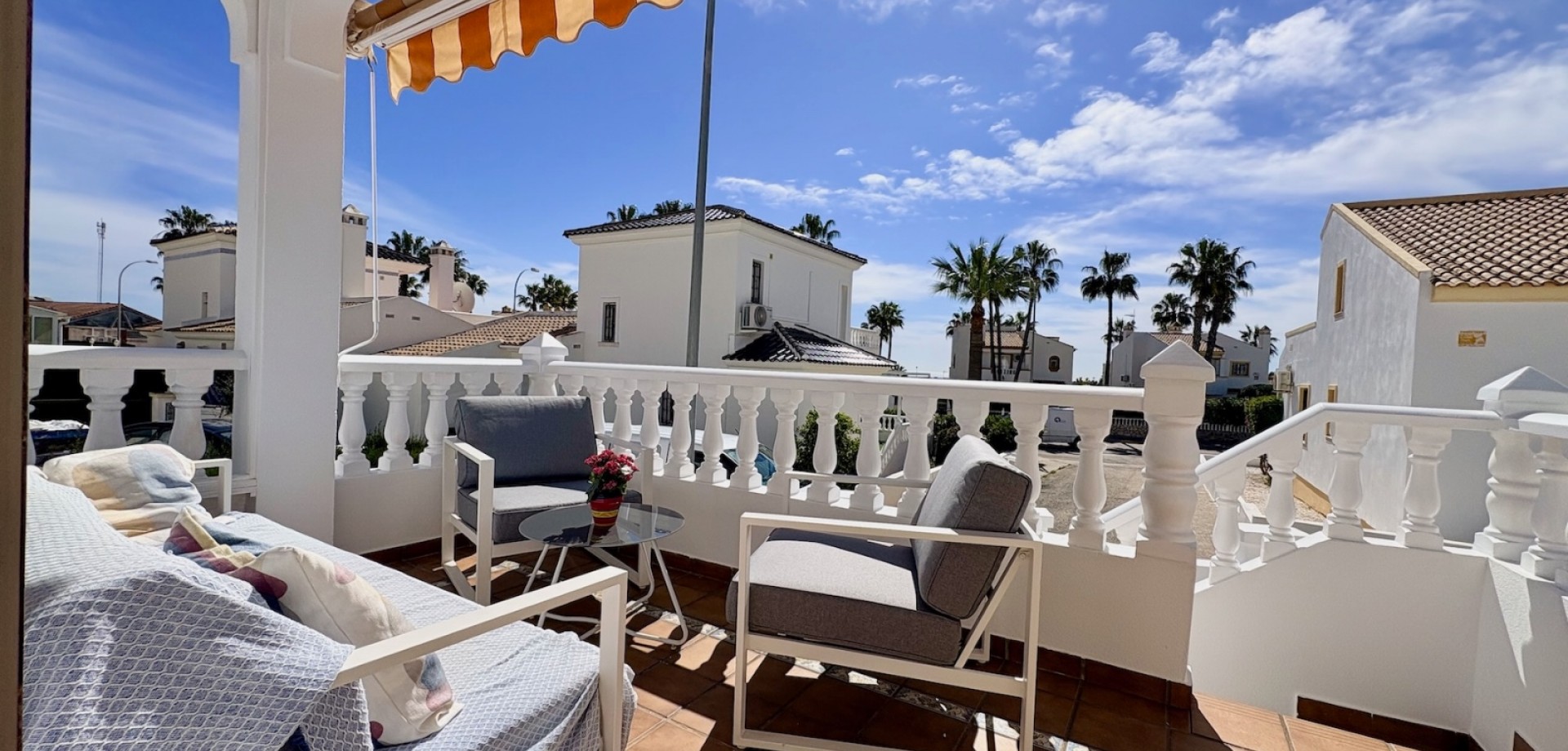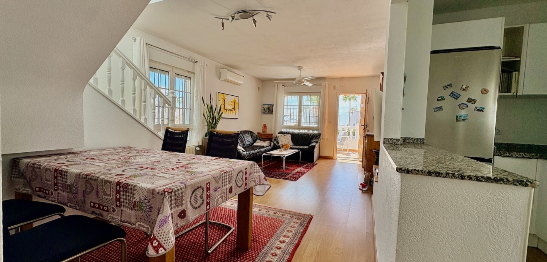 Entdecken Sie dieses charmante freistehende Einfamilienhaus Typ „Carmen“, gelegen in der exklusiven Wohnanlage „Rioja“ in der renommierten Gegend von Villamartín Golf, einer der gefragtesten Lagen in Orihuela-Costa. Die nach Süden ausgerichtete Immobilie besticht durch ihre Helligkeit und ihre hervorragende Raumaufteilung. Sie verfügt über eine gebaute Fläche von 102,75 m², verteilt auf Erdgeschoss und Dachgeschoss, und bietet komfortable sowie vielseitige Wohnbereiche. Im Erdgeschoss befinden sich zwei Schlafzimmer und ein komplettes Badezimmer sowie weitere funktionale Räume und der Zugang über eine Innentreppe zum Obergeschoss. Das Dachgeschoss umfasst ein drittes Schlafzimmer mit eigenem Bad en suite, ideal als privater Bereich, Hauptschlafzimmer oder Gästebereich. Im Außenbereich bietet die Immobilie alles, um das mediterrane Klima zu genießen: eine Terrasse, einen großzügigen privaten Garten von über 140 m² sowie ein herrliches Solarium, das sich perfekt zum Entspannen und Sonnenbaden eignet. Von der Immobilie aus kann man den Mittelmeer am Horizont sehen, was dem Objekt einen besonderen Mehrwert verleiht. Die Immobilie wird vollständig möbliert und mit Elektrogeräten ausgestattet verkauft und ist somit bezugsfertig. Zudem verfügt sie über eine zentrale Gasheizung sowie Klimaanlagen auf beiden Etagen, was ganzjährigen Komfort garantiert. Die Wohnanlage bietet außerdem einen Gemeinschaftspool, ideal zur Erholung mit der Familie. Die Lage ist unschlagbar: In weniger als 5 Minuten erreichen Sie zahlreiche Dienstleistungen wie Restaurants, Bars und Supermärkte. Für Golfliebhaber stehen mehrere Golfplätze in der Nähe zur Verfügung, darunter der bekannte Campo de Golf Villamartín. Die wunderschönen Strände der Costa Blanca sind in weniger als 10 Minuten mit dem Auto erreichbar. Das Leben in Villamartín bedeutet Sonne, Ruhe, hochwertige Dienstleistungen und ein internationales Umfeld das ganze Jahr über. In unmittelbarer Nähe befindet sich zudem das beliebte Einkaufszentrum La Zenia Boulevard mit einem breiten Angebot an Freizeit, Shopping und Gastronomie. Eine ideale Gelegenheit sowohl als Hauptwohnsitz, Ferienimmobilie als auch als renditestarke Investition.