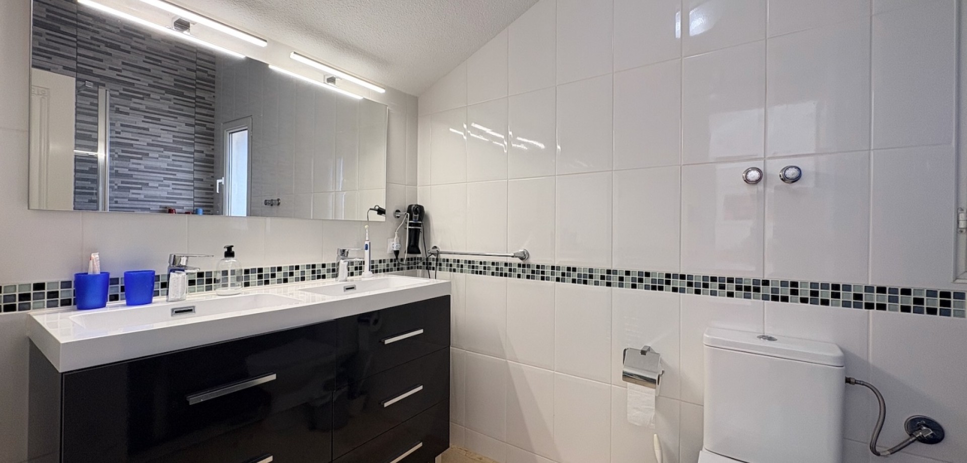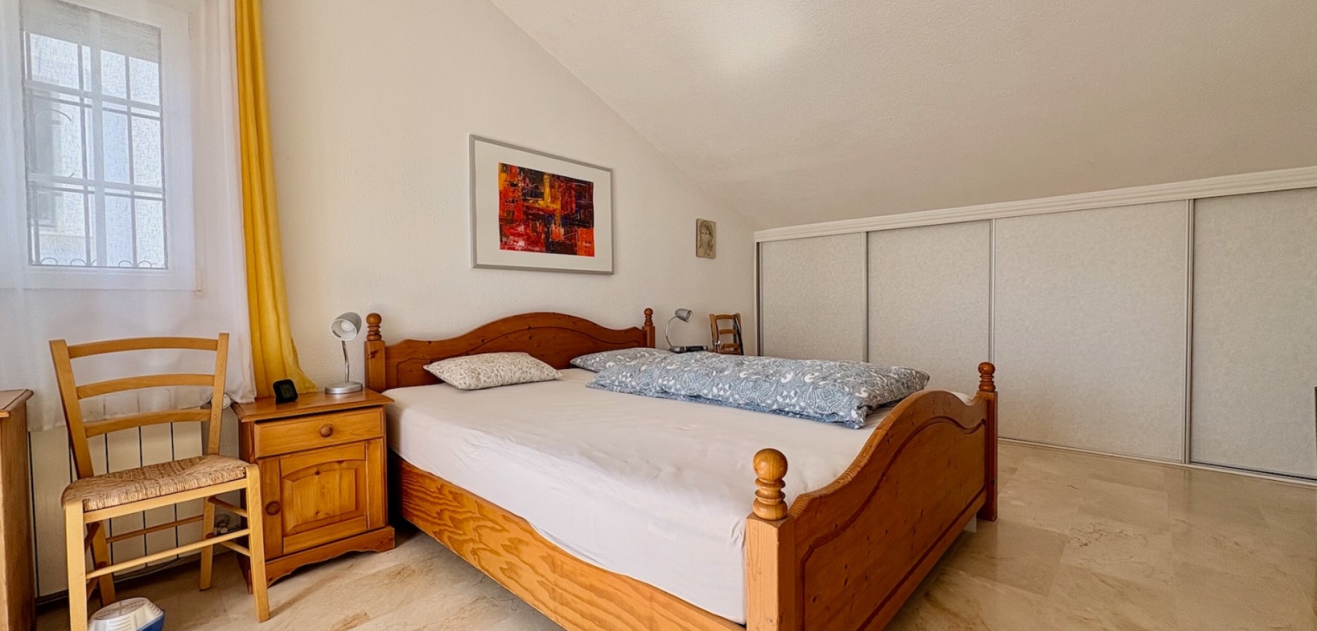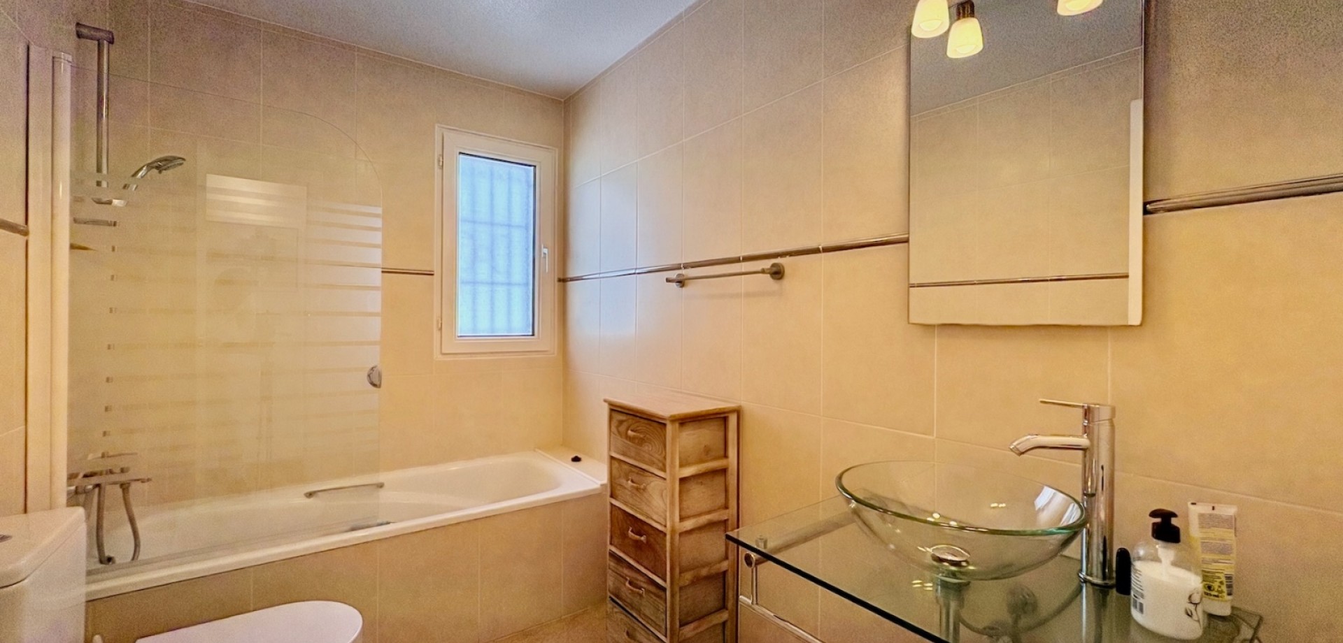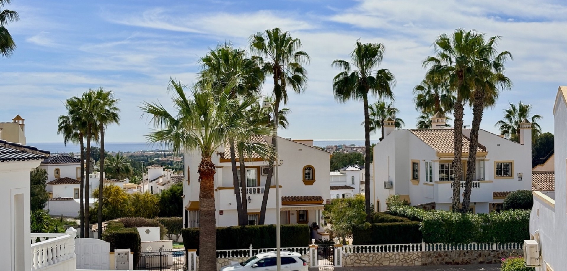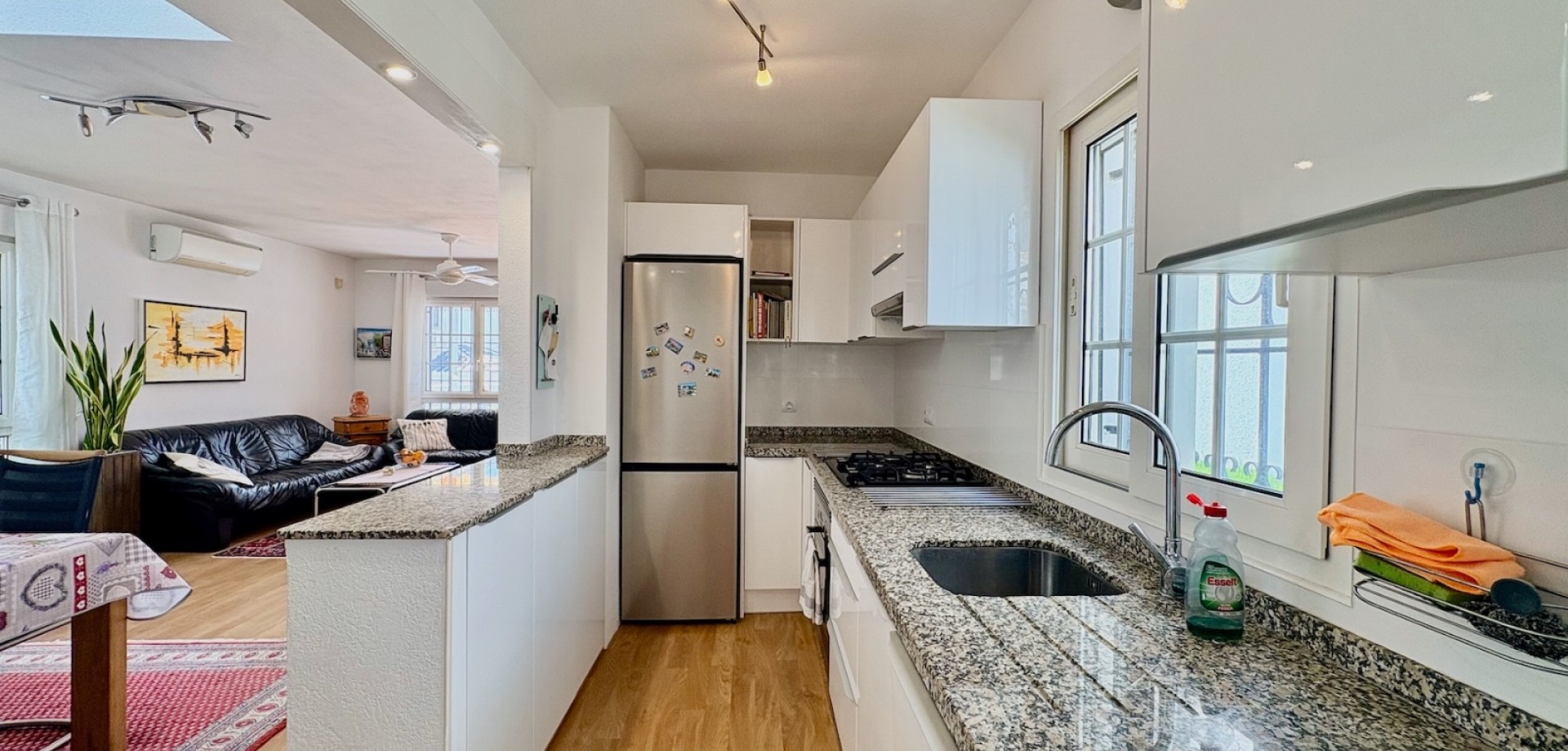 Entdecken Sie dieses charmante freistehende Einfamilienhaus Typ „Carmen“, gelegen in der exklusiven Wohnanlage „Rioja“ in der renommierten Gegend von Villamartín Golf, einer der gefragtesten Lagen in Orihuela-Costa. Die nach Süden ausgerichtete Immobilie besticht durch ihre Helligkeit und ihre hervorragende Raumaufteilung. Sie verfügt über eine gebaute Fläche von 102,75 m², verteilt auf Erdgeschoss und Dachgeschoss, und bietet komfortable sowie vielseitige Wohnbereiche. Im Erdgeschoss befinden sich zwei Schlafzimmer und ein komplettes Badezimmer sowie weitere funktionale Räume und der Zugang über eine Innentreppe zum Obergeschoss. Das Dachgeschoss umfasst ein drittes Schlafzimmer mit eigenem Bad en suite, ideal als privater Bereich, Hauptschlafzimmer oder Gästebereich. Im Außenbereich bietet die Immobilie alles, um das mediterrane Klima zu genießen: eine Terrasse, einen großzügigen privaten Garten von über 140 m² sowie ein herrliches Solarium, das sich perfekt zum Entspannen und Sonnenbaden eignet. Von der Immobilie aus kann man den Mittelmeer am Horizont sehen, was dem Objekt einen besonderen Mehrwert verleiht. Die Immobilie wird vollständig möbliert und mit Elektrogeräten ausgestattet verkauft und ist somit bezugsfertig. Zudem verfügt sie über eine zentrale Gasheizung sowie Klimaanlagen auf beiden Etagen, was ganzjährigen Komfort garantiert. Die Wohnanlage bietet außerdem einen Gemeinschaftspool, ideal zur Erholung mit der Familie. Die Lage ist unschlagbar: In weniger als 5 Minuten erreichen Sie zahlreiche Dienstleistungen wie Restaurants, Bars und Supermärkte. Für Golfliebhaber stehen mehrere Golfplätze in der Nähe zur Verfügung, darunter der bekannte Campo de Golf Villamartín. Die wunderschönen Strände der Costa Blanca sind in weniger als 10 Minuten mit dem Auto erreichbar. Das Leben in Villamartín bedeutet Sonne, Ruhe, hochwertige Dienstleistungen und ein internationales Umfeld das ganze Jahr über. In unmittelbarer Nähe befindet sich zudem das beliebte Einkaufszentrum La Zenia Boulevard mit einem breiten Angebot an Freizeit, Shopping und Gastronomie. Eine ideale Gelegenheit sowohl als Hauptwohnsitz, Ferienimmobilie als auch als renditestarke Investition.
