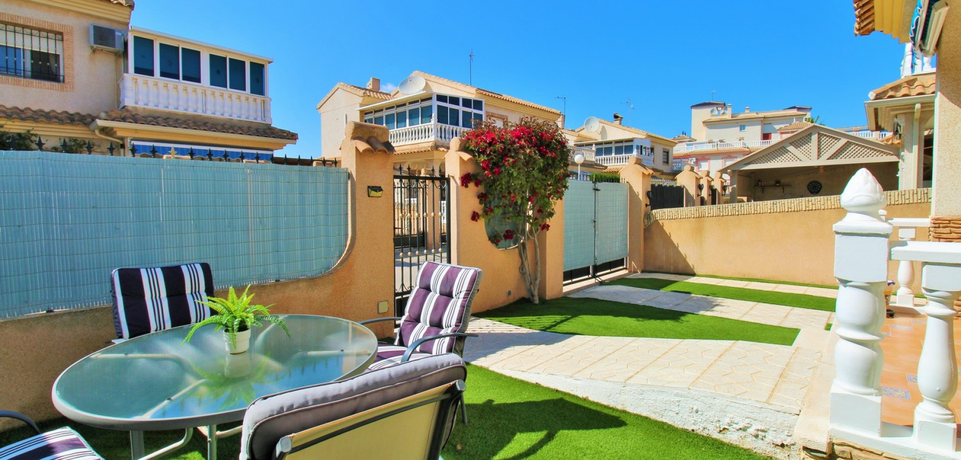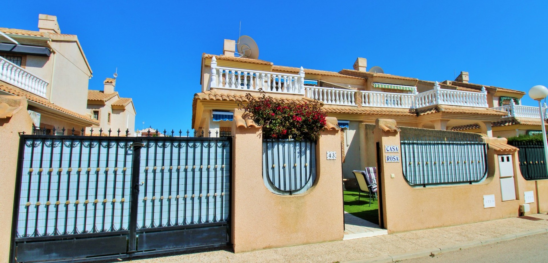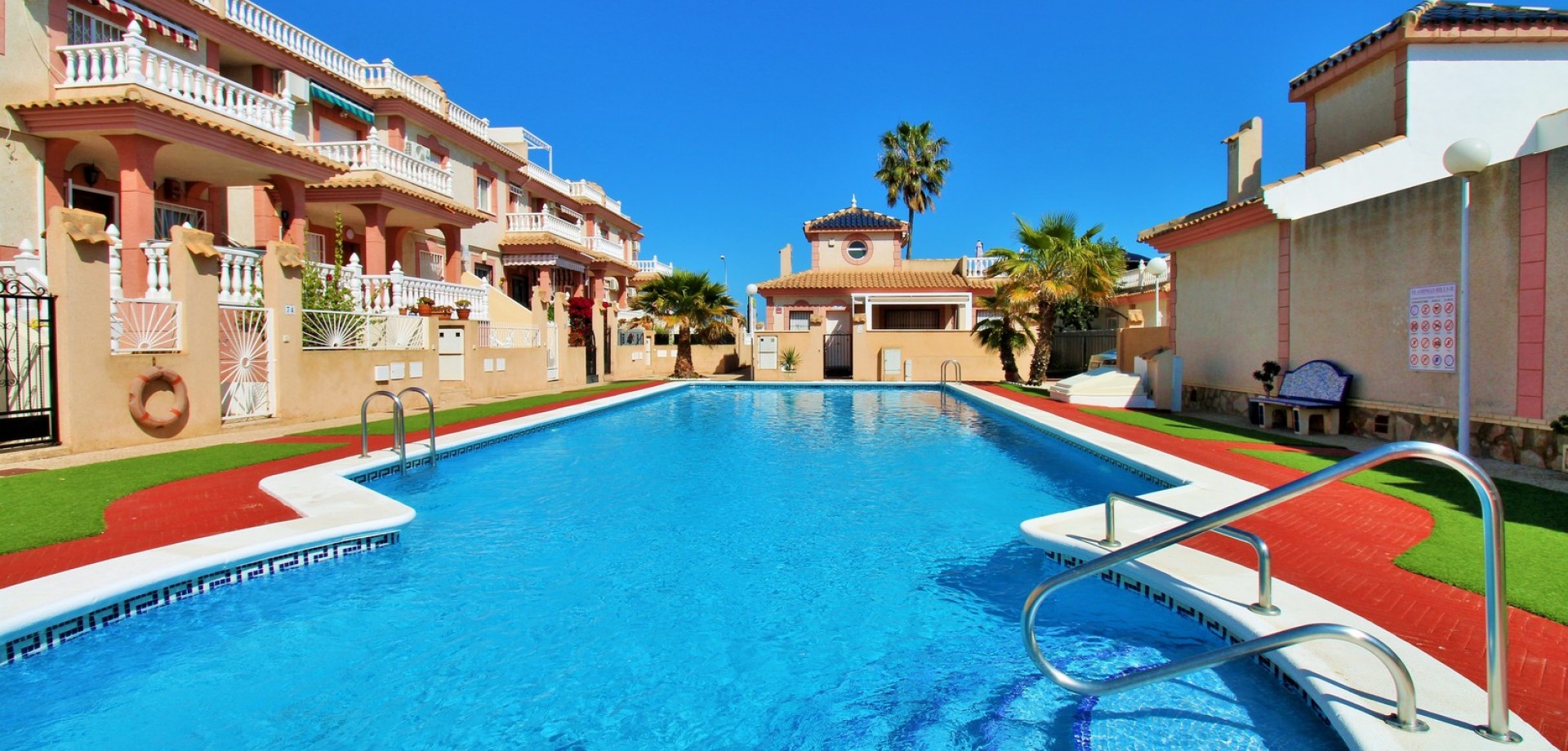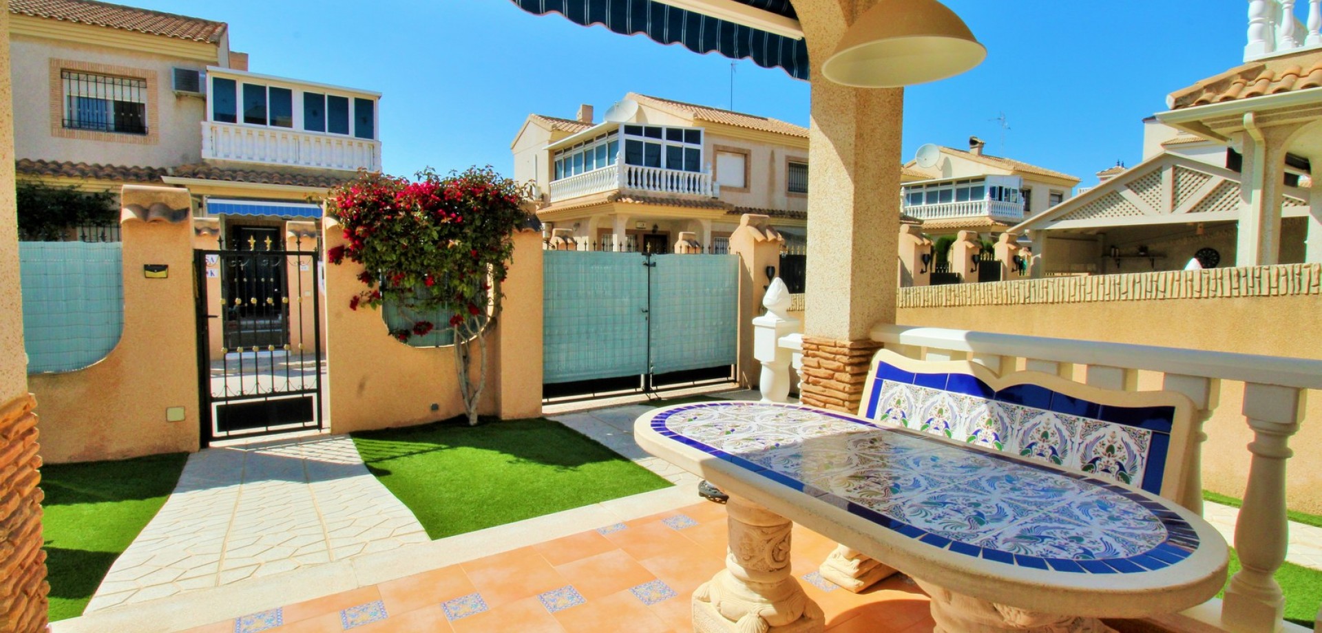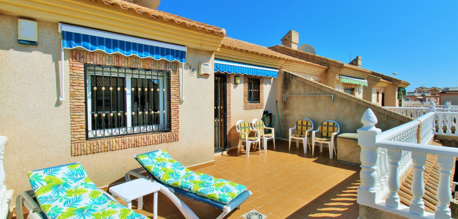 Diese gepflegte Doppelhaushälfte mit 3 Schlafzimmern und 2 Bädern befindet sich in der beliebten Wohnanlage Flamingo Hills II in Playa Flamenca und bietet großzügige Außenbereiche, eine praktische Raumaufteilung sowie eine hervorragende Lage in fußläufiger Entfernung zu allen Annehmlichkeiten. Die Immobilie liegt an einer ruhigen, privaten Gemeinschaftsstraße und ist nur wenige Gehminuten von Restaurants, Bars, Supermärkten und dem bekannten Einkaufszentrum Zenia Boulevard entfernt. Das Haus verfügt über einen privaten Garten mit Einfahrt, ideal zum Parken oder Entspannen, sowie über eine überdachte Terrasse. Im Inneren finden Sie ein helles Wohn- und Esszimmer, eine separate Küche, die teilweise modernisiert wurde, ein Schlafzimmer im Erdgeschoss mit Einbauschränken sowie ein Badezimmer mit ebenerdiger Dusche. Zusätzlich gibt es einen praktischen Abstellraum unter der Treppe. Im Obergeschoss befinden sich zwei weitere Schlafzimmer, ein zweites Badezimmer sowie der Zugang zu einer großen privaten Dachterrasse (Solarium), ideal zum Sonnenbaden oder für gesellige Abende. Die Immobilie gehört zu einer gepflegten Anlage mit Zugang zu einem schönen Gemeinschaftspool. Wird möbliert inklusive Elektrogeräten verkauft und eignet sich ideal als Hauptwohnsitz oder Ferienimmobilie.