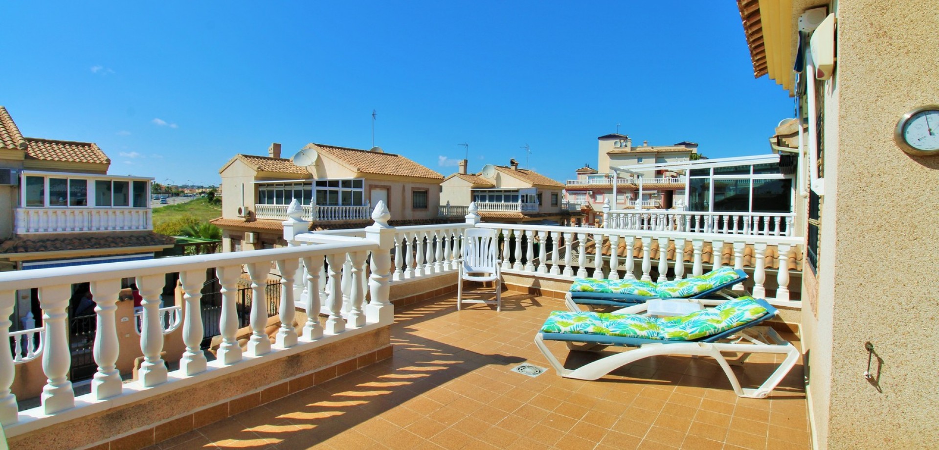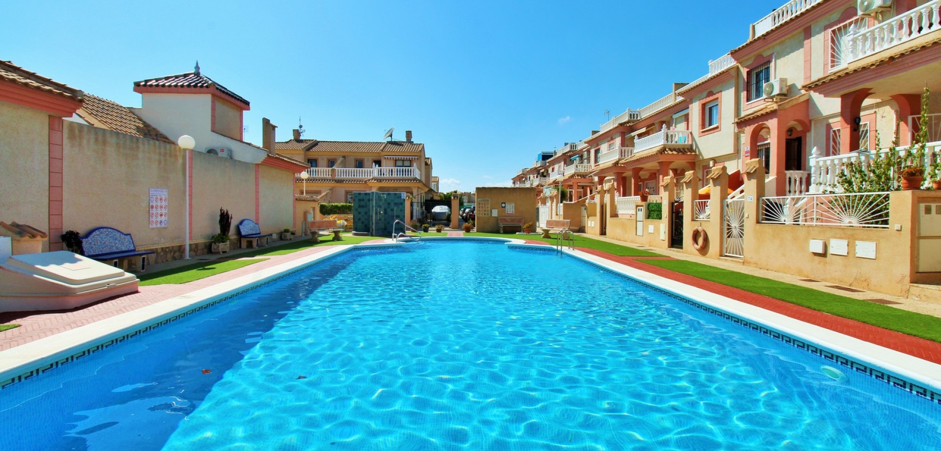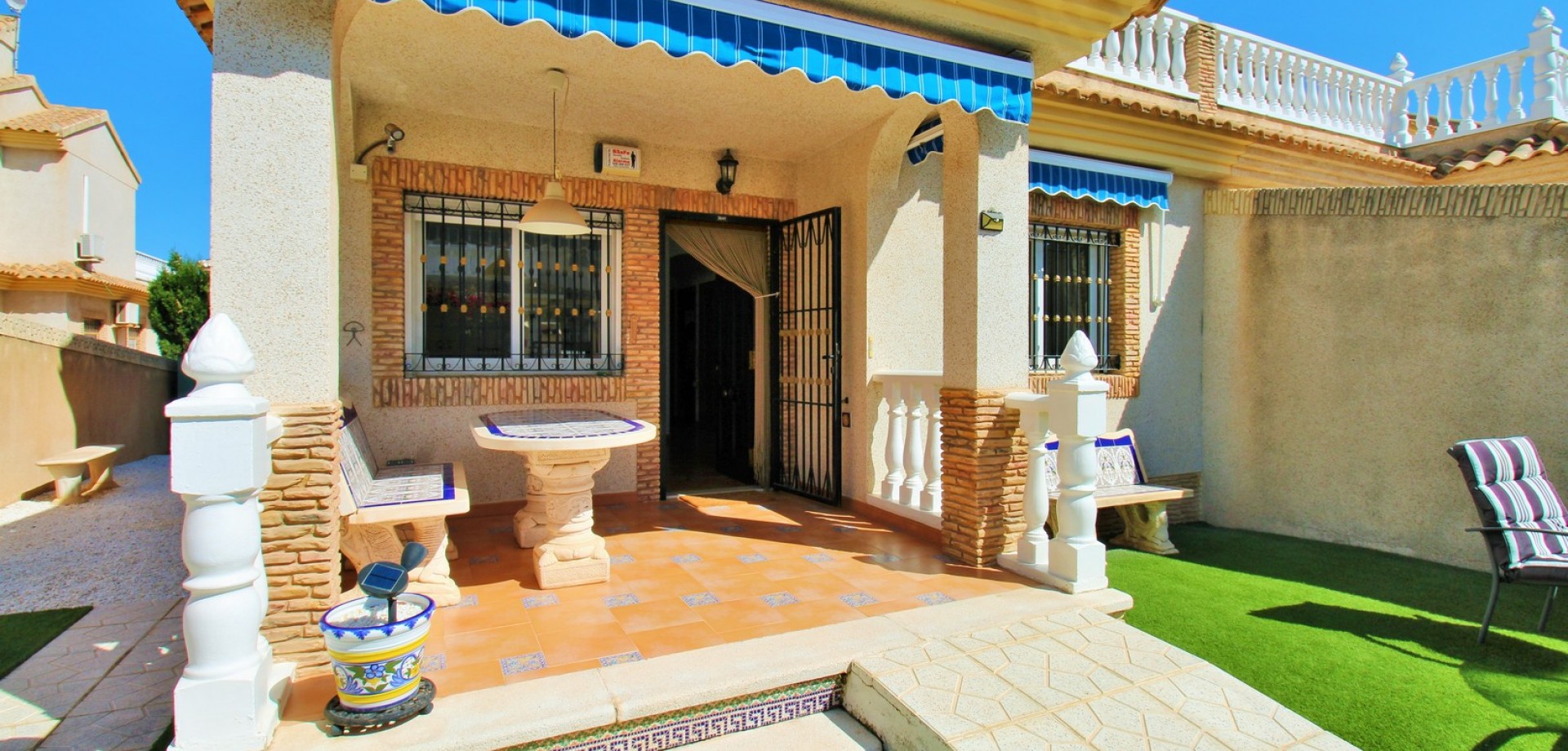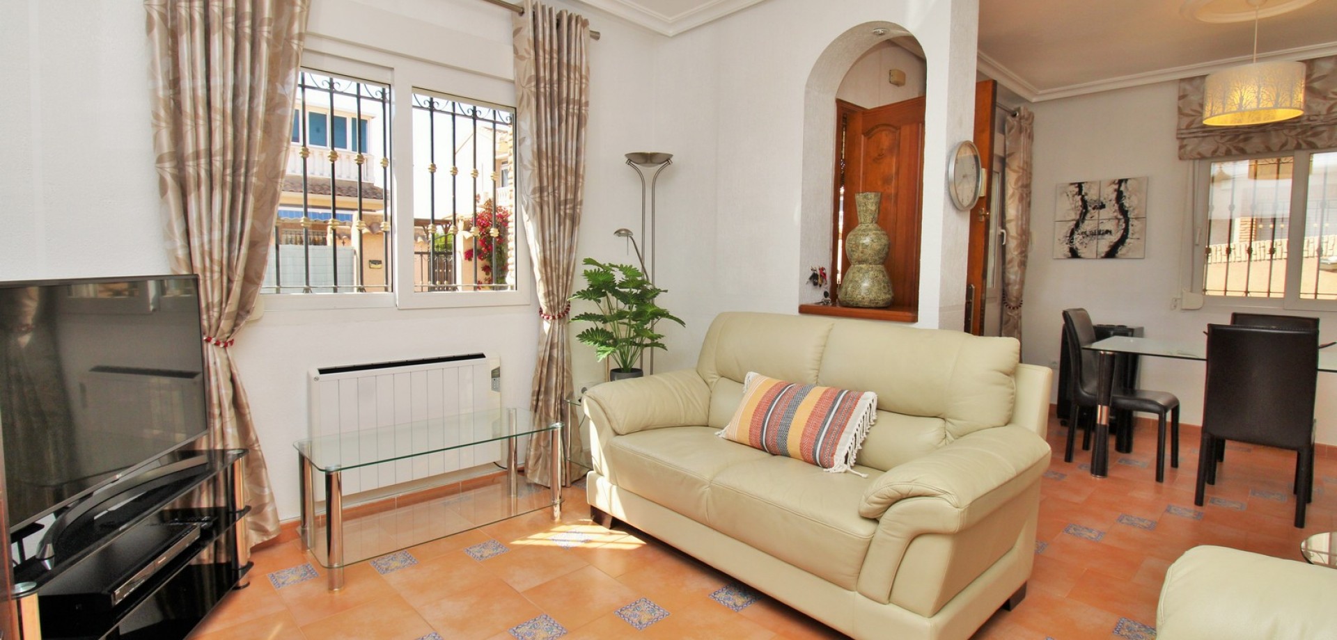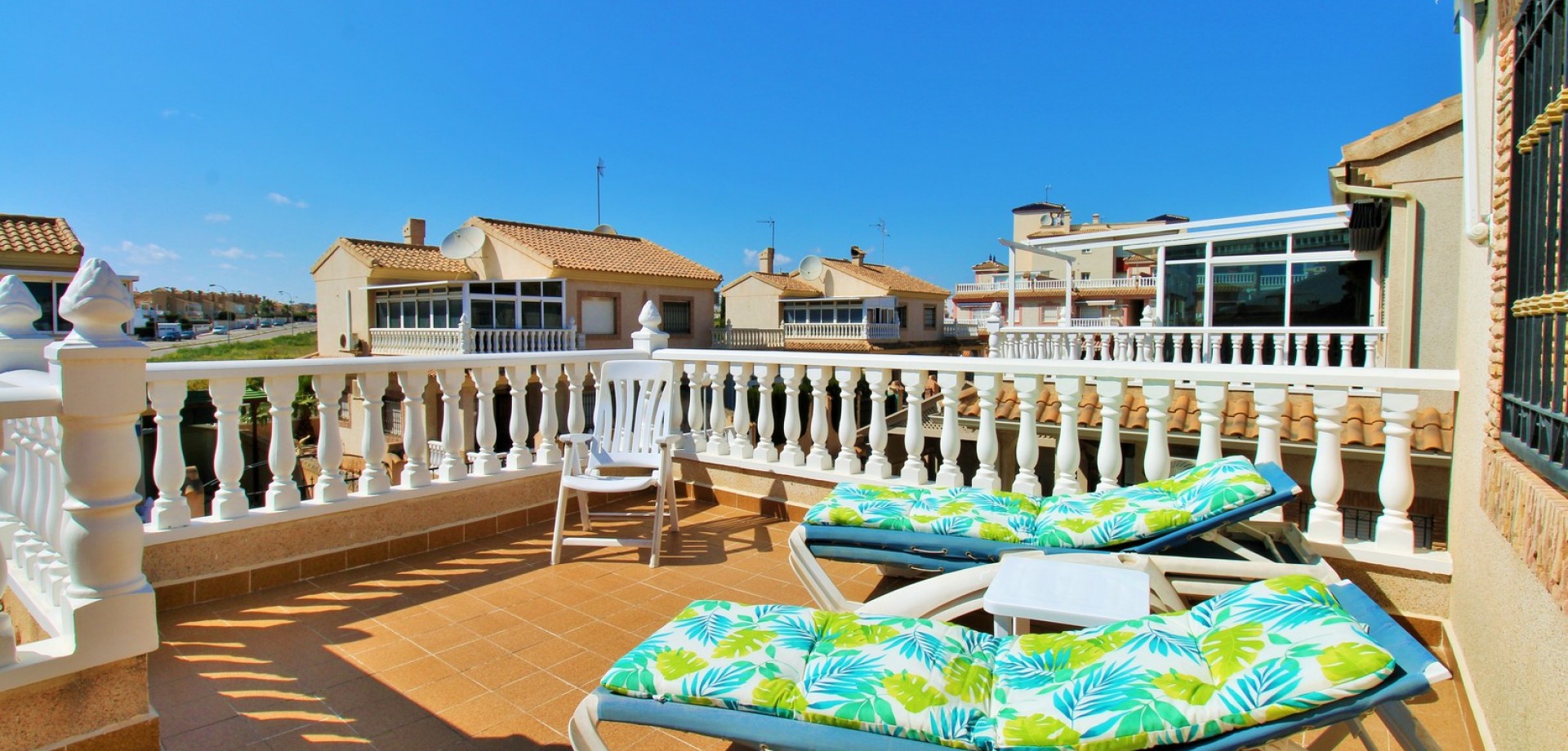 Diese gepflegte Doppelhaushälfte mit 3 Schlafzimmern und 2 Bädern befindet sich in der beliebten Wohnanlage Flamingo Hills II in Playa Flamenca und bietet großzügige Außenbereiche, eine praktische Raumaufteilung sowie eine hervorragende Lage in fußläufiger Entfernung zu allen Annehmlichkeiten. Die Immobilie liegt an einer ruhigen, privaten Gemeinschaftsstraße und ist nur wenige Gehminuten von Restaurants, Bars, Supermärkten und dem bekannten Einkaufszentrum Zenia Boulevard entfernt. Das Haus verfügt über einen privaten Garten mit Einfahrt, ideal zum Parken oder Entspannen, sowie über eine überdachte Terrasse. Im Inneren finden Sie ein helles Wohn- und Esszimmer, eine separate Küche, die teilweise modernisiert wurde, ein Schlafzimmer im Erdgeschoss mit Einbauschränken sowie ein Badezimmer mit ebenerdiger Dusche. Zusätzlich gibt es einen praktischen Abstellraum unter der Treppe. Im Obergeschoss befinden sich zwei weitere Schlafzimmer, ein zweites Badezimmer sowie der Zugang zu einer großen privaten Dachterrasse (Solarium), ideal zum Sonnenbaden oder für gesellige Abende. Die Immobilie gehört zu einer gepflegten Anlage mit Zugang zu einem schönen Gemeinschaftspool. Wird möbliert inklusive Elektrogeräten verkauft und eignet sich ideal als Hauptwohnsitz oder Ferienimmobilie.