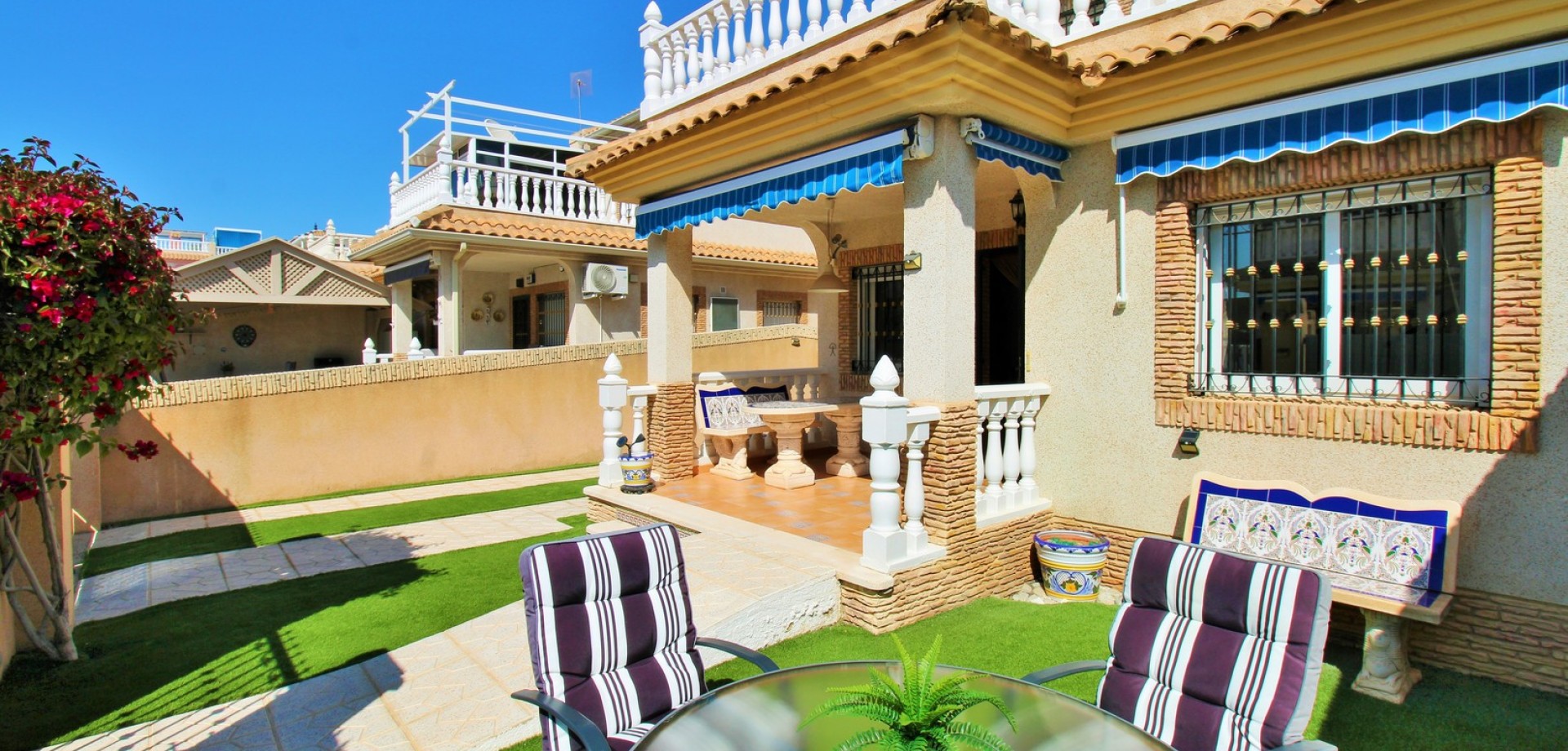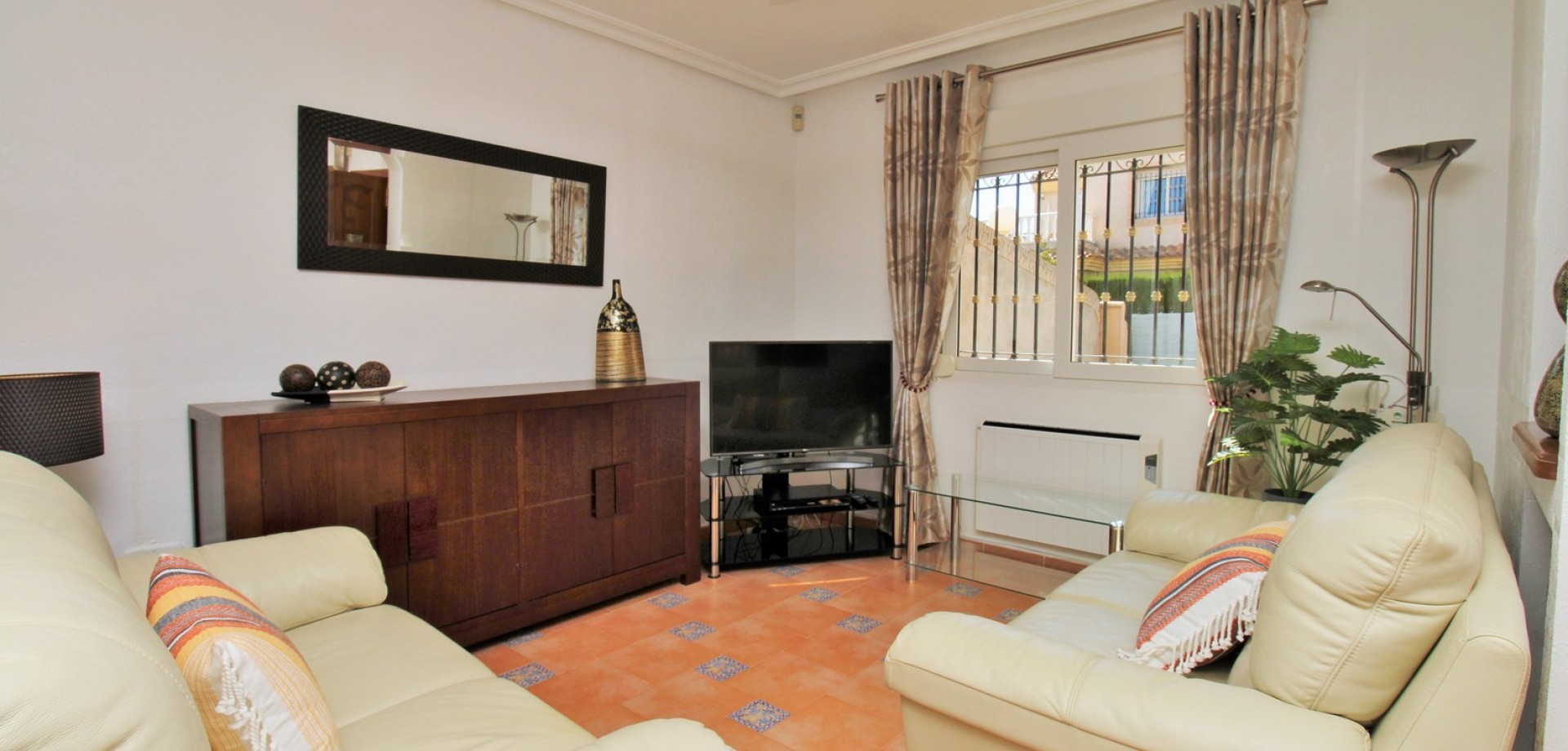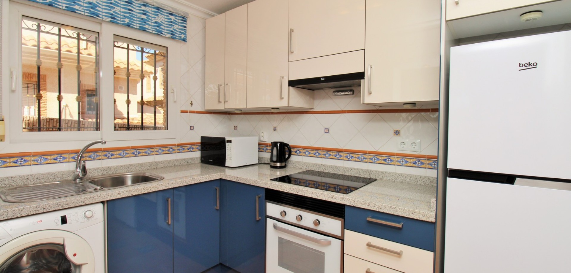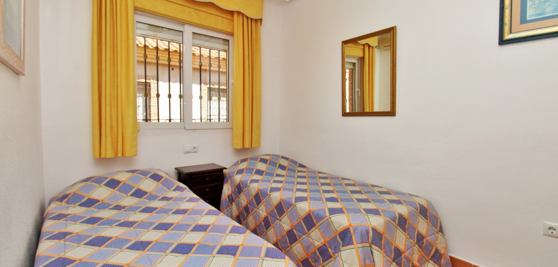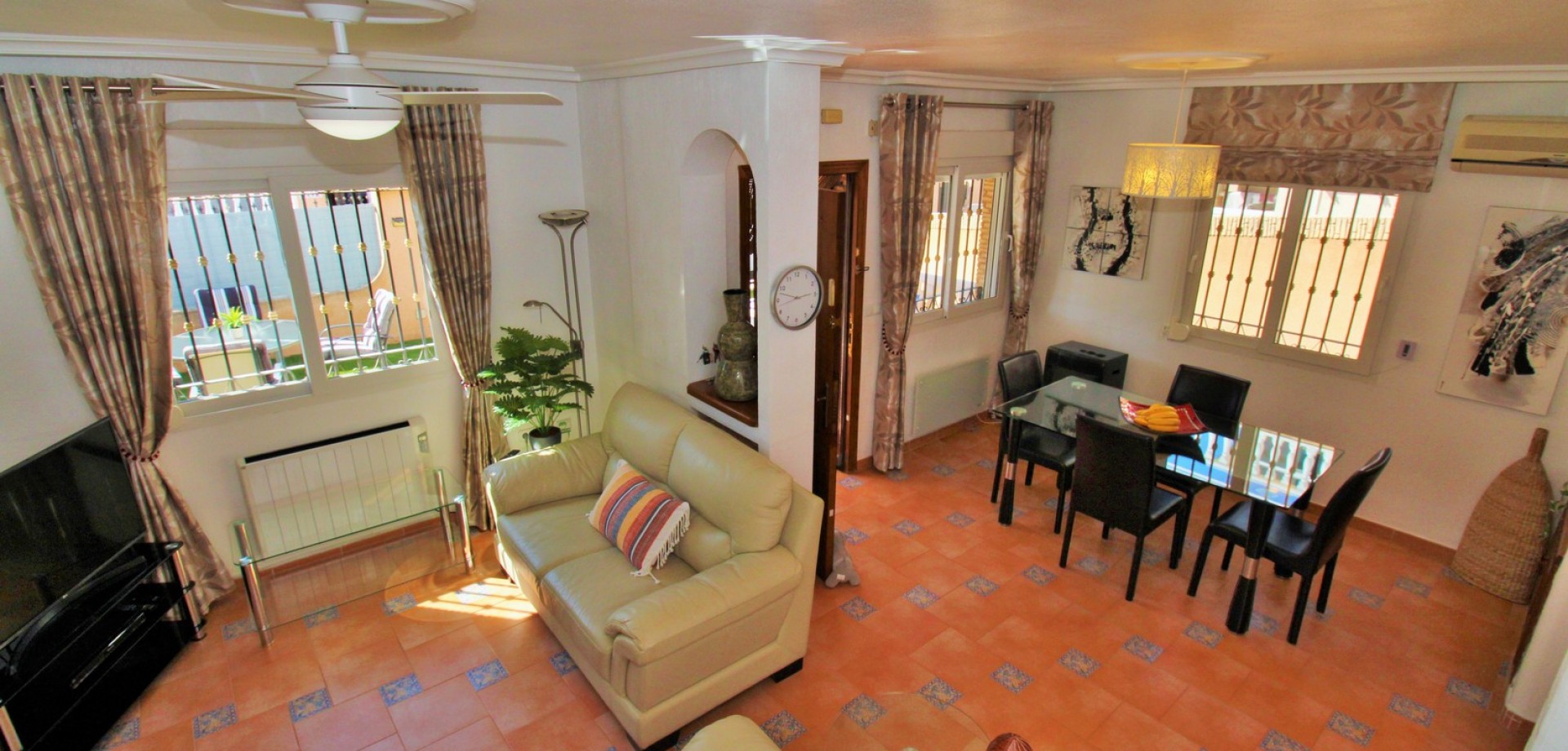 Diese gepflegte Doppelhaushälfte mit 3 Schlafzimmern und 2 Bädern befindet sich in der beliebten Wohnanlage Flamingo Hills II in Playa Flamenca und bietet großzügige Außenbereiche, eine praktische Raumaufteilung sowie eine hervorragende Lage in fußläufiger Entfernung zu allen Annehmlichkeiten. Die Immobilie liegt an einer ruhigen, privaten Gemeinschaftsstraße und ist nur wenige Gehminuten von Restaurants, Bars, Supermärkten und dem bekannten Einkaufszentrum Zenia Boulevard entfernt. Das Haus verfügt über einen privaten Garten mit Einfahrt, ideal zum Parken oder Entspannen, sowie über eine überdachte Terrasse. Im Inneren finden Sie ein helles Wohn- und Esszimmer, eine separate Küche, die teilweise modernisiert wurde, ein Schlafzimmer im Erdgeschoss mit Einbauschränken sowie ein Badezimmer mit ebenerdiger Dusche. Zusätzlich gibt es einen praktischen Abstellraum unter der Treppe. Im Obergeschoss befinden sich zwei weitere Schlafzimmer, ein zweites Badezimmer sowie der Zugang zu einer großen privaten Dachterrasse (Solarium), ideal zum Sonnenbaden oder für gesellige Abende. Die Immobilie gehört zu einer gepflegten Anlage mit Zugang zu einem schönen Gemeinschaftspool. Wird möbliert inklusive Elektrogeräten verkauft und eignet sich ideal als Hauptwohnsitz oder Ferienimmobilie.