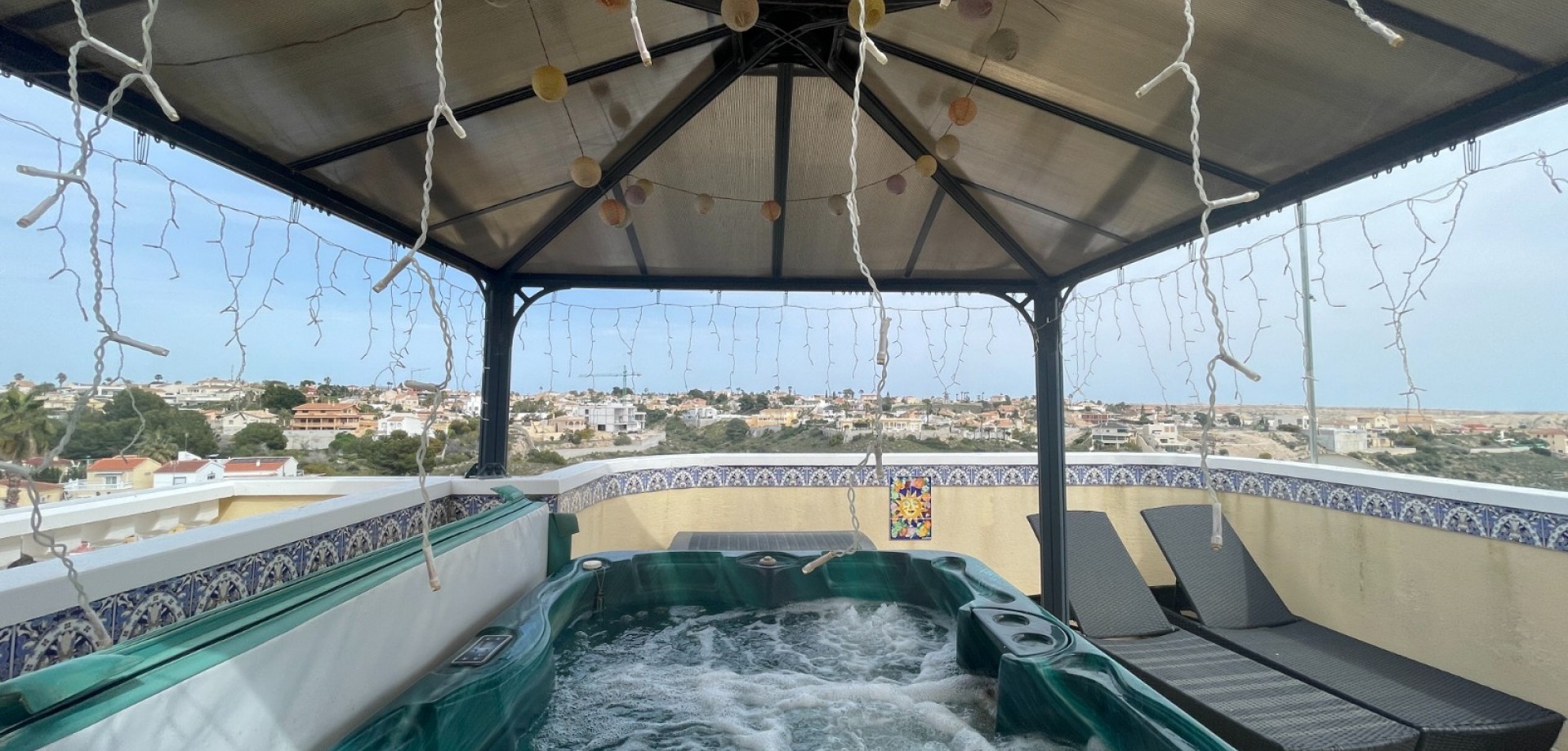 In einer der begehrtesten Lagen von La Marina befindet sich diese beeindruckende freistehende Villa mit Gästehaus und schönem Meerblick in Guardamar del Segura — eine perfekte Kombination aus Ruhe und Nähe zu allen Dienstleistungen, Restaurants und Einkaufsmöglichkeiten. Die Immobilie überzeugt durch ihre Vielseitigkeit und die durchdachte Aufteilung auf zwei Ebenen. Im Erdgeschoss befindet sich ein vollständig ausgestattetes Gästeapartment, ideal für Besucher oder zur Vermietung. Im Hauptgeschoss begeistert das Haus durch Helligkeit und großzügige Räume. Ein stilvoller Wohn- und Essbereich mit offener Küche schafft eine moderne und einladende Atmosphäre, mit direktem Zugang zu einer großen Terrasse mit herrlichem Ausblick. Ein privater Aufzug verbindet beide Etagen und sorgt für zusätzlichen Komfort. Das Highlight ist die großzügige Dachterrasse mit Pergola, Sommerküche und Whirlpool — der perfekte Ort zum Entspannen und Genießen des mediterranen Lebensstils. Die Villa verfügt zudem über Solarpaneele für mehr Energieeffizienz und Nachhaltigkeit. Für ganzjährigen Komfort sorgen Klimaanlage (warm/kalt) und ein Pelletofen. Außen bietet die Immobilie einen pflegeleichten Garten, einen privaten Stellplatz und Zugang zu einem Gemeinschaftspool. Eine ideale Immobilie als Dauerwohnsitz, Ferienhaus oder Investition. Kontaktieren Sie uns gerne für eine Besichtigung.