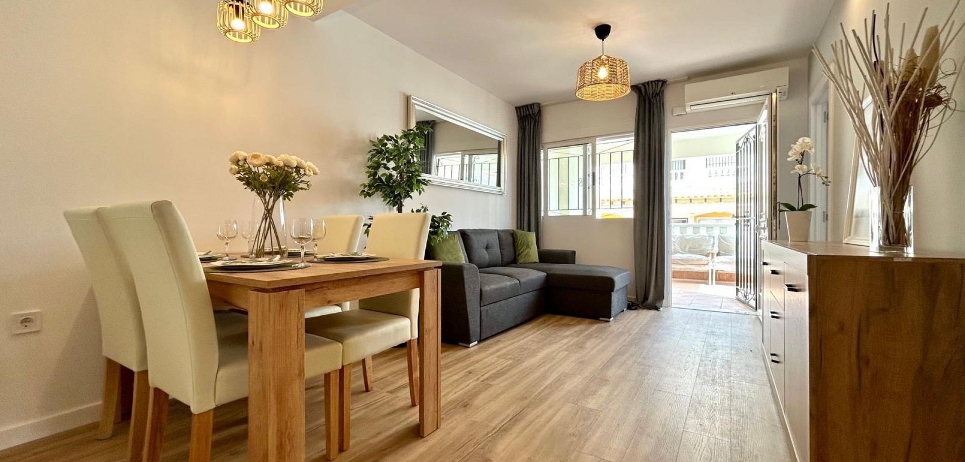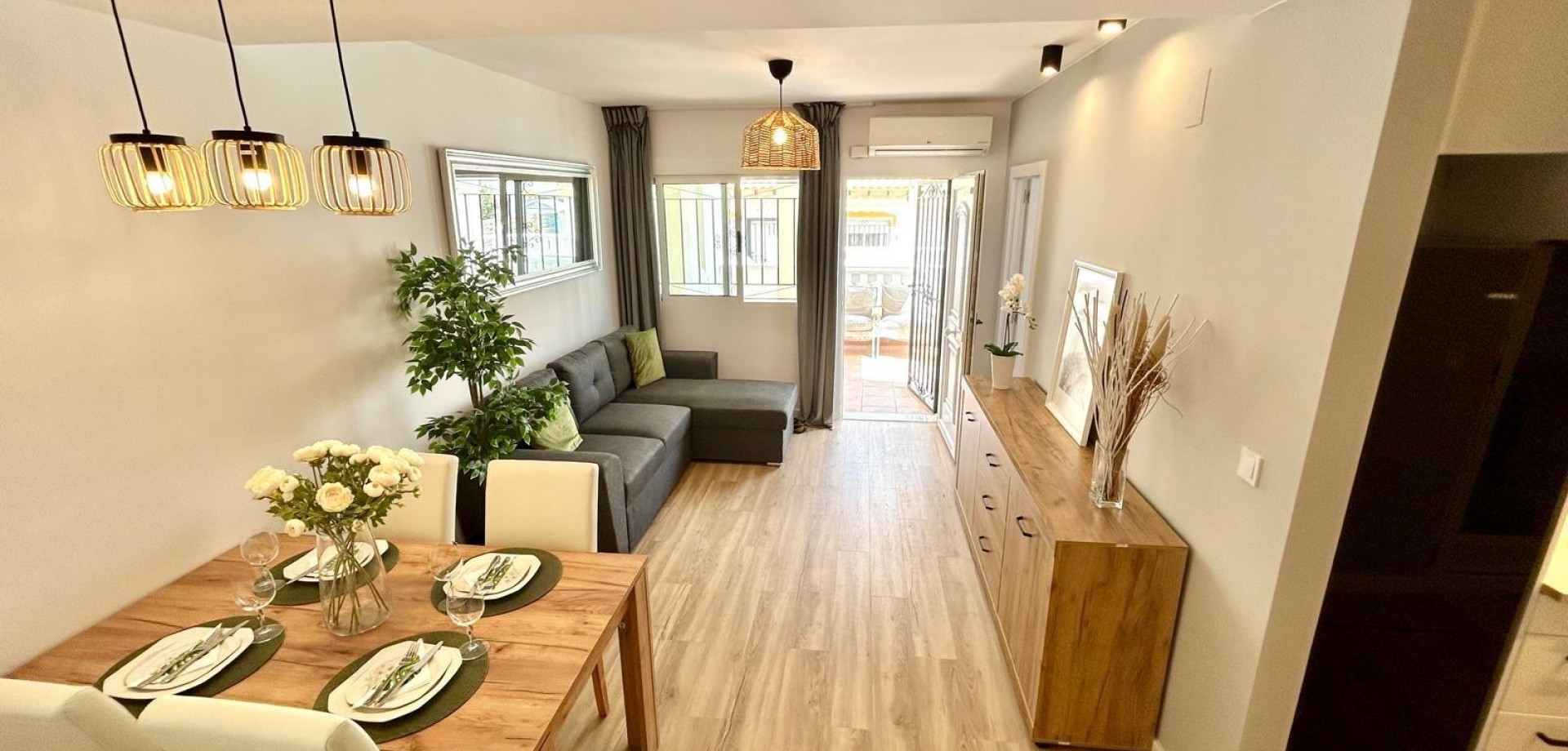 Completamente reformada casa adosada ubicada en la tranquila comunidad de Los Naranjos, en Los Altos. La vivienda ha sido completamente renovada y se encuentra en estado impecable, lista para entrar a vivir. Con la superficie construida de 83m2, consta de tres dormitorios y dos baños completos, salón -comedor, cocina independiente, porche delantero cubierto. La cocina equipada con todos los electrodomésticos modernos, con la zona de lavadero. La vivienda se distribuye en dos plantas y tiene un diseño funcional y moderno. Acceso a la vivienda a través de un jardín privado. En la planta superior se encuentran dos amplios dormitorios dobles, ambos con armarios, y un segundo baño completo con bañera. El dormitorio principal orientado al sur, lo que le proporciona una luz natural durante todo el día. Aire acondicionado instalado en cada estancia. Se vende completamente amueblada, con muebles de calidad y todo lo necesario para entrar a vivir (excepto efectos personales y elementos decorativos). Residencial ofrece una preciosa piscina comunitaria, y la vivienda se sitúa en una calle muy tranquila, con fácil aparcamiento y entorno agradable. A solo 400 metros esta el supermercado Consum, varios restaurantes, a 15 minutos andando del centro comercial Punta Marina. La Playa de Punta Prima esta a 2 km.