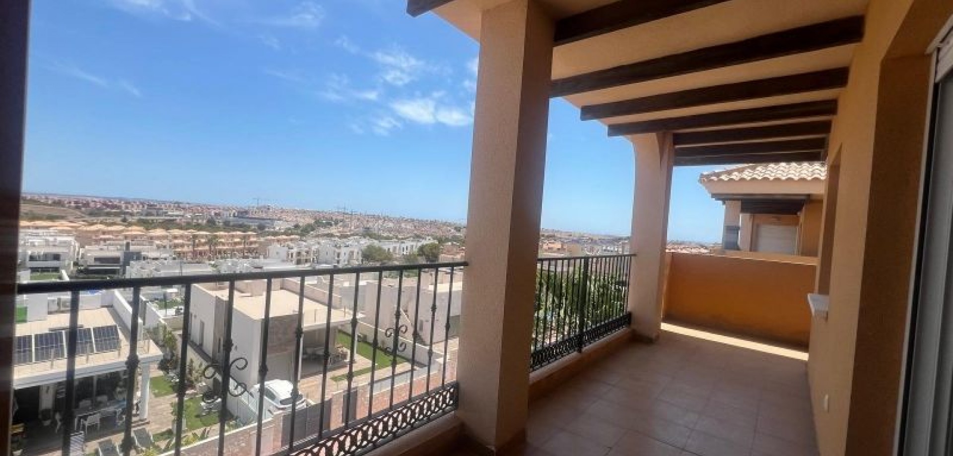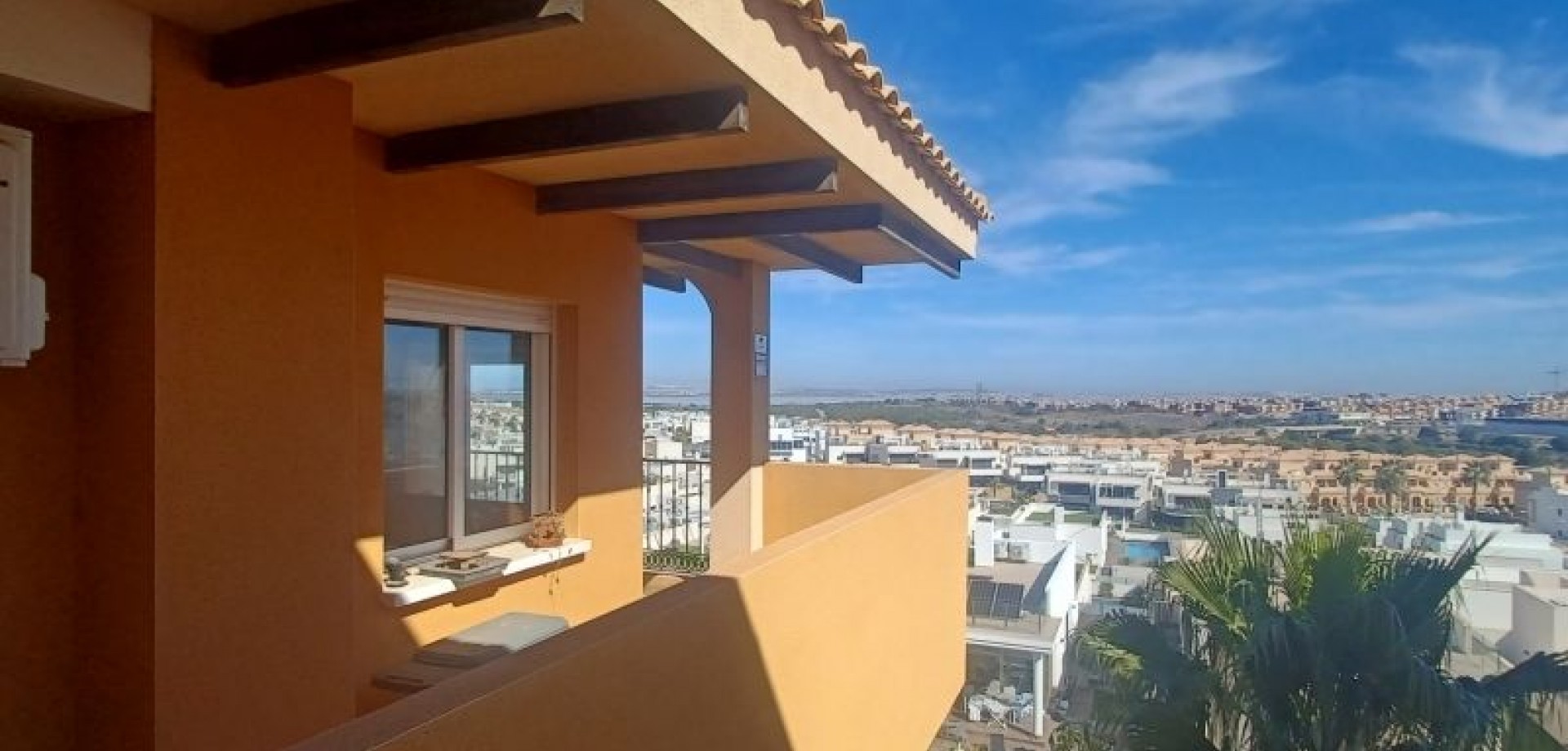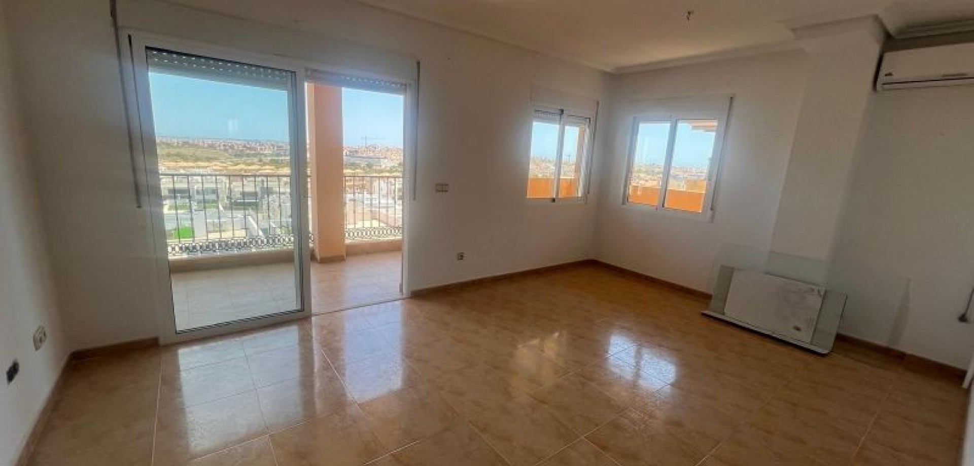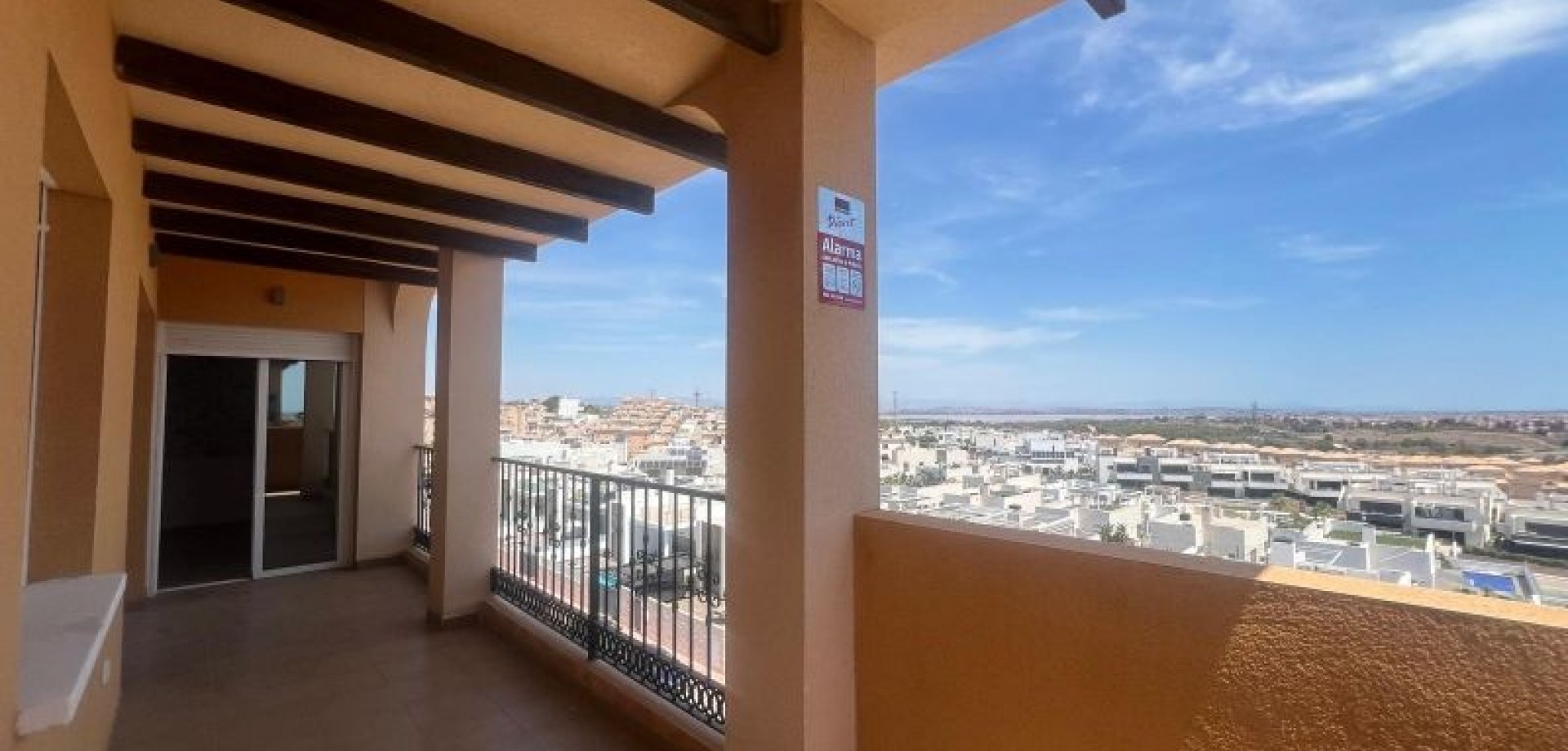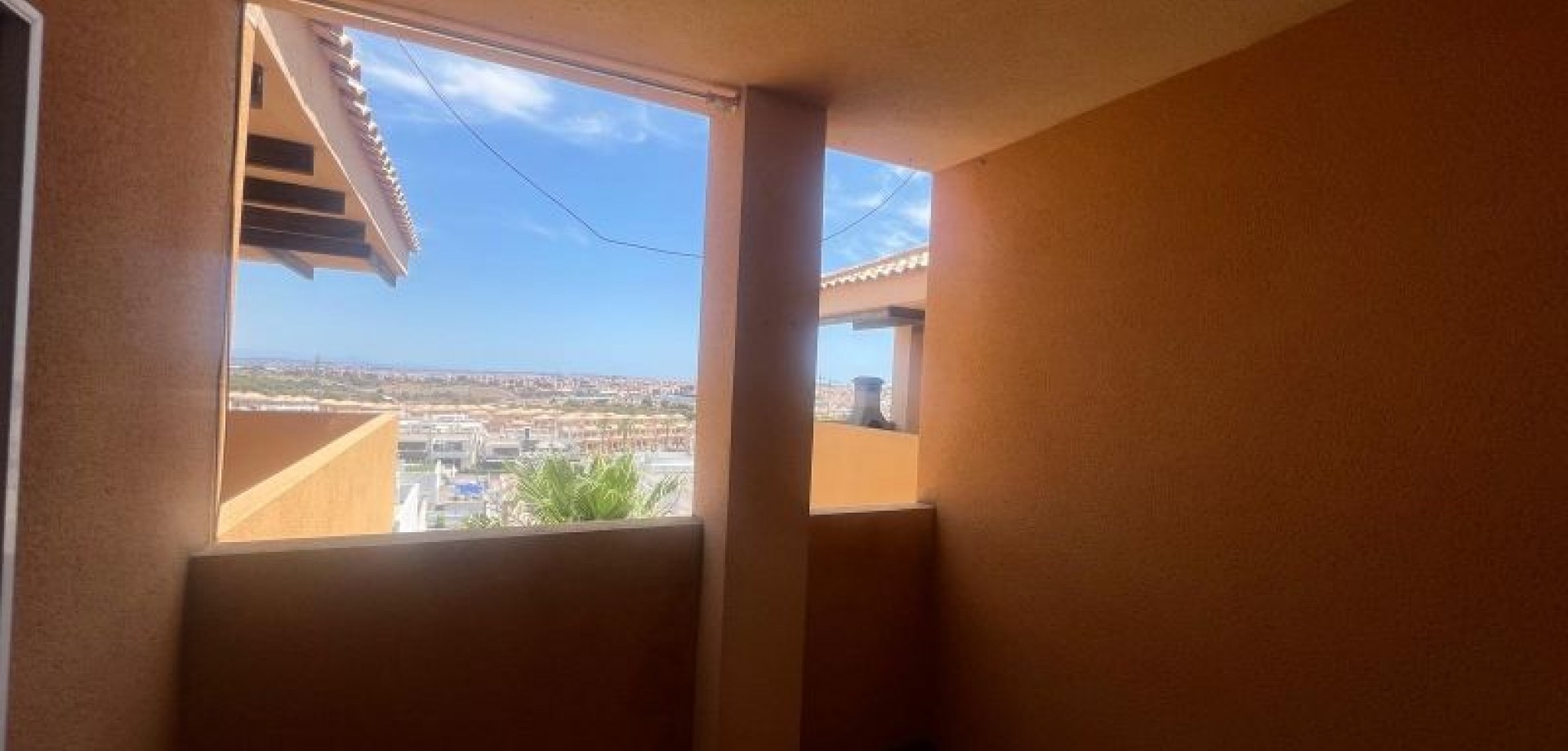 AMPLIO ÁTICO CON TERRAZA Y SOLARIUM PRIVADO CON VISTAS Y PISCINA FACIL POSIBILIDAD DE AMPLIAR A 3 DORMITORIOS Situado en zona Residencial tranquila, junto a zona verde protegida, a 1 km de Servicios, como Parada de Bus, Supermercados como ALDI, Consum,... a 2 km de Campo de Golf de Villamartin y a 5 km de las Playas de Orihuela Costa, como Punta Prima, Playa Flamenca, La Zenia,... La vivienda es Tipo Ático, Tercera Planta, dispone de Ascensor. Salón muy amplio, diseño cuadrado con acceso a Terraza con Vistas despejadas a Mar y Zonas verdes. Dispone de una Sala extra que puede ser habilitada fácilmente como el tercer dormitorio o un estudio extra independiente. Piscina Comunitaria. Necesita instalar la cocina.