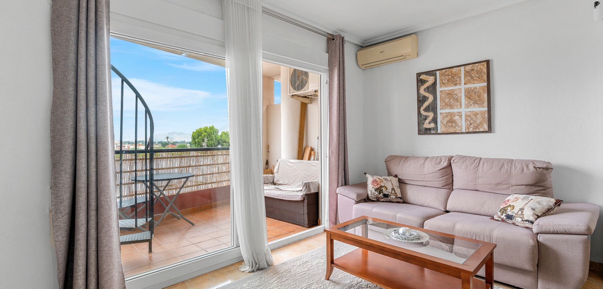 Este encantador piso de 69 m² construidos y 65 m² útiles ofrece una distribución práctica y acogedora, ideal tanto como vivienda habitual como para escapadas o inversión. Al entrar, un recibidor conecta con dos dormitorios dobles bien ventilados y un baño completo situado entre ambos. La zona de día se compone de un amplio salón-comedor con cocina abierta, un espacio luminoso y versátil perfecto para relajarse o disfrutar con invitados. Desde el salón se accede a un balcón privado, desde donde una escalera de caracol lleva directamente a un solárium de uso exclusivo de 27 m². Este espacio exterior ofrece múltiples posibilidades: zona chill-out, comedor al aire libre, rincón de lectura o simplemente un lugar donde disfrutar del sol. Además, en la misma planta del solárium, se encuentra la piscina comunitaria en la azotea, una característica poco habitual en la zona que aporta un toque exclusivo a la vivienda. La propiedad, orientada al suroeste, goza de excelente luz natural durante todo el día. Construida en 2006, incluye aire acondicionado y armarios empotrados, y se encuentra en una comunidad bien cuidada. Su combinación de espacios interiores cómodos y zonas exteriores privadas hacen de este piso una oportunidad única para vivir o veranear en Almoradí.