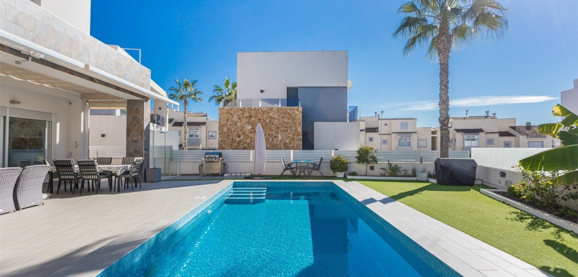 Exclusiva villa cerca de la playa en La Mata – Costa Blanca ¿Sueña con una villa moderna junto al Mediterráneo? Esta magnífica propiedad en La Mata, a solo 400 metros del mar, le ofrece lo mejor del lujo y la ubicación. Con una superficie habitable de 207 m² distribuidos en tres plantas y una parcela de 350 m², disfrutará de una casa espaciosa y bien cuidada con un alto nivel de calidad. La villa cuenta con 4 dormitorios y 4 baños, lo que la convierte en una vivienda ideal tanto para vivir todo el año como para disfrutar de las vacaciones de toda la familia. Reflejos: • Piscina privada para días tranquilos bajo el sol. • Sauna – tu propio spa en casa • Gran terraza en la azotea con fantásticas vistas. • Sótano con cocina propia, ideal para invitados o reuniones sociales. • Trastero y parking en la propiedad. • Viene amueblado, listo para mudarse. • A pocos pasos de tiendas, restaurantes y playa. • A sólo 35 minutos del aeropuerto de Alicante La villa combina una arquitectura moderna con soluciones funcionales y un estilo integral. Sus amplios ventanales proporcionan abundante luz y un ambiente amplio, mientras que las zonas exteriores están diseñadas para disfrutar del fantástico clima que caracteriza a la Costa Blanca, con más de 300 días de sol al año. Esta es una oportunidad única de conseguir una villa moderna en una de las zonas más solicitadas de España. ¡Nuevo en el mercado! ¡Contáctenos hoy para una visita!