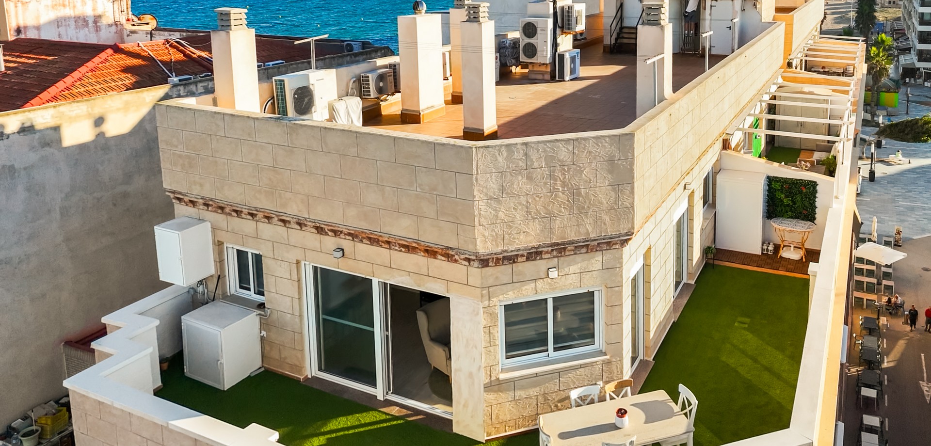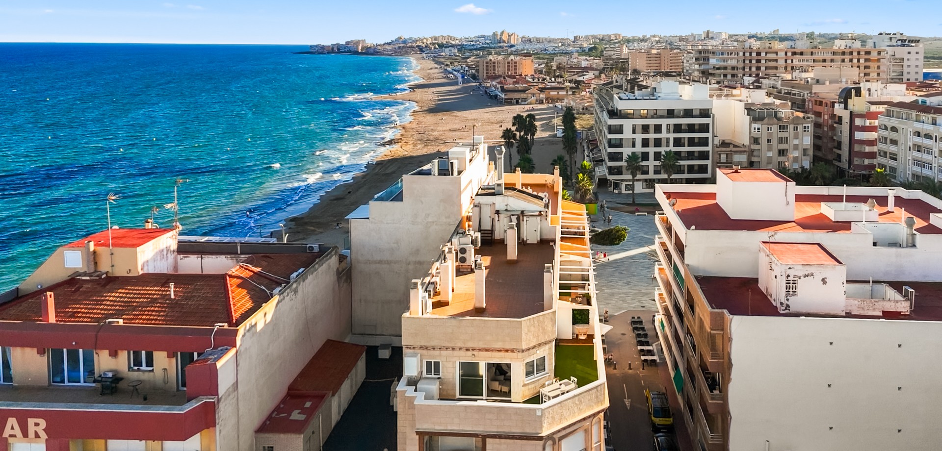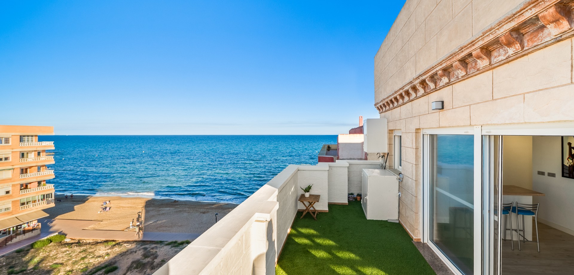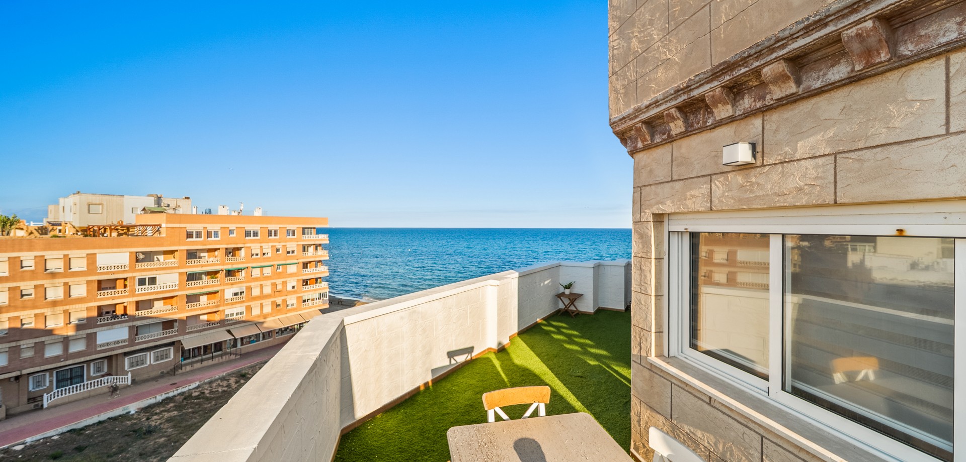 Ático en esquina reformado con vistas al mar en La Mata. Ático en quinta planta, recientemente reformado y ubicado a solo 50 metros de la playa de La Mata. La vivienda cuenta con 90 m² construidos y una amplia terraza de 45 m² con vistas al mar. Dispone de 2 dormitorios, 2 baños, cocina abierta y salón luminoso con salida directa a la terraza. Se vende completamente amueblado y equipado, con aire acondicionado y orientación oeste. Características destacadas: 2 dormitorios 2 baños 90 m² construidos Terraza de 45 m² con vistas al mar Cocina abierta Aire acondicionado Orientación oeste 5ª planta Amueblado Edificio con ascensor Gastos anuales: IBI: 250 € Comunidad: 400 € Ubicación: A 50 m de la playa de La Mata A 50 m de bares y restaurantes A 100 m de supermercado A 500 m del Parque Natural de la Laguna Salada de La Mata