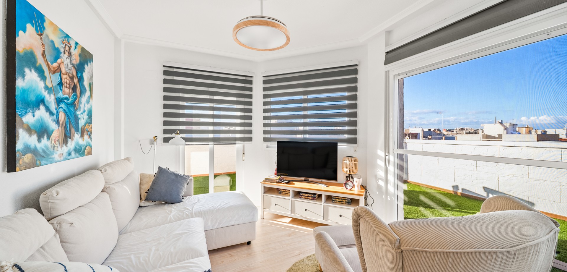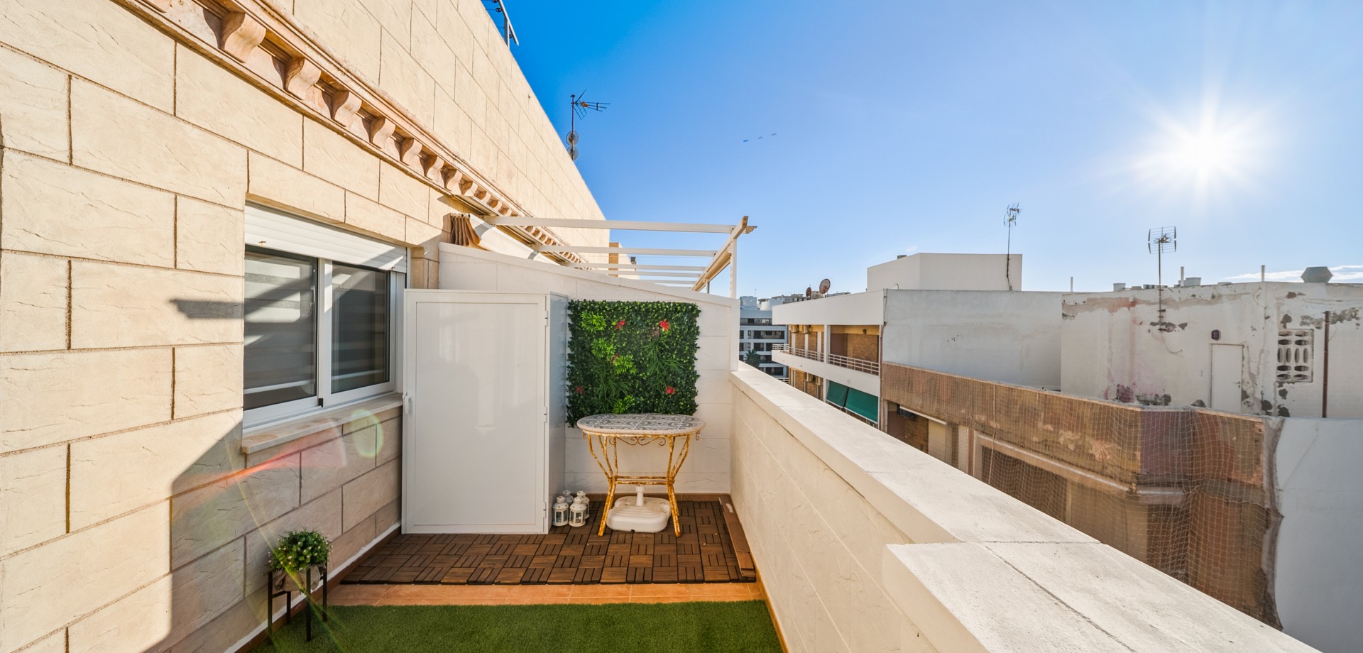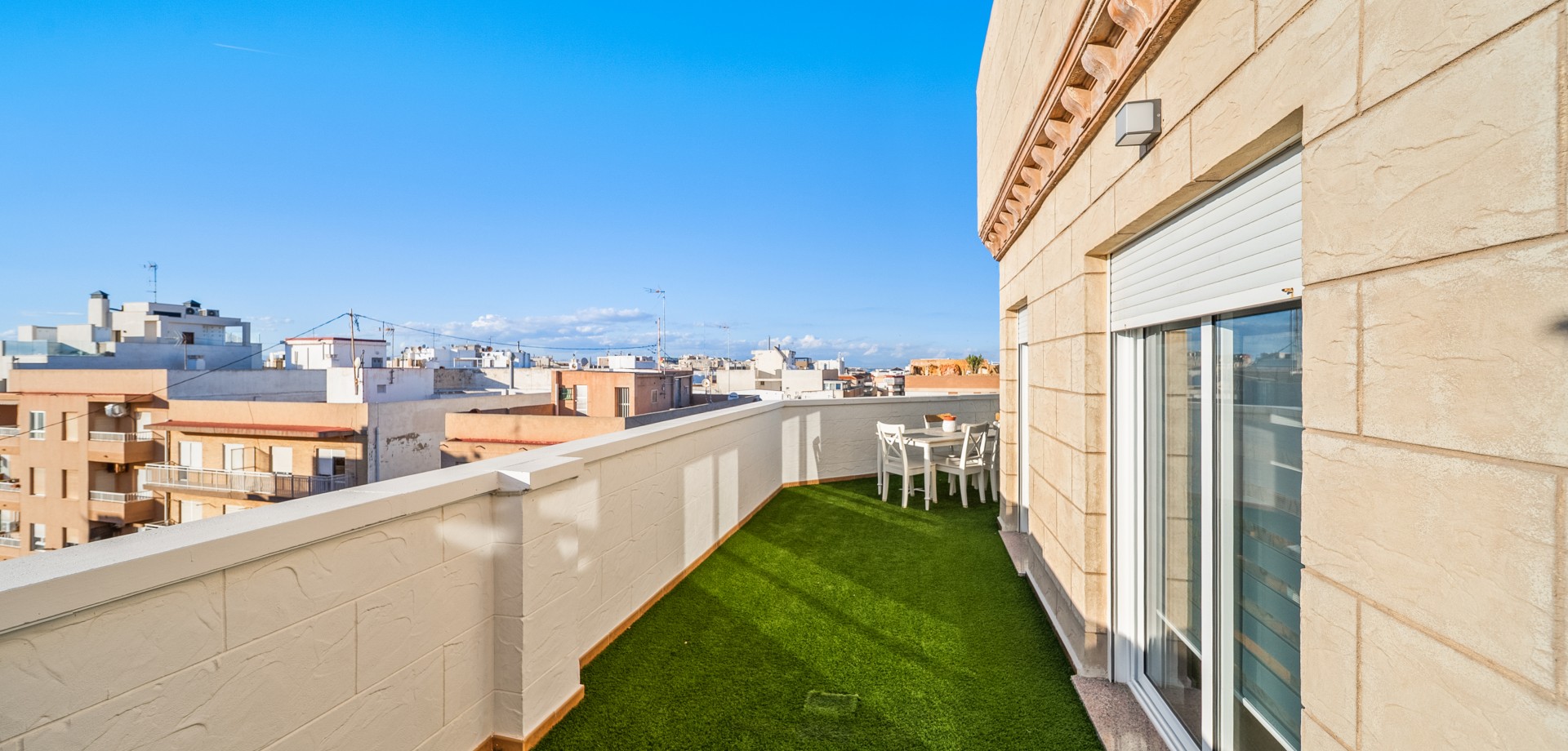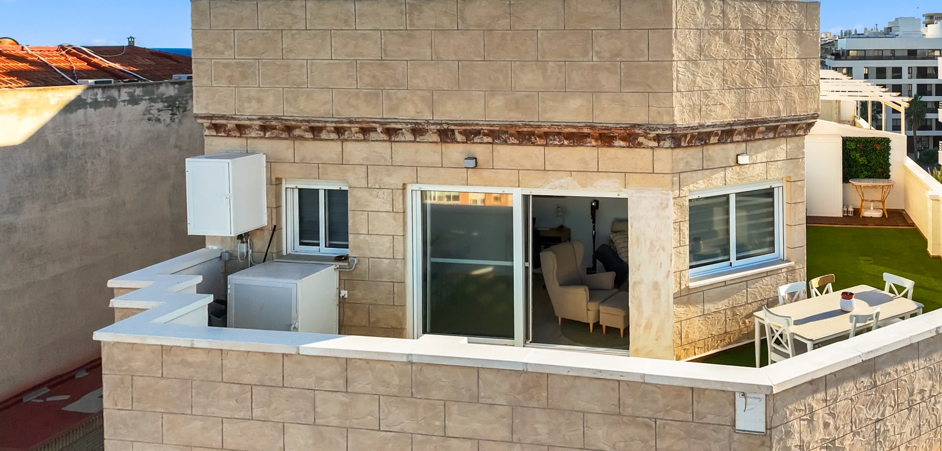 Ático en esquina reformado con vistas al mar en La Mata. Ático en quinta planta, recientemente reformado y ubicado a solo 50 metros de la playa de La Mata. La vivienda cuenta con 90 m² construidos y una amplia terraza de 45 m² con vistas al mar. Dispone de 2 dormitorios, 2 baños, cocina abierta y salón luminoso con salida directa a la terraza. Se vende completamente amueblado y equipado, con aire acondicionado y orientación oeste. Características destacadas: 2 dormitorios 2 baños 90 m² construidos Terraza de 45 m² con vistas al mar Cocina abierta Aire acondicionado Orientación oeste 5ª planta Amueblado Edificio con ascensor Gastos anuales: IBI: 250 € Comunidad: 400 € Ubicación: A 50 m de la playa de La Mata A 50 m de bares y restaurantes A 100 m de supermercado A 500 m del Parque Natural de la Laguna Salada de La Mata
