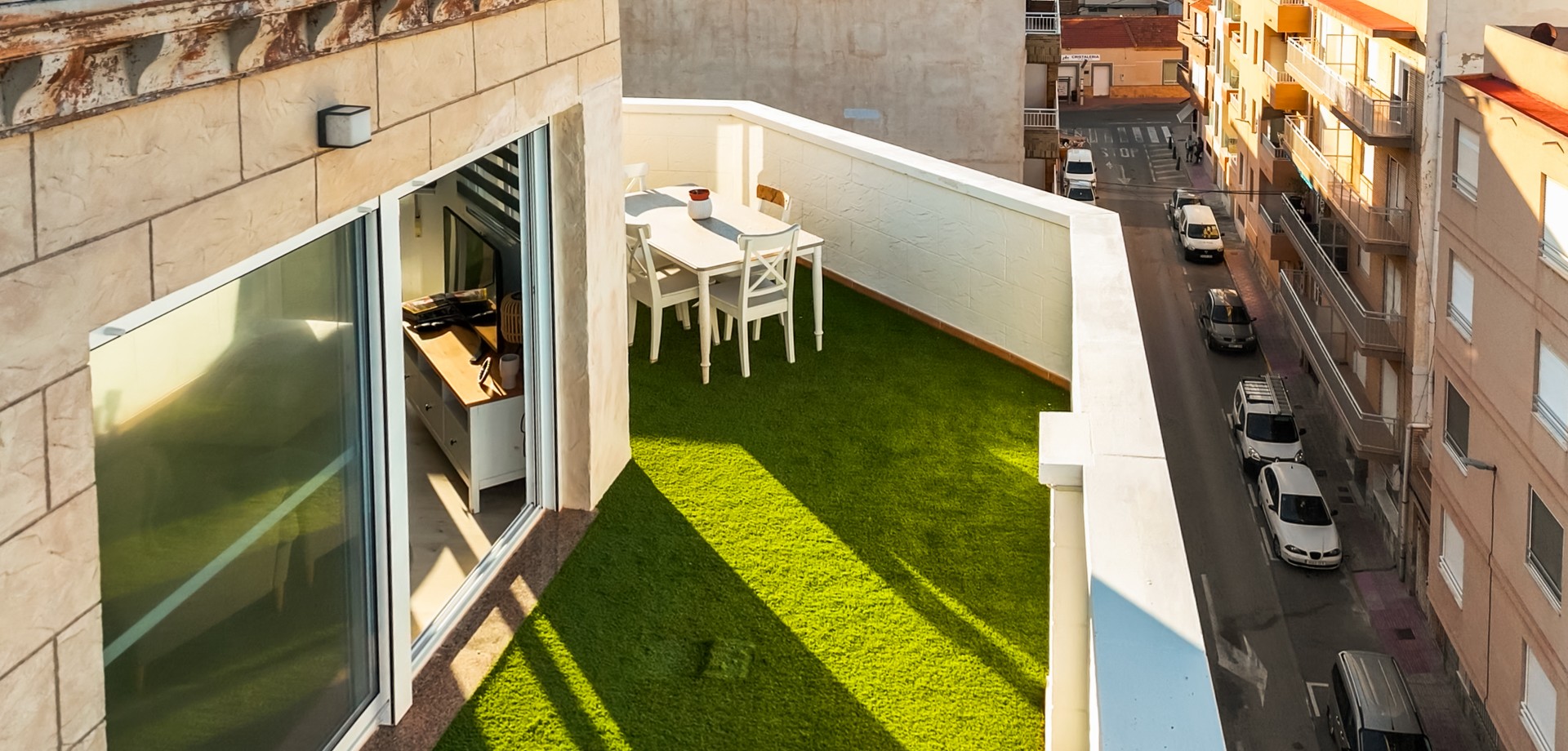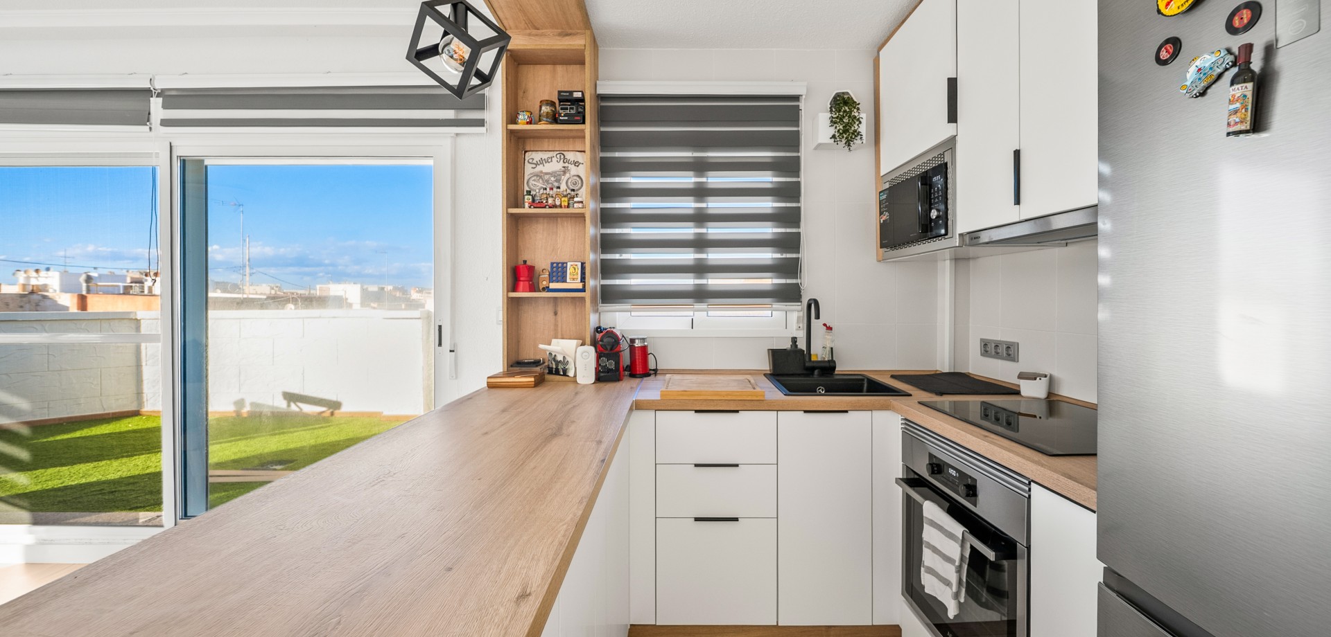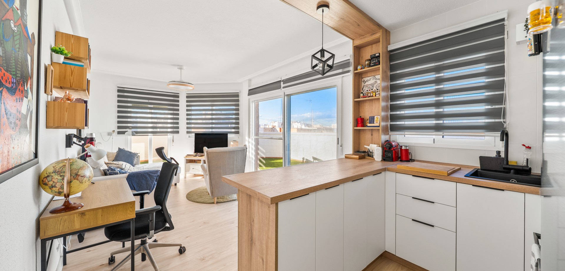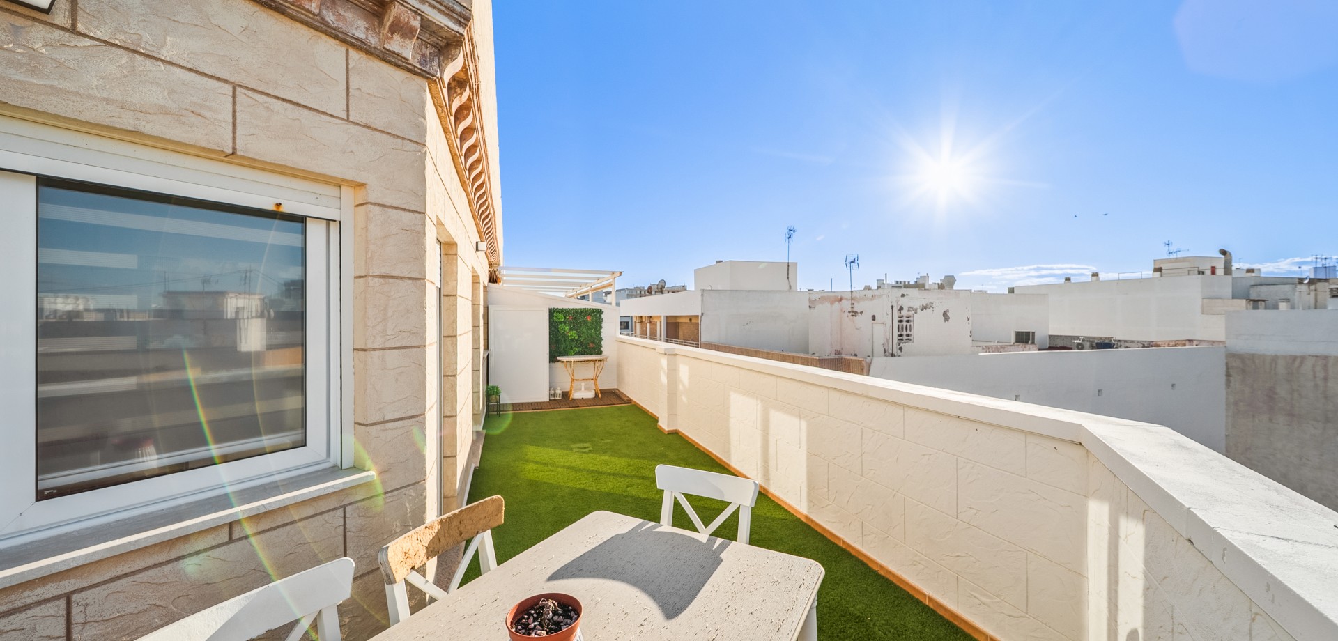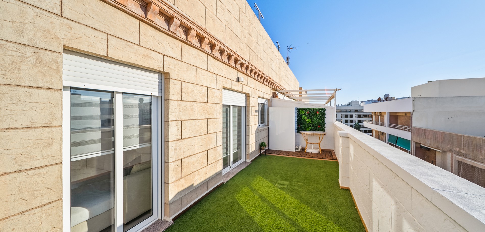 Ático en esquina reformado con vistas al mar en La Mata. Ático en quinta planta, recientemente reformado y ubicado a solo 50 metros de la playa de La Mata. La vivienda cuenta con 90 m² construidos y una amplia terraza de 45 m² con vistas al mar. Dispone de 2 dormitorios, 2 baños, cocina abierta y salón luminoso con salida directa a la terraza. Se vende completamente amueblado y equipado, con aire acondicionado y orientación oeste. Características destacadas: 2 dormitorios 2 baños 90 m² construidos Terraza de 45 m² con vistas al mar Cocina abierta Aire acondicionado Orientación oeste 5ª planta Amueblado Edificio con ascensor Gastos anuales: IBI: 250 € Comunidad: 400 € Ubicación: A 50 m de la playa de La Mata A 50 m de bares y restaurantes A 100 m de supermercado A 500 m del Parque Natural de la Laguna Salada de La Mata