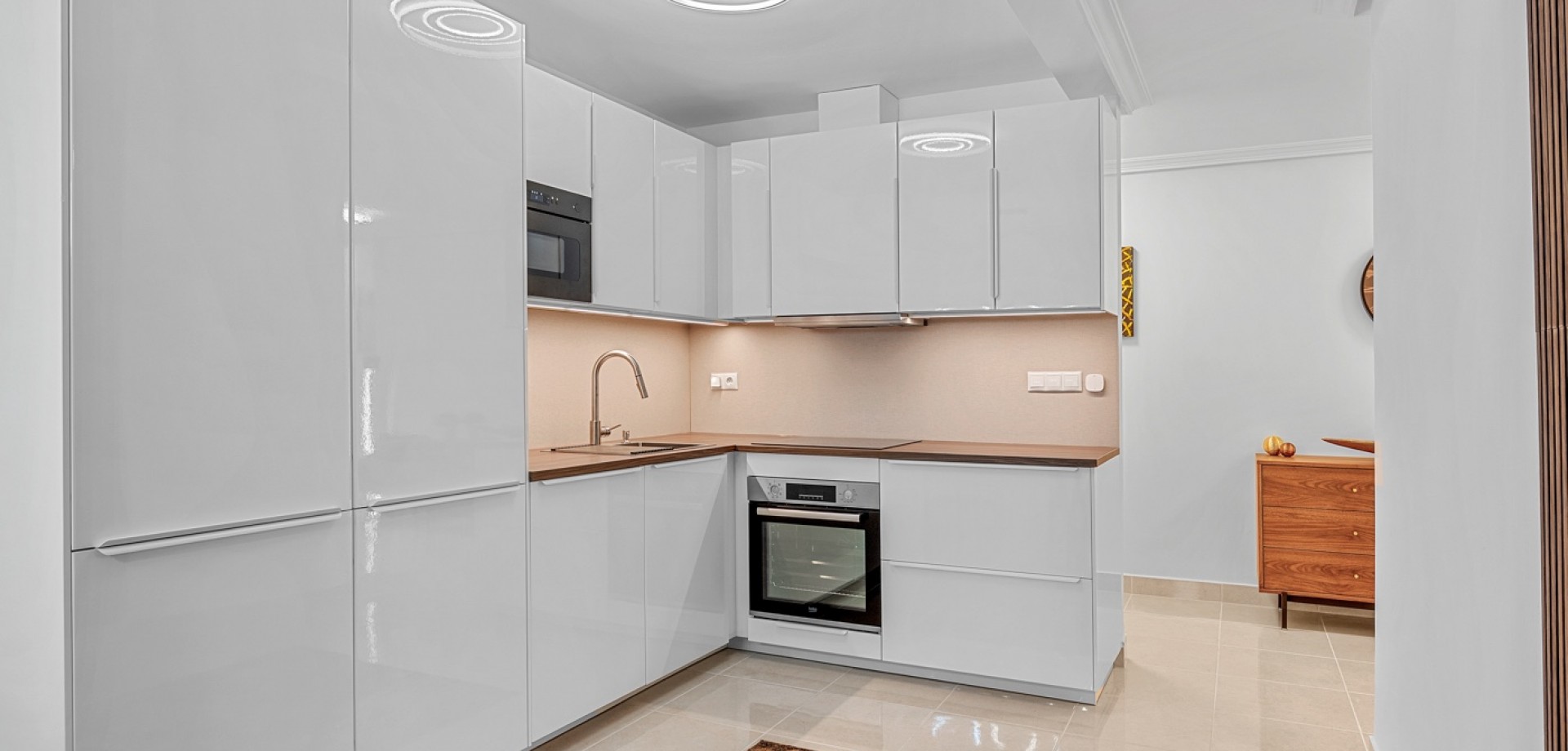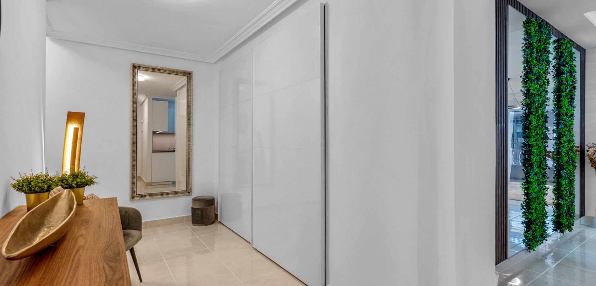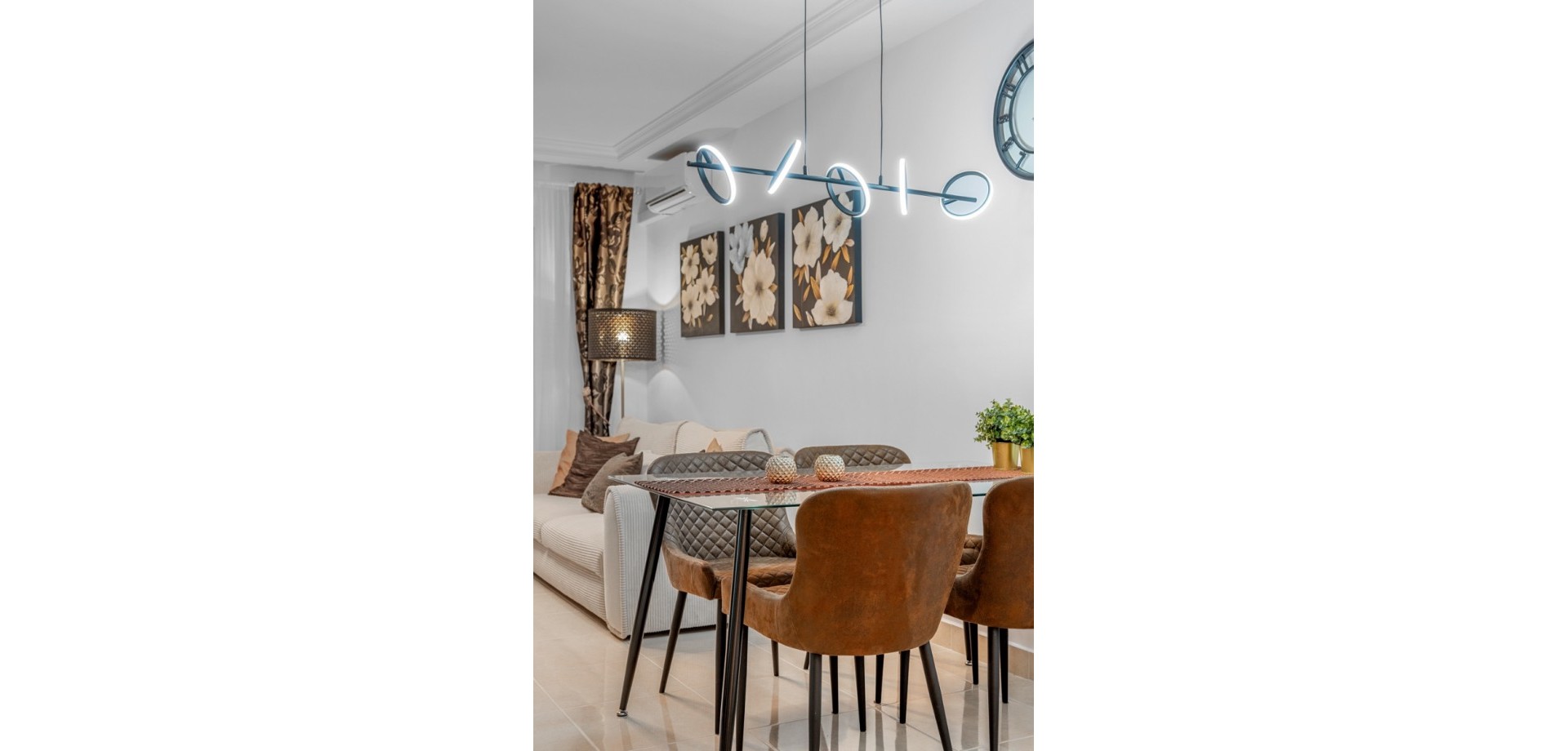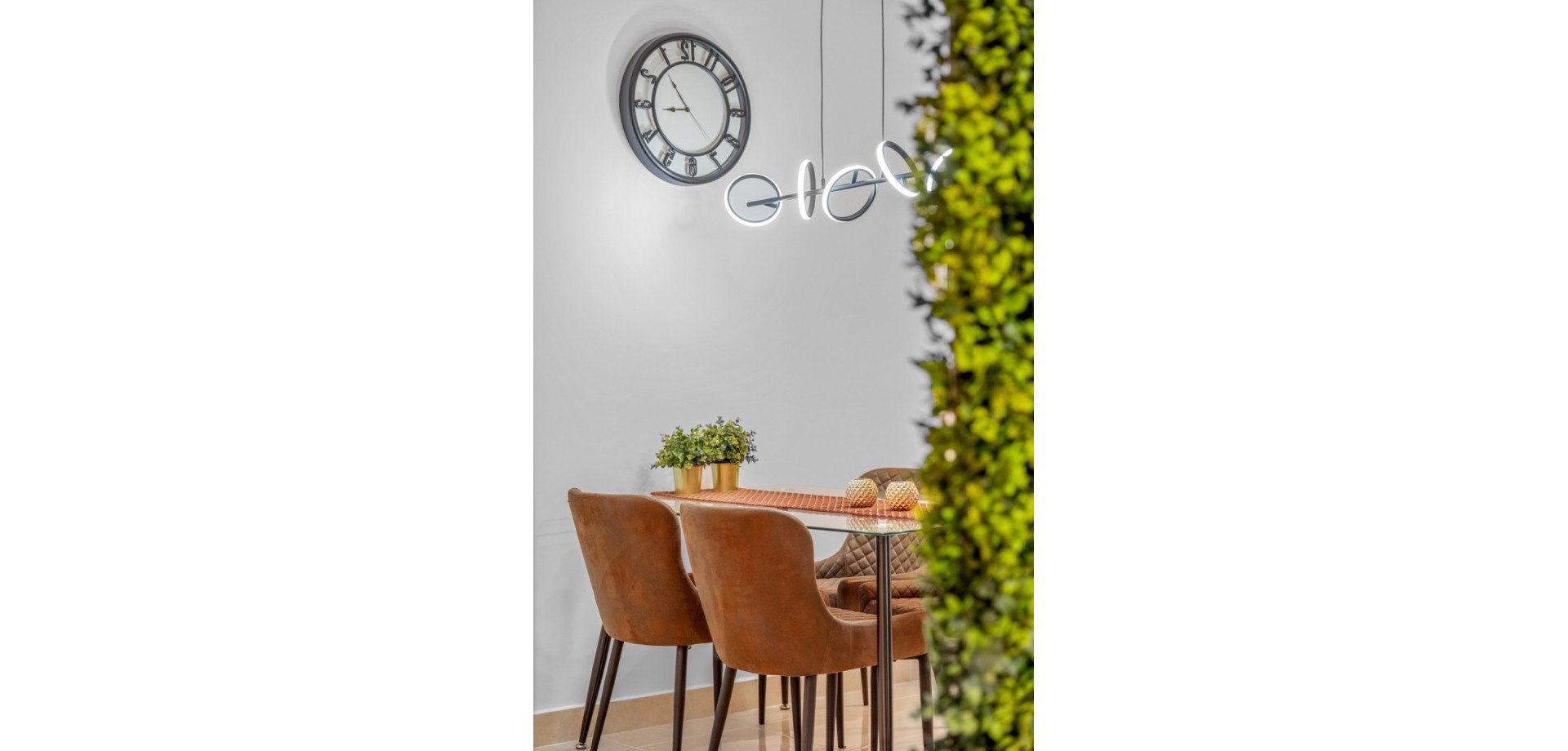 El interior está decorado en un estilo moderno y minimalista, combinando la elegancia del blanco con la calidez de la madera y el toque natural de las plantas. Se vende parcialmente amueblado, tal como se muestra en las fotos, dejando espacio para que el nuevo propietario personalice el ambiente a su gusto.