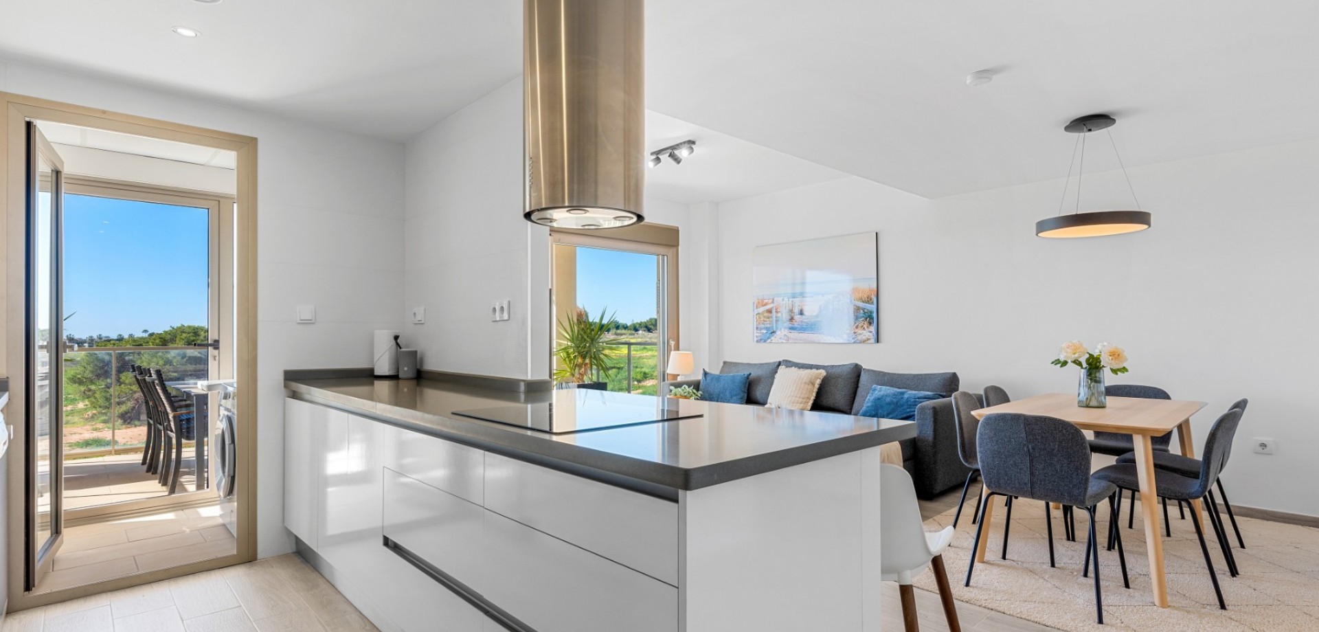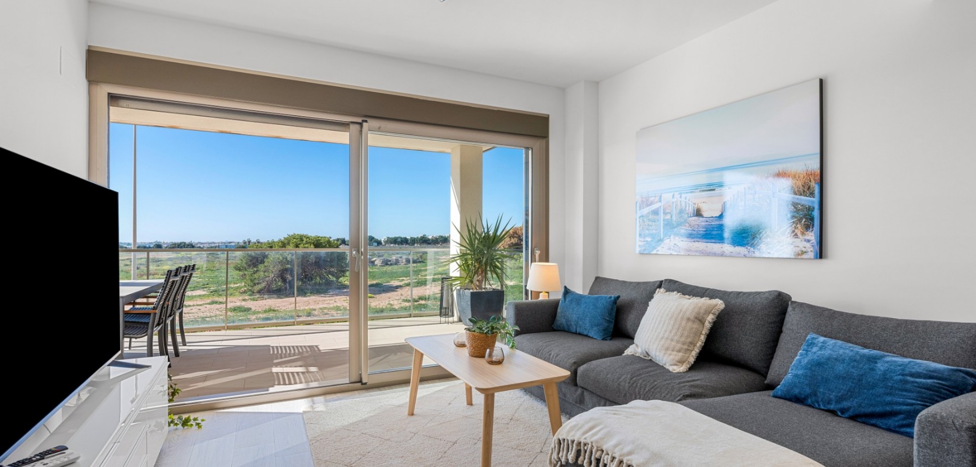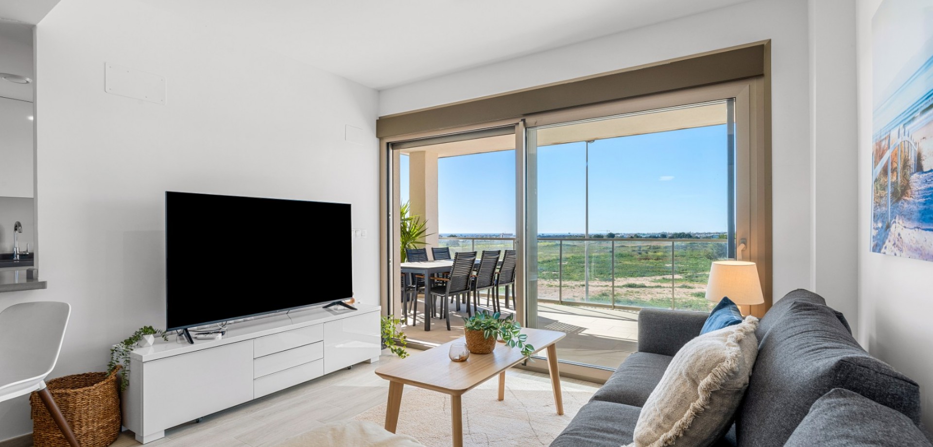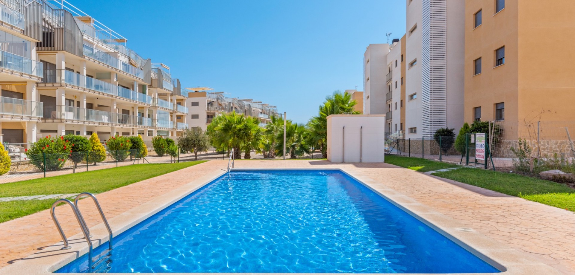 Moderno apartamento con orientación sur con 2 dormitorios y 2 baños - Amplia terraza - ¡Parking y trastero! Aquí tenemos un apartamento moderno y ordenado en el segundo piso con 2 dormitorios, 2 baños delicados, una amplia sala de estar con cocina abierta y una gran terraza fuera de la sala de estar. El apartamento está bien equipado y se vende con muebles incluidos en el precio. Orientación sur con condiciones ideales de sol.Hay un ascensor en el edificio y un garaje subterráneo con plaza de aparcamiento y trastero privado. Se encuentra a poca distancia de una buena selección de restaurantes, cafeterías y el centro comercial de La Zenia. Si quieres ir a la playa, puedes bajar en bicicleta en unos 15 minutos. También cabe mencionar que en las cercanías hay tres campos de golf de 18 hoyos. El complejo incluye 3 piscinas (una de ellas incorporada y climatizada) y amplias zonas verdes para jugar. ¡Bienvenido a Villamartin Gardens!