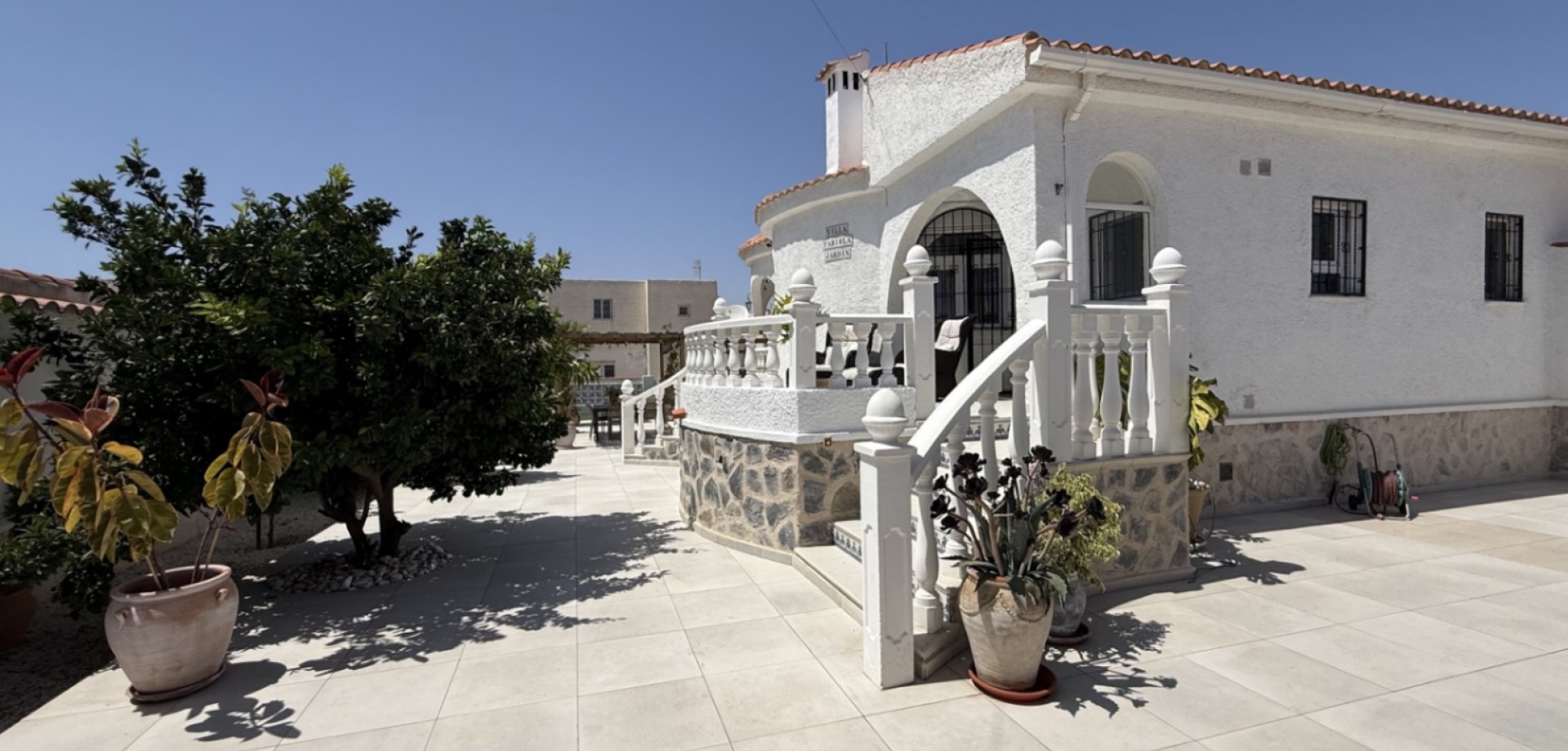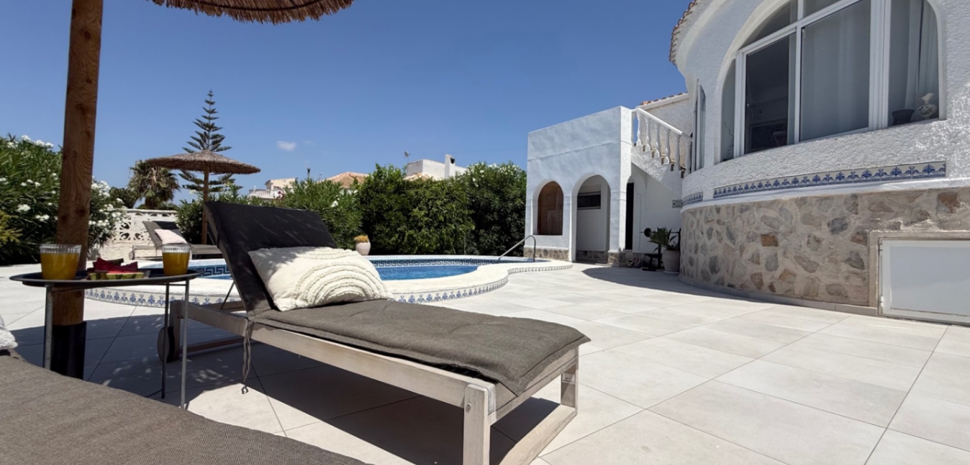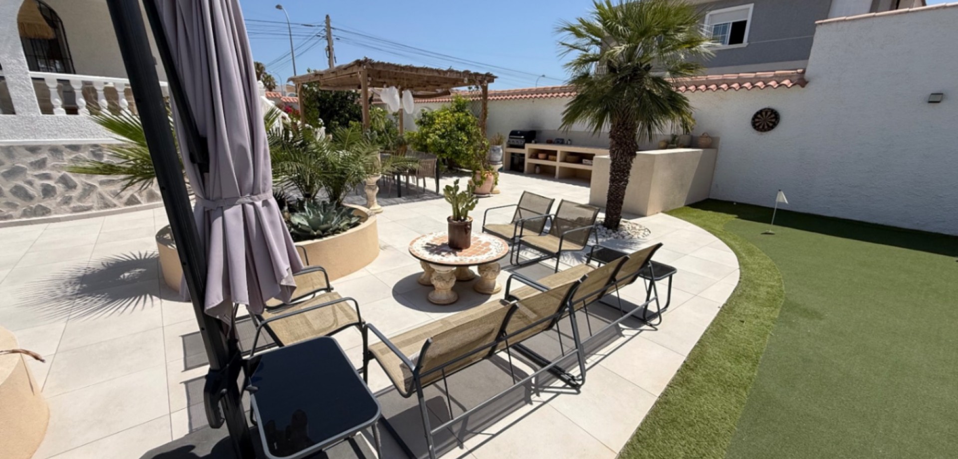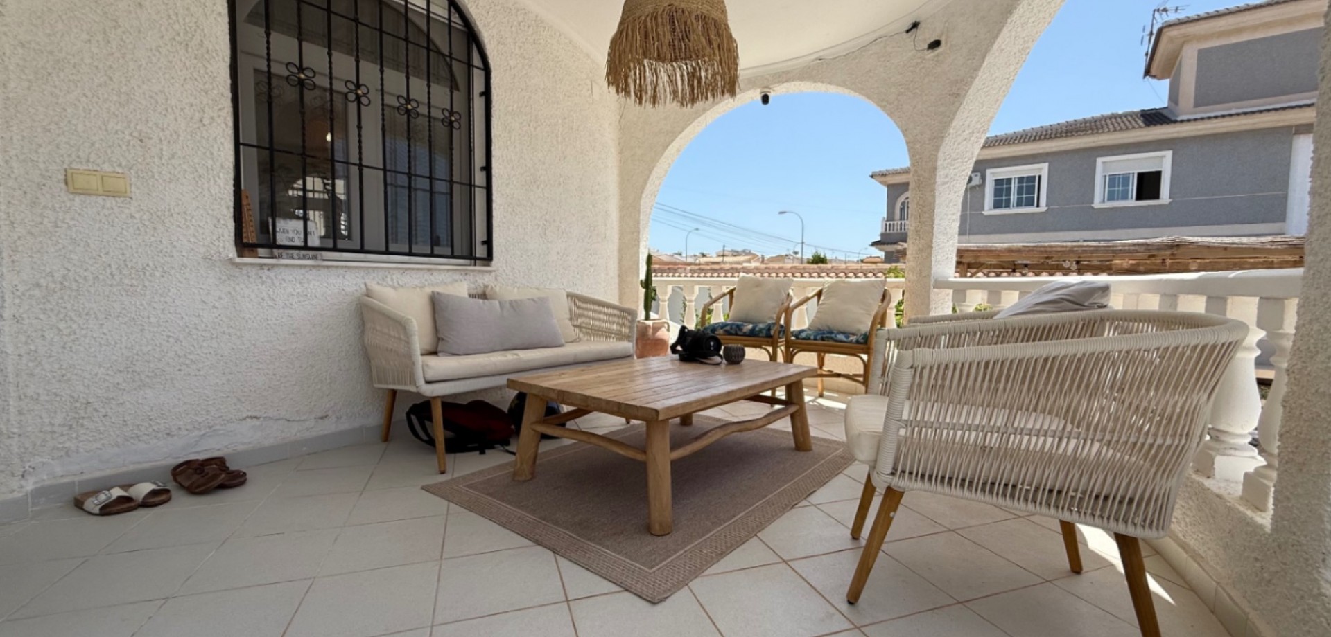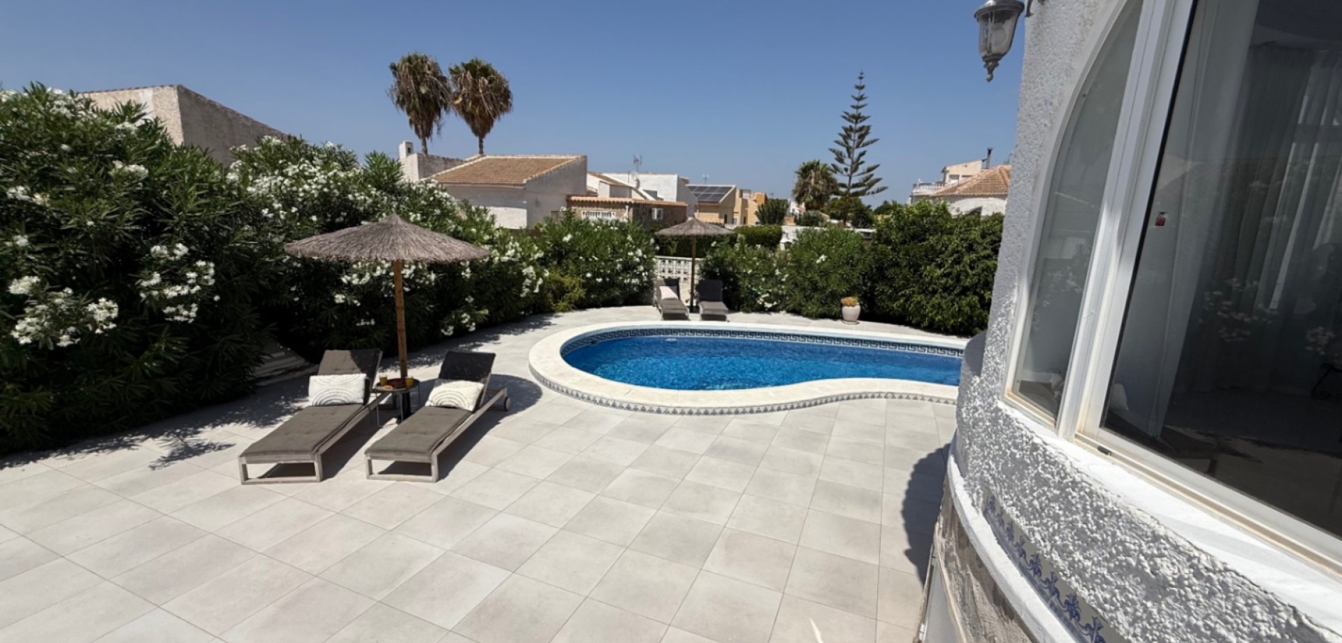 Presentamos esta villa independiente de tres habitaciones y dos baños, elegantemente presentada, idealmente ubicada en el codiciado vecindario de El Chaparral / San Luis - Costa Blanca Sur. Situada en una generosa parcela de aproximadamente 800 m², esta propiedad ofrece una rara combinación de privacidad, espacio y estilo refinado. Rodeada de muros de privacidad y con acceso a través de una entrada segura, la villa ofrece una atmósfera tranquila y acogedora desde el momento de su llegada. El hogar ha sido cuidadosamente actualizado a un estándar alto, combinando un diseño nórdico limpio con la calidez de los elementos tradicionales españoles. El resultado es un interior armonioso y acogedor que se siente tanto contemporáneo como atemporal. La espaciosa veranda acristalada da a la impresionante área de la piscina con piscina de agua salada y jardines cuidadosamente mantenidos y de bajo mantenimiento, creando una experiencia de vida interior-exterior sin interrupciones que se puede disfrutar durante todo el año. Los jardines de la propiedad tienen una codiciada orientación suroeste, bañados por la luz natural durante todo el día, perfectos para quienes buscan sol y entretenimiento al aire libre. Varias zonas de descanso, piscina de agua salada, áreas de comedor, solárium con vistas al lago salado y cocina exterior completan realmente este oasis al aire libre. Los jardines están llenos de árboles frutales, incluyendo: naranja, naranja sanguina, mandarina, limón, mango y olivo. Las características adicionales incluyen aparcamiento fuera de la carretera, una zona de almacenamiento dedicada, un baño completo exterior para la comodidad junto a la piscina y exteriors bellamente alicatados diseñados para un fácil mantenimiento. Cada rincón de esta casa ha sido cuidadosamente considerado para maximizar el confort, el estilo y la funcionalidad. Idealmente situada a pocos momentos de las comodidades locales, con fácil acceso a Torrevieja, el centro comercial Habaneras y las playas de la Costa Blanca, esta villa ofrece tanto conveniencia como un entorno de vida sereno. Ya sea que esté buscando una residencia permanente, un refugio de vacaciones o una inversión inteligente, esta es una propiedad que no querrá perderse.
