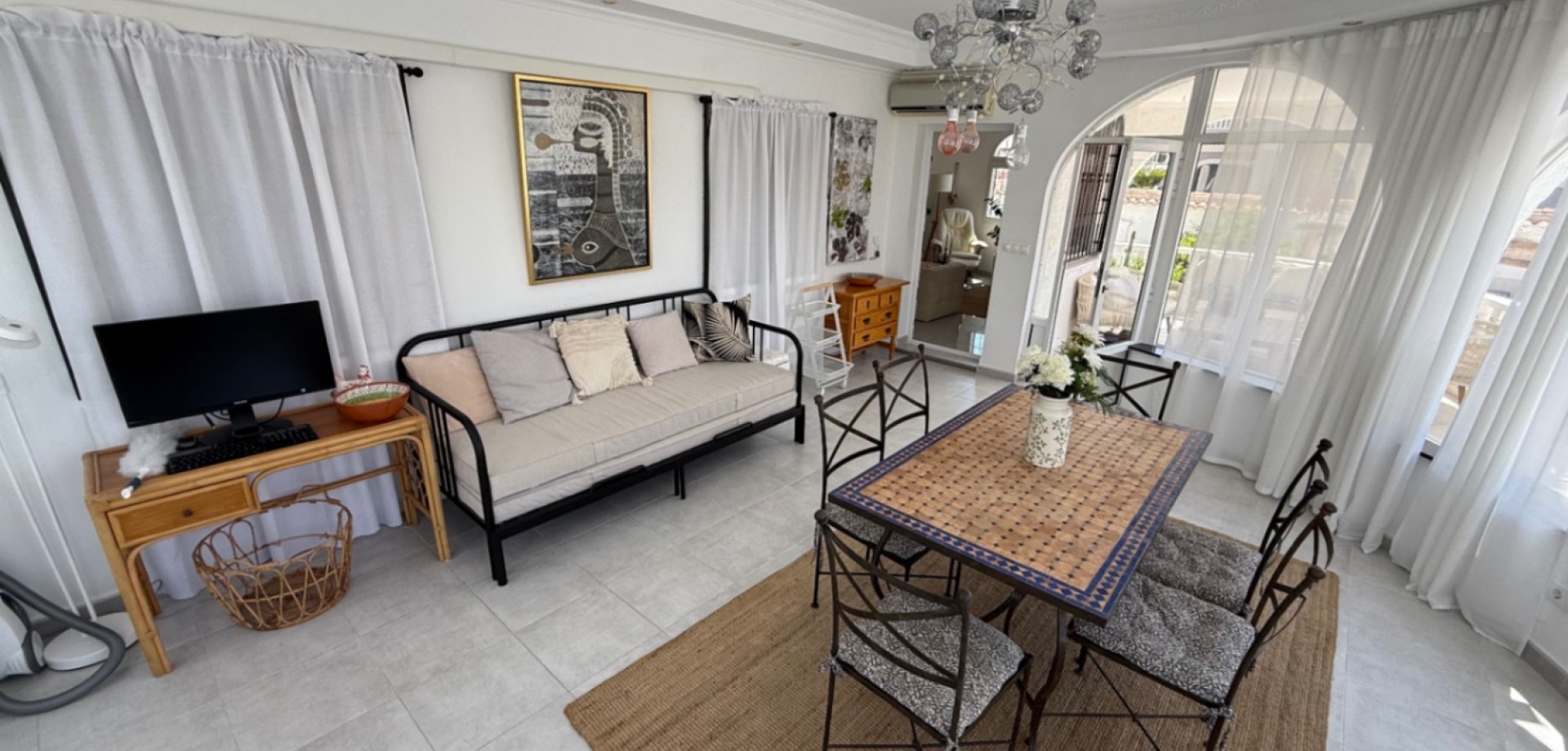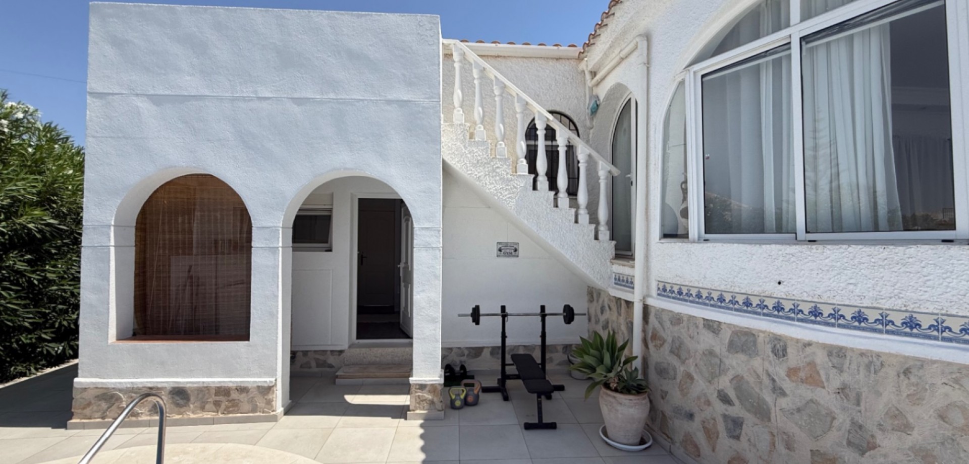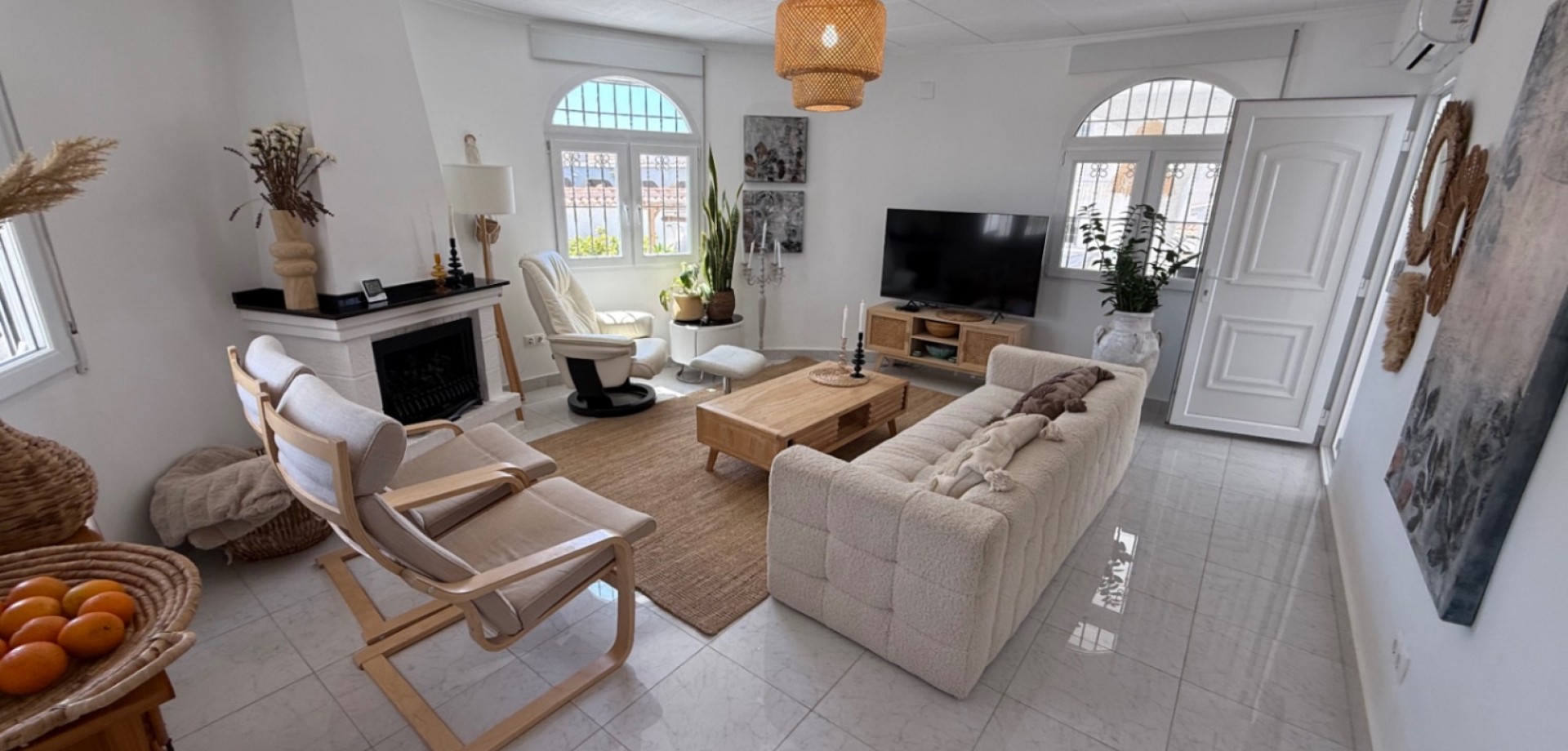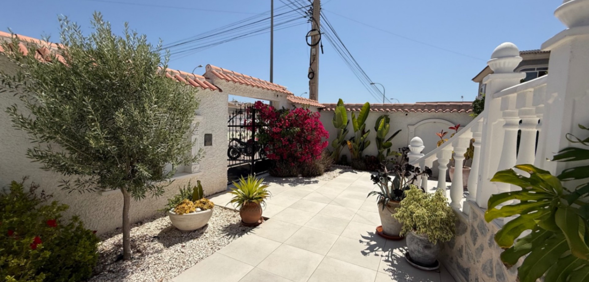 Presentamos esta villa independiente de tres habitaciones y dos baños, elegantemente presentada, idealmente ubicada en el codiciado vecindario de El Chaparral / San Luis - Costa Blanca Sur. Situada en una generosa parcela de aproximadamente 800 m², esta propiedad ofrece una rara combinación de privacidad, espacio y estilo refinado. Rodeada de muros de privacidad y con acceso a través de una entrada segura, la villa ofrece una atmósfera tranquila y acogedora desde el momento de su llegada. El hogar ha sido cuidadosamente actualizado a un estándar alto, combinando un diseño nórdico limpio con la calidez de los elementos tradicionales españoles. El resultado es un interior armonioso y acogedor que se siente tanto contemporáneo como atemporal. La espaciosa veranda acristalada da a la impresionante área de la piscina con piscina de agua salada y jardines cuidadosamente mantenidos y de bajo mantenimiento, creando una experiencia de vida interior-exterior sin interrupciones que se puede disfrutar durante todo el año. Los jardines de la propiedad tienen una codiciada orientación suroeste, bañados por la luz natural durante todo el día, perfectos para quienes buscan sol y entretenimiento al aire libre. Varias zonas de descanso, piscina de agua salada, áreas de comedor, solárium con vistas al lago salado y cocina exterior completan realmente este oasis al aire libre. Los jardines están llenos de árboles frutales, incluyendo: naranja, naranja sanguina, mandarina, limón, mango y olivo. Las características adicionales incluyen aparcamiento fuera de la carretera, una zona de almacenamiento dedicada, un baño completo exterior para la comodidad junto a la piscina y exteriors bellamente alicatados diseñados para un fácil mantenimiento. Cada rincón de esta casa ha sido cuidadosamente considerado para maximizar el confort, el estilo y la funcionalidad. Idealmente situada a pocos momentos de las comodidades locales, con fácil acceso a Torrevieja, el centro comercial Habaneras y las playas de la Costa Blanca, esta villa ofrece tanto conveniencia como un entorno de vida sereno. Ya sea que esté buscando una residencia permanente, un refugio de vacaciones o una inversión inteligente, esta es una propiedad que no querrá perderse.