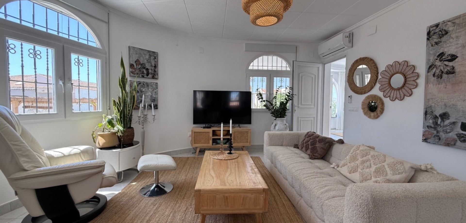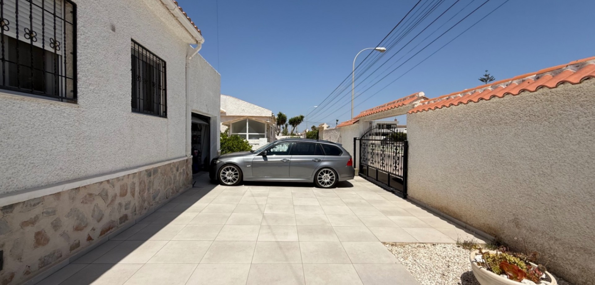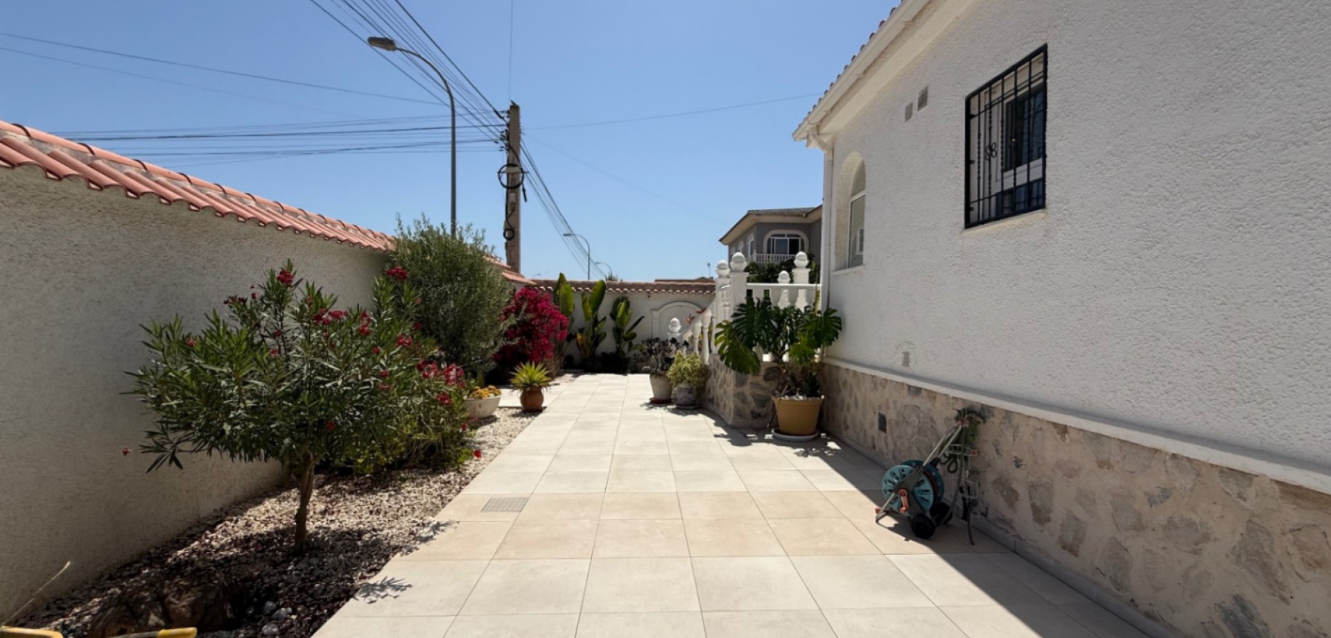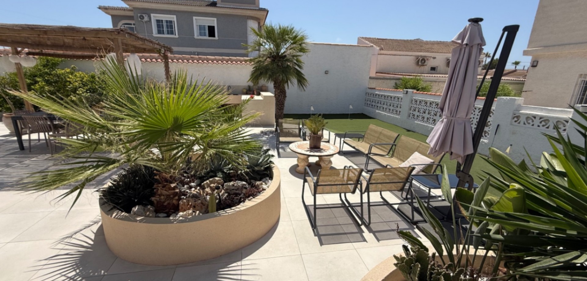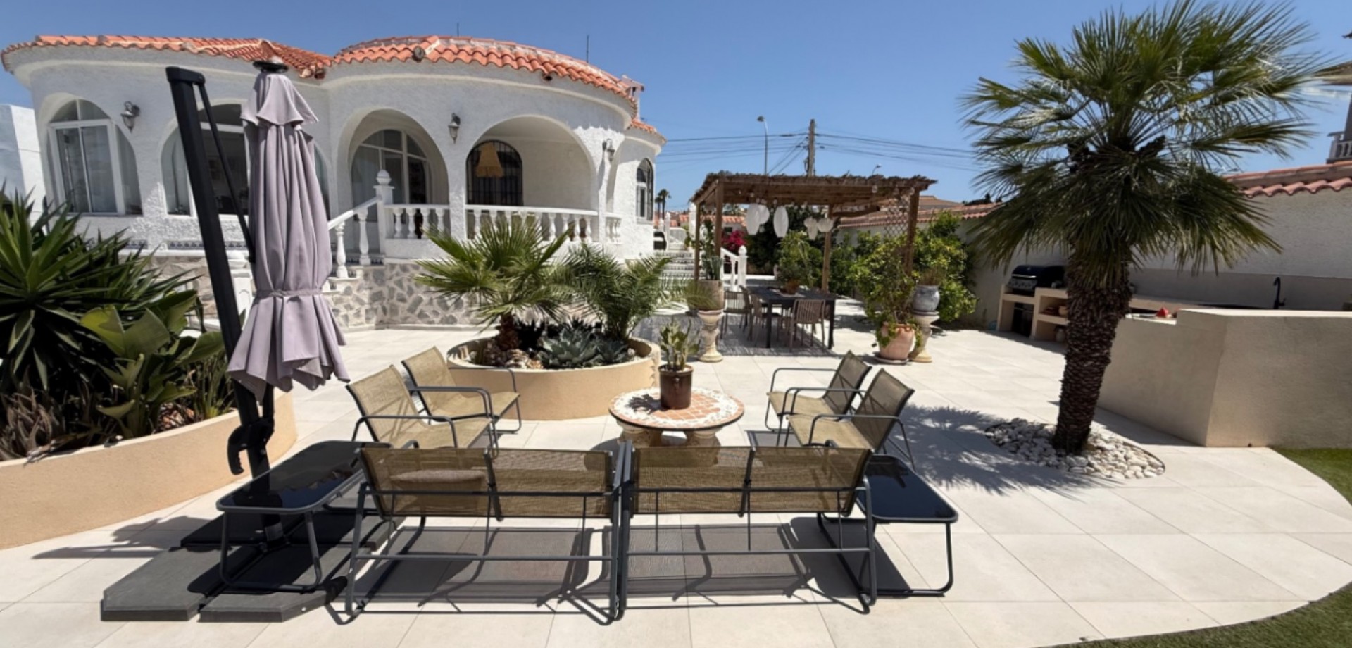 Presentamos esta villa independiente de tres habitaciones y dos baños, elegantemente presentada, idealmente ubicada en el codiciado vecindario de El Chaparral / San Luis - Costa Blanca Sur. Situada en una generosa parcela de aproximadamente 800 m², esta propiedad ofrece una rara combinación de privacidad, espacio y estilo refinado. Rodeada de muros de privacidad y con acceso a través de una entrada segura, la villa ofrece una atmósfera tranquila y acogedora desde el momento de su llegada. El hogar ha sido cuidadosamente actualizado a un estándar alto, combinando un diseño nórdico limpio con la calidez de los elementos tradicionales españoles. El resultado es un interior armonioso y acogedor que se siente tanto contemporáneo como atemporal. La espaciosa veranda acristalada da a la impresionante área de la piscina con piscina de agua salada y jardines cuidadosamente mantenidos y de bajo mantenimiento, creando una experiencia de vida interior-exterior sin interrupciones que se puede disfrutar durante todo el año. Los jardines de la propiedad tienen una codiciada orientación suroeste, bañados por la luz natural durante todo el día, perfectos para quienes buscan sol y entretenimiento al aire libre. Varias zonas de descanso, piscina de agua salada, áreas de comedor, solárium con vistas al lago salado y cocina exterior completan realmente este oasis al aire libre. Los jardines están llenos de árboles frutales, incluyendo: naranja, naranja sanguina, mandarina, limón, mango y olivo. Las características adicionales incluyen aparcamiento fuera de la carretera, una zona de almacenamiento dedicada, un baño completo exterior para la comodidad junto a la piscina y exteriors bellamente alicatados diseñados para un fácil mantenimiento. Cada rincón de esta casa ha sido cuidadosamente considerado para maximizar el confort, el estilo y la funcionalidad. Idealmente situada a pocos momentos de las comodidades locales, con fácil acceso a Torrevieja, el centro comercial Habaneras y las playas de la Costa Blanca, esta villa ofrece tanto conveniencia como un entorno de vida sereno. Ya sea que esté buscando una residencia permanente, un refugio de vacaciones o una inversión inteligente, esta es una propiedad que no querrá perderse.