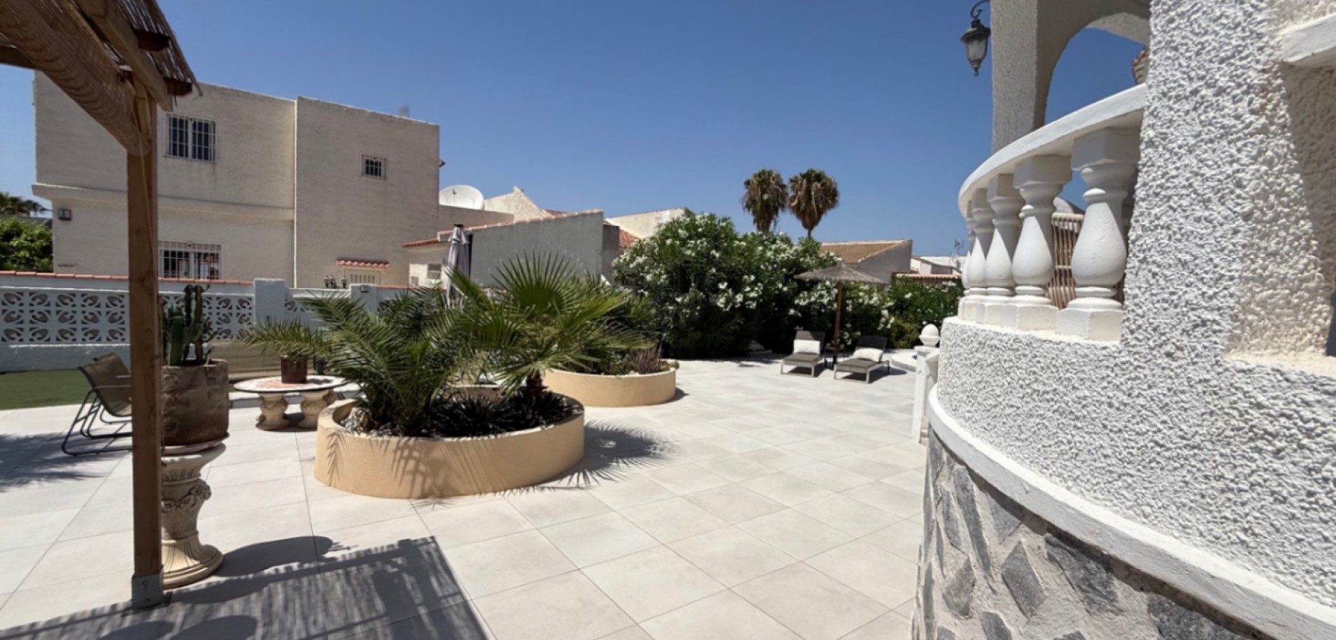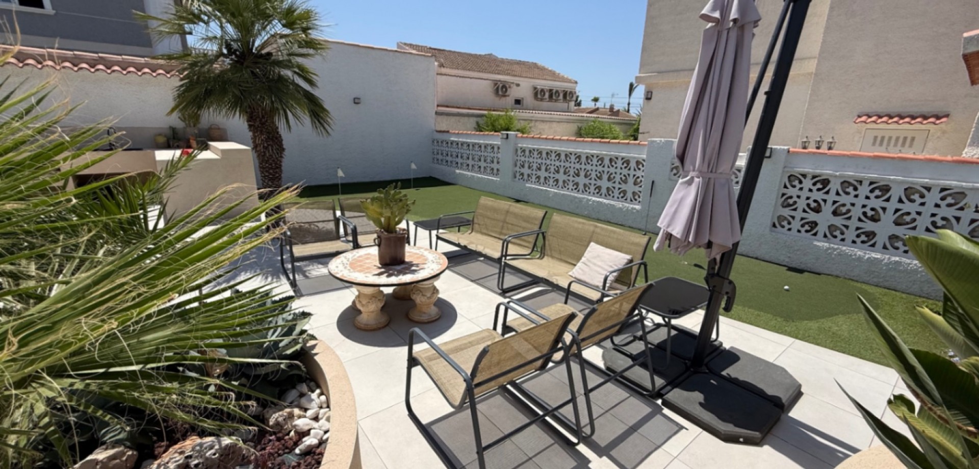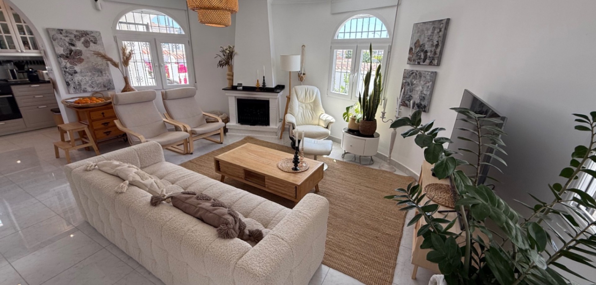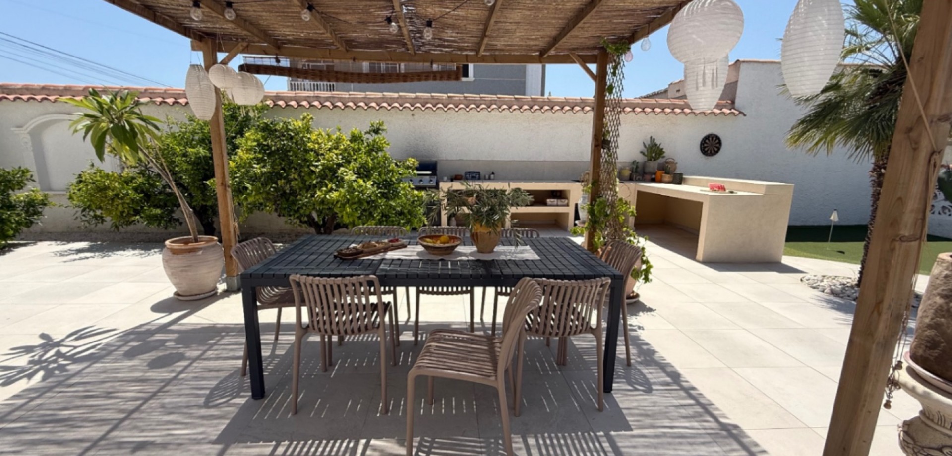 Presentamos esta villa independiente de tres habitaciones y dos baños, elegantemente presentada, idealmente ubicada en el codiciado vecindario de El Chaparral / San Luis - Costa Blanca Sur. Situada en una generosa parcela de aproximadamente 800 m², esta propiedad ofrece una rara combinación de privacidad, espacio y estilo refinado. Rodeada de muros de privacidad y con acceso a través de una entrada segura, la villa ofrece una atmósfera tranquila y acogedora desde el momento de su llegada. El hogar ha sido cuidadosamente actualizado a un estándar alto, combinando un diseño nórdico limpio con la calidez de los elementos tradicionales españoles. El resultado es un interior armonioso y acogedor que se siente tanto contemporáneo como atemporal. La espaciosa veranda acristalada da a la impresionante área de la piscina con piscina de agua salada y jardines cuidadosamente mantenidos y de bajo mantenimiento, creando una experiencia de vida interior-exterior sin interrupciones que se puede disfrutar durante todo el año. Los jardines de la propiedad tienen una codiciada orientación suroeste, bañados por la luz natural durante todo el día, perfectos para quienes buscan sol y entretenimiento al aire libre. Varias zonas de descanso, piscina de agua salada, áreas de comedor, solárium con vistas al lago salado y cocina exterior completan realmente este oasis al aire libre. Los jardines están llenos de árboles frutales, incluyendo: naranja, naranja sanguina, mandarina, limón, mango y olivo. Las características adicionales incluyen aparcamiento fuera de la carretera, una zona de almacenamiento dedicada, un baño completo exterior para la comodidad junto a la piscina y exteriors bellamente alicatados diseñados para un fácil mantenimiento. Cada rincón de esta casa ha sido cuidadosamente considerado para maximizar el confort, el estilo y la funcionalidad. Idealmente situada a pocos momentos de las comodidades locales, con fácil acceso a Torrevieja, el centro comercial Habaneras y las playas de la Costa Blanca, esta villa ofrece tanto conveniencia como un entorno de vida sereno. Ya sea que esté buscando una residencia permanente, un refugio de vacaciones o una inversión inteligente, esta es una propiedad que no querrá perderse.