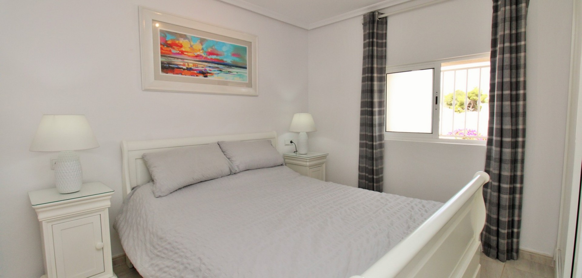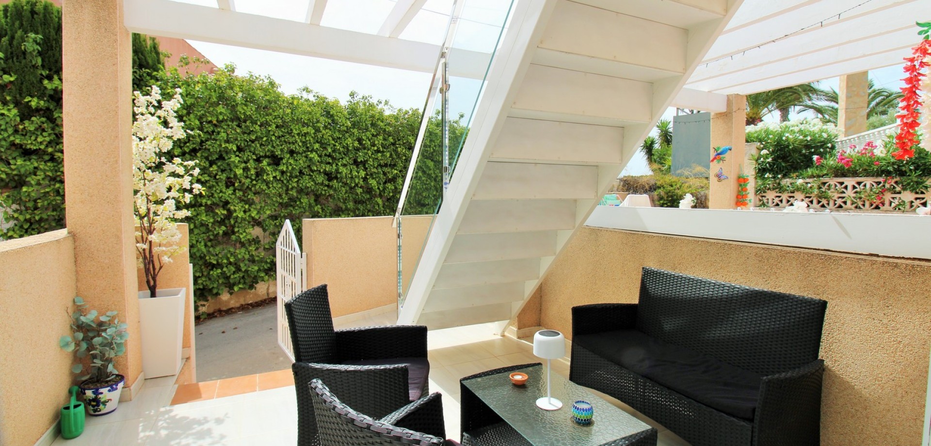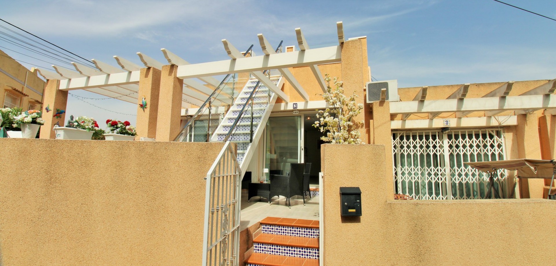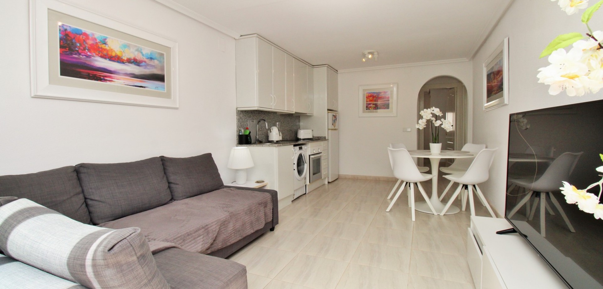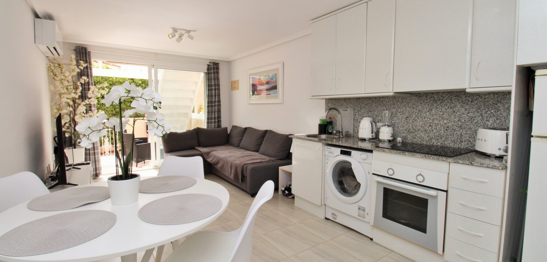 Este encantador bungalow de una sola planta se encuentra en una zona tranquila y muy solicitada de Villamartín, a pocos minutos a pie de bares, restaurantes, tiendas y transporte público. Luminoso, acogedor y muy bien presentado, la propiedad se vende parcialmente amueblada e incluye electrodomésticos, lista para disfrutar desde el primer día. La vivienda dispone de un amplio salón-comedor de concepto abierto con cocina moderna totalmente equipada, creando un espacio cómodo y funcional. Cuenta con un dormitorio doble con armarios empotrados y un elegante baño completamente equipado. Las grandes ventanas permiten la entrada de abundante luz natural, proporcionando un ambiente luminoso y agradable. En la parte frontal se encuentra una terraza privada con suelo de baldosa, ideal para disfrutar del clima mediterráneo. Una escalera exterior conduce al amplio solárium privado en la azotea, desde donde se pueden disfrutar vistas abiertas al mar y al entorno, perfecto para relajarse o reunirse con amigos. La propiedad está situada en una tranquila calle privada sin tráfico, ofreciendo un entorno relajado pero cerca de todos los servicios. También dispone de internet de fibra óptica de alta velocidad (FTTH) y, al no contar con piscina comunitaria, los gastos de comunidad son bajos. A pocos minutos a pie se encuentra el nuevo Marimba Blue pool bar con gran piscina, así como un nuevo campo de mini golf, perfecto para pasar un día relajado. Las playas de Orihuela Costa, el centro comercial Zenia Boulevard y varios campos de golf se encuentran a menos de 10 minutos en coche, lo que convierte esta propiedad en una excelente vivienda vacacional, inversión o residencia permanente.