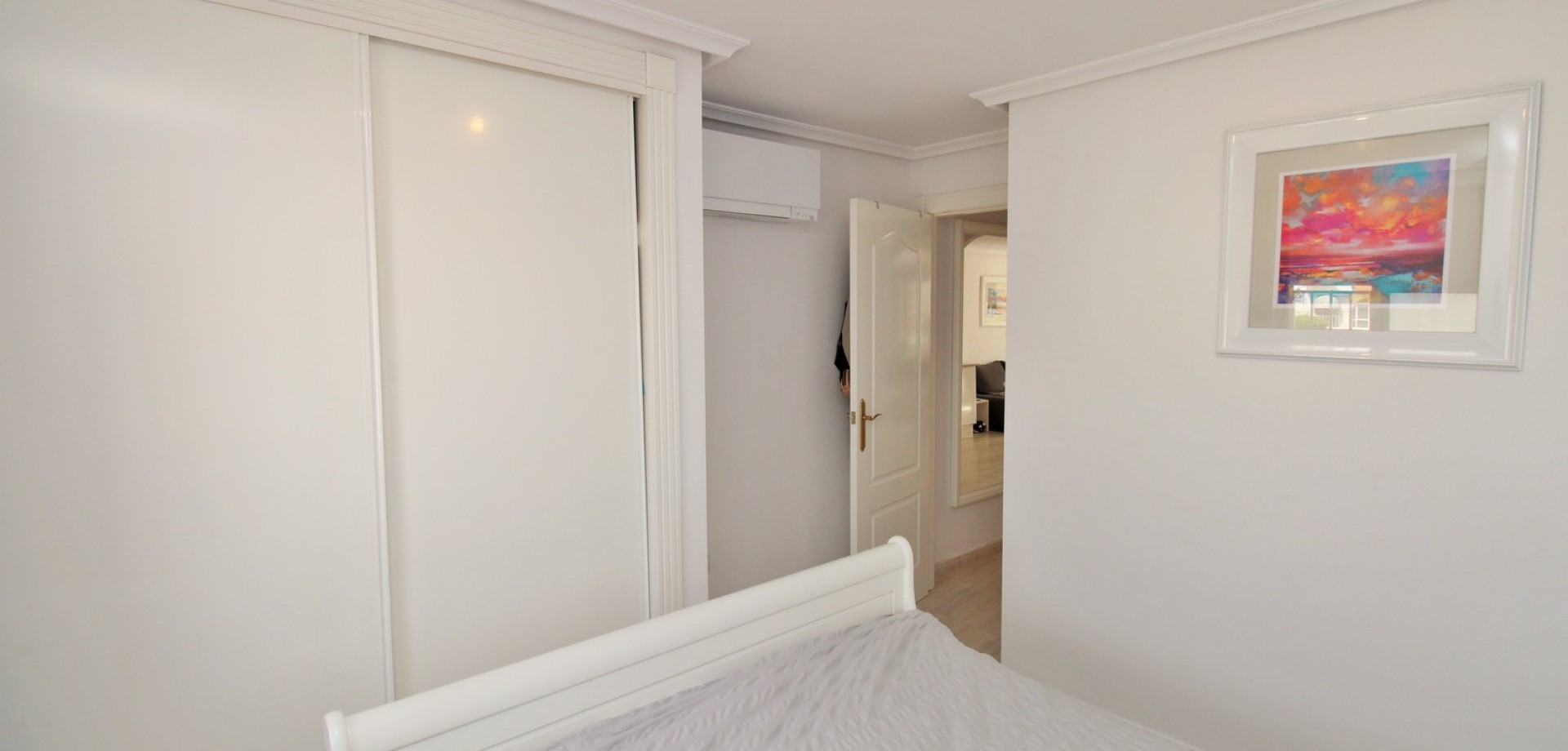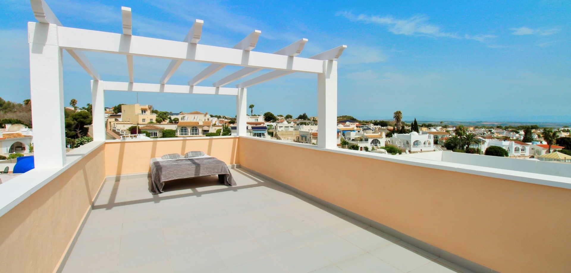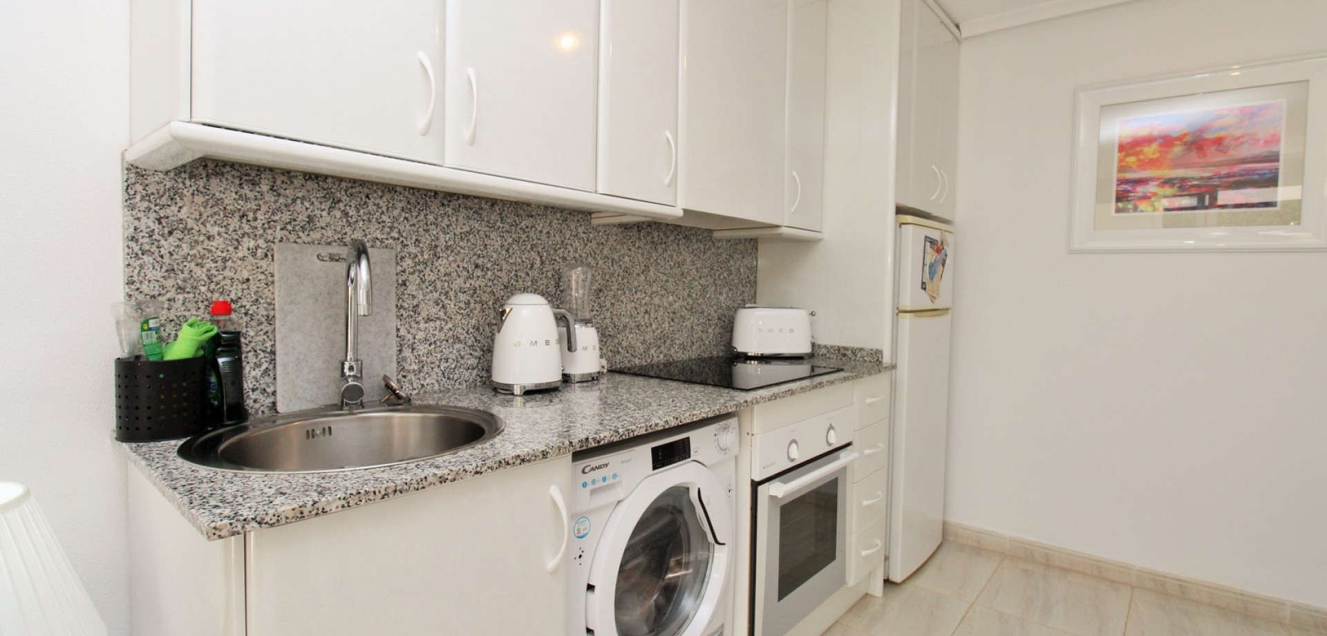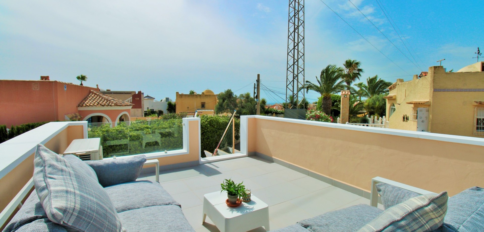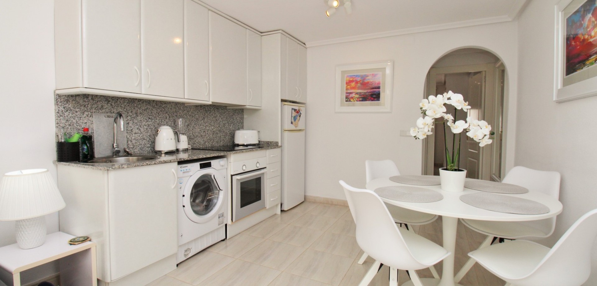 Este encantador bungalow de una sola planta se encuentra en una zona tranquila y muy solicitada de Villamartín, a pocos minutos a pie de bares, restaurantes, tiendas y transporte público. Luminoso, acogedor y muy bien presentado, la propiedad se vende parcialmente amueblada e incluye electrodomésticos, lista para disfrutar desde el primer día. La vivienda dispone de un amplio salón-comedor de concepto abierto con cocina moderna totalmente equipada, creando un espacio cómodo y funcional. Cuenta con un dormitorio doble con armarios empotrados y un elegante baño completamente equipado. Las grandes ventanas permiten la entrada de abundante luz natural, proporcionando un ambiente luminoso y agradable. En la parte frontal se encuentra una terraza privada con suelo de baldosa, ideal para disfrutar del clima mediterráneo. Una escalera exterior conduce al amplio solárium privado en la azotea, desde donde se pueden disfrutar vistas abiertas al mar y al entorno, perfecto para relajarse o reunirse con amigos. La propiedad está situada en una tranquila calle privada sin tráfico, ofreciendo un entorno relajado pero cerca de todos los servicios. También dispone de internet de fibra óptica de alta velocidad (FTTH) y, al no contar con piscina comunitaria, los gastos de comunidad son bajos. A pocos minutos a pie se encuentra el nuevo Marimba Blue pool bar con gran piscina, así como un nuevo campo de mini golf, perfecto para pasar un día relajado. Las playas de Orihuela Costa, el centro comercial Zenia Boulevard y varios campos de golf se encuentran a menos de 10 minutos en coche, lo que convierte esta propiedad en una excelente vivienda vacacional, inversión o residencia permanente.
