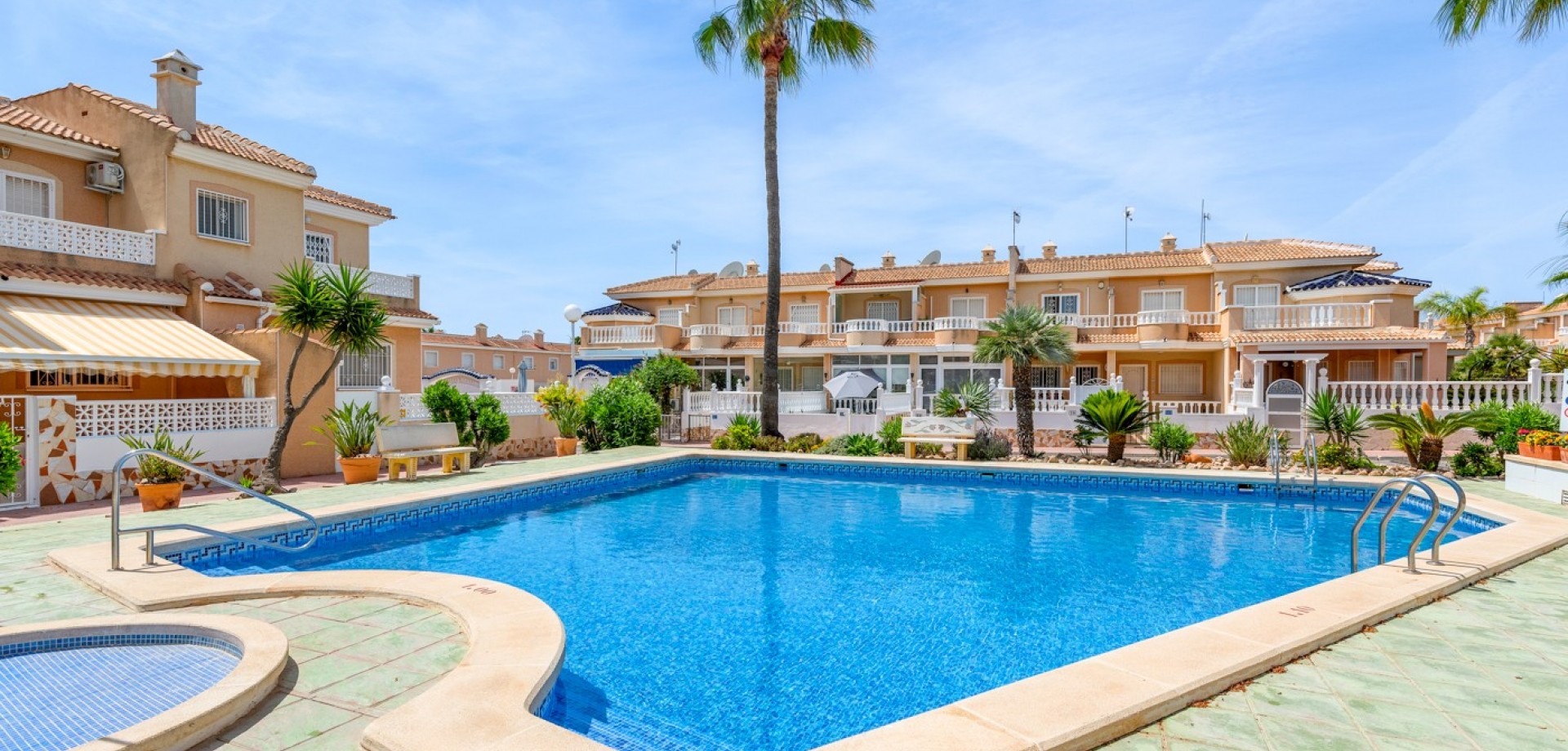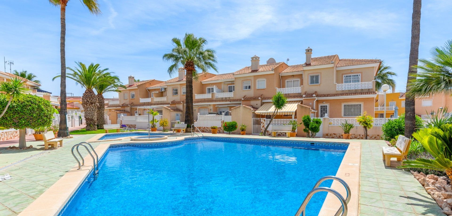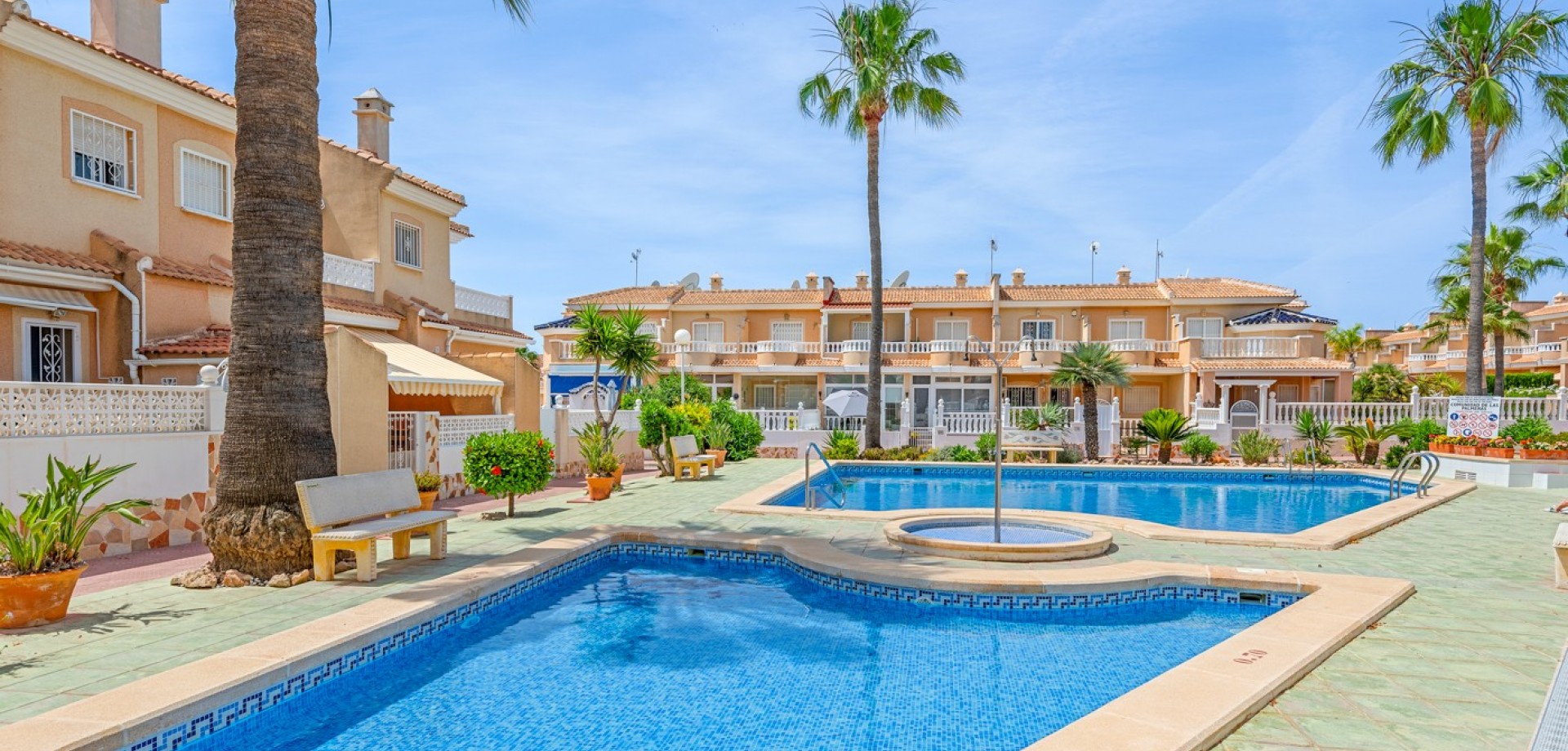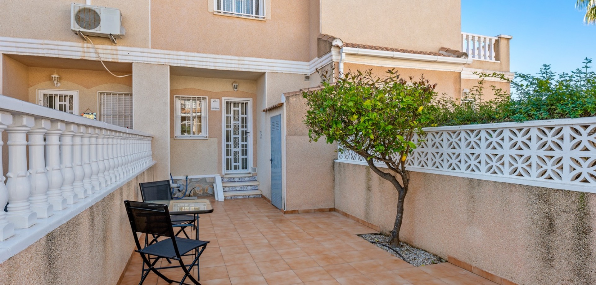 Descubre este encantador adosado en el residencial Las Palmeras, situado en Ciudad Quesada, una de las zonas más demandadas por su tranquilidad y cercanía a todos los servicios. La vivienda se distribuye en dos plantas y cuenta con dos fantásticas terrazas que permiten disfrutar del sol durante todo el día: la terraza delantera recibe el sol de la mañana, perfecta para empezar el día al aire libre, mientras que la terraza trasera ofrece sol por la tarde, ideal para relajarse o disfrutar de reuniones con familia y amigos. En la planta principal encontramos un amplio y luminoso salón, un aseo de cortesía y una cocina independiente con acceso directo a la terraza trasera, donde además hay un espacioso trastero con zona de lavandería. En la planta superior se encuentran dos dormitorios, destacando el dormitorio principal de matrimonio con acceso a una agradable terraza privada. En esta planta también se ubica el baño principal. La vivienda forma parte de una cuidada comunidad que dispone de piscina comunitaria y una plaza de aparcamiento asignada por vivienda. Su excelente ubicación permite disfrutar de la tranquilidad sin renunciar a la comodidad: a solo 10 minutos de la playa y a 5 minutos de supermercados, restaurantes y todo tipo de servicios. Una oportunidad ideal tanto como vivienda habitual o casa de vacaciones