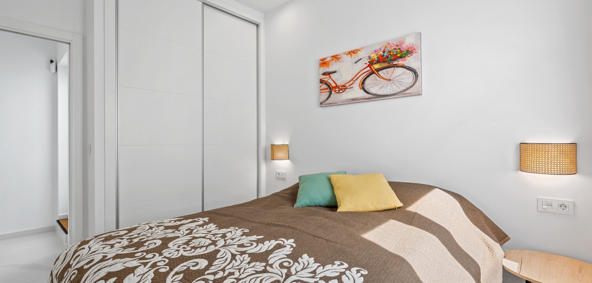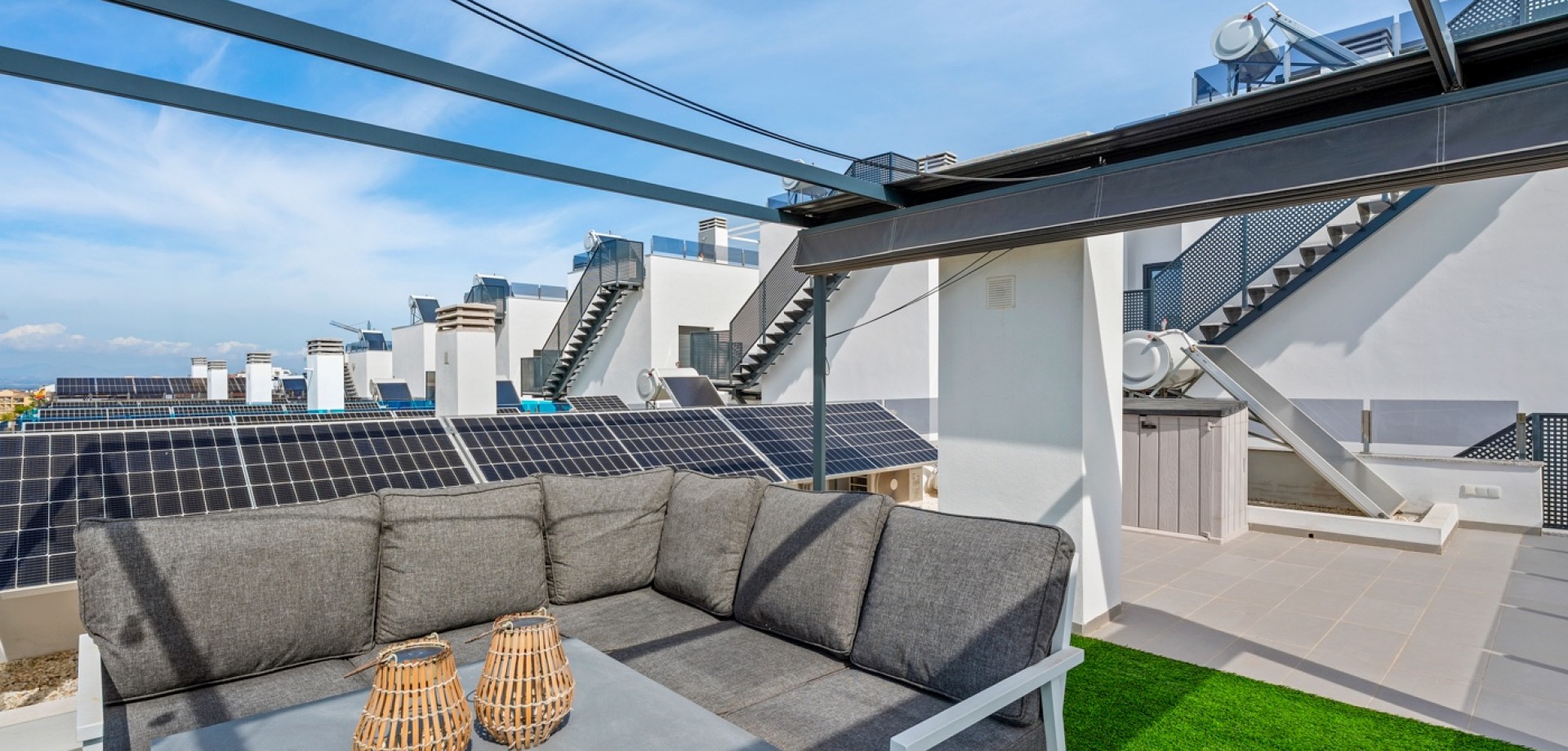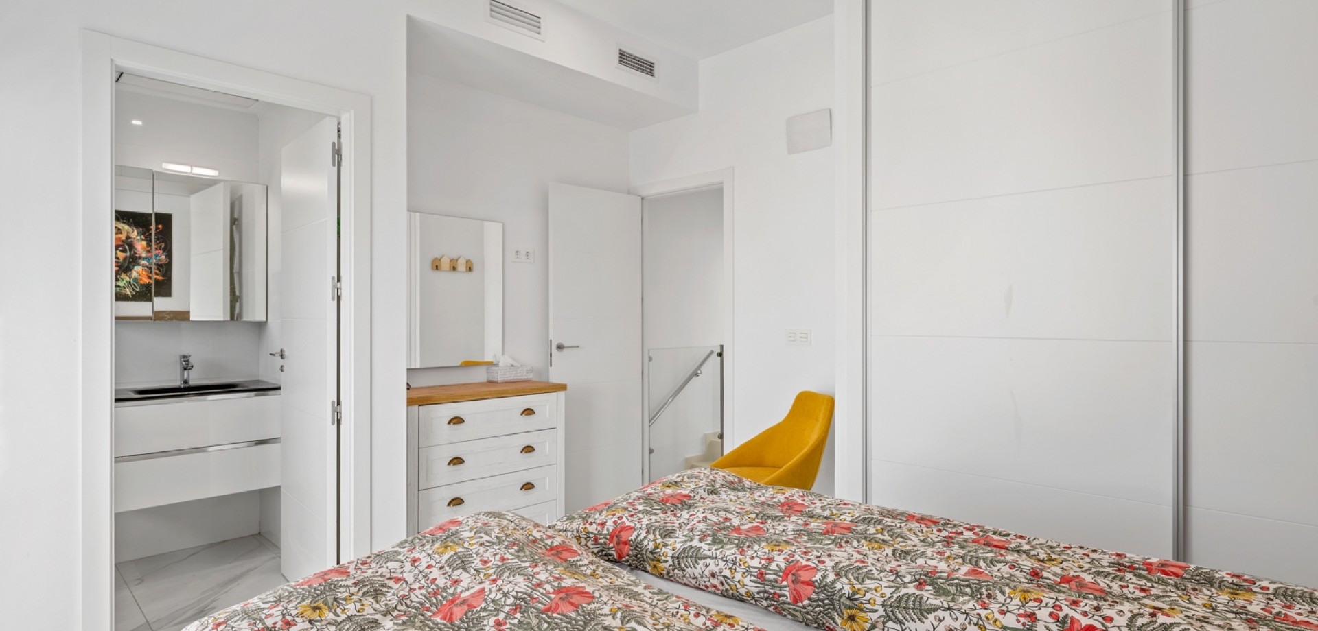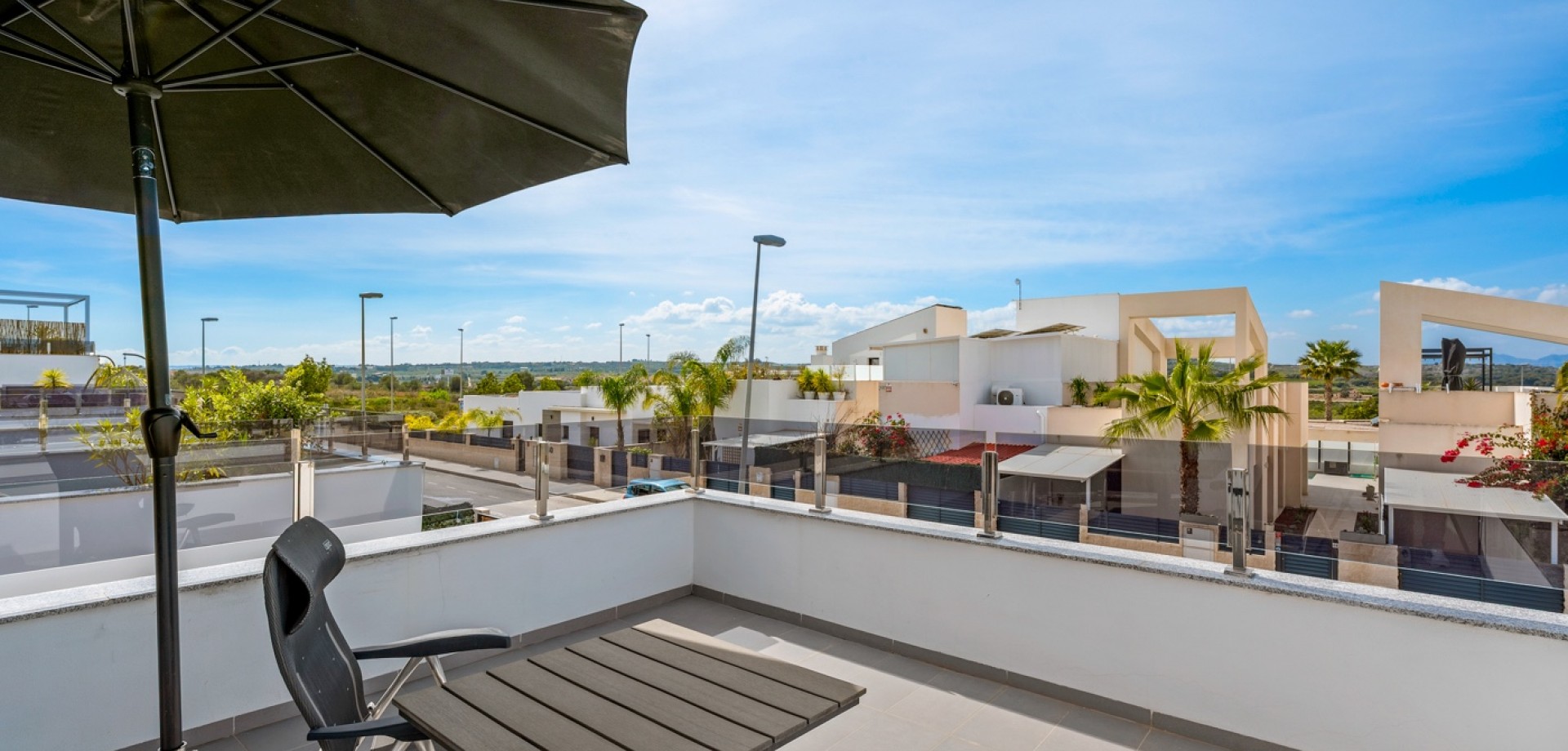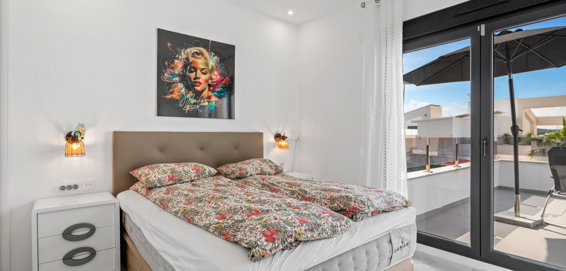 Esta moderna villa de 3 dormitorios en Benijófar, construida en 2023, ofrece un diseño elegante, piscina privada climatizada y excelentes espacios exteriores. La vivienda tiene una superficie construida de 111 m², distribuida en dos plantas, y consta de 3 dormitorios dobles y 3 baños. En la planta principal se encuentra un dormitorio doble, un baño y un luminoso salón-comedor con cocina de concepto abierto. Grandes puertas correderas desde el salón proporcionan acceso directo al jardín y a la zona de la piscina, creando una perfecta conexión entre interior y exterior. En la primera planta hay dos amplios dormitorios dobles, ambos con baño en suite. El dormitorio principal tiene acceso a una terraza privada, y desde esta planta también se accede a la gran terraza solárium. La villa fue terminada en 2023 y está equipada con varias características modernas, entre ellas: Aire acondicionado centralizado (frío/calor)Suelo radiante en el salón y en todos los bañosSistema de filtración de agua por ósmosis en la cocinaArmarios empotrados en todos los dormitoriosPaneles solares para agua caliente y electricidad Zona exteriorLa propiedad se sitúa en una parcela orientada al oeste con un bonito espacio exterior. El jardín cuenta con una piscina privada climatizada, zonas exteriores para relajarse y comer, y aparcamiento privado dentro de la parcela con puerta automática. También dispone de un área de trabajo con banco y un trastero adicional. Se han instalado varios toldos para proporcionar sombra durante los meses más cálidos. Además del jardín, la villa ofrece una terraza en la primera planta y un amplio solárium con vistas a las montañas, con espacio para zonas de descanso y entretenimiento. La terraza cuenta con zonas alicatadas y con césped artificial, además de un gran toldo para sombra. UbicaciónLa villa se encuentra a poca distancia a pie de la calle principal de Benijófar, donde se puede encontrar una amplia oferta de servicios, restaurantes, cafeterías y tiendas.