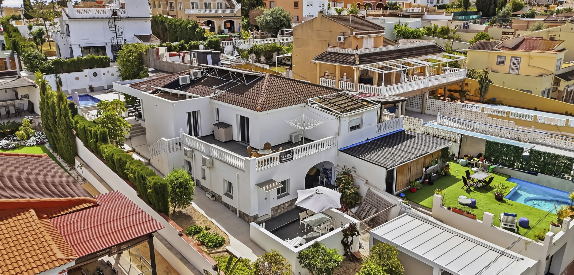Villa adosada con piscina privada y apartamento independiente en Los Balcones, Torrevieja. Vivienda distribuida en dos plantas independientes, ideal para uso familiar o inversión con alquiler turístico. Cuenta con un apartamento independiente con licencia turística, con 2 dormitorios, 1 baño, salón, cocina, terraza y aire acondicionado. La vivienda principal dispone de 1 dormitorio con baño en suite, posibilidad de un segundo dormitorio, baño de invitados, cocina moderna equipada, salón y terraza. Situada sobre una parcela de 462 m² con jardín, piscina privada climatizada y varias terrazas con vistas al parque. Ubicada en una zona residencial tranquila, cerca de servicios y del centro de Torrevieja. Características destacadas 3 dormitorios 3 baños 170 m² construidos Parcela de 462 m² Vivienda en 2 plantas independientes Apartamento independiente con licencia turística Piscina privada climatizada Jardín Varias terrazas Vistas al parque Orientación este (piscina) y oeste (fachada principal) Cocina moderna equipada Aire acondicionado Semi amueblado Ventanas con doble acristalamiento Estilo moderno 12 paneles solares Garaje (preparado para coche eléctrico) Zona tranquila y residencial Cerca de hospital Entorno natural A poca distancia a pie de comercios, bares y restaurantes Cerca del centro de Torrevieja y Orihuela Costa Gastos anuales: IBI: 560 €