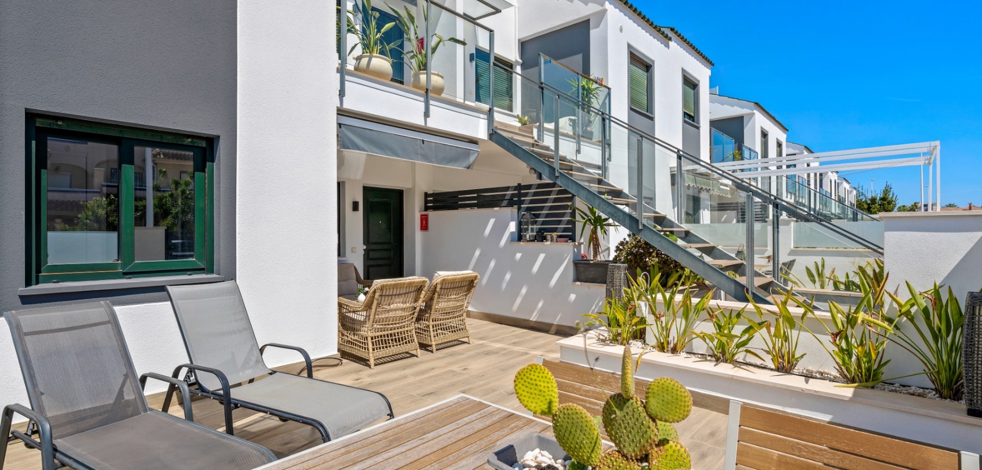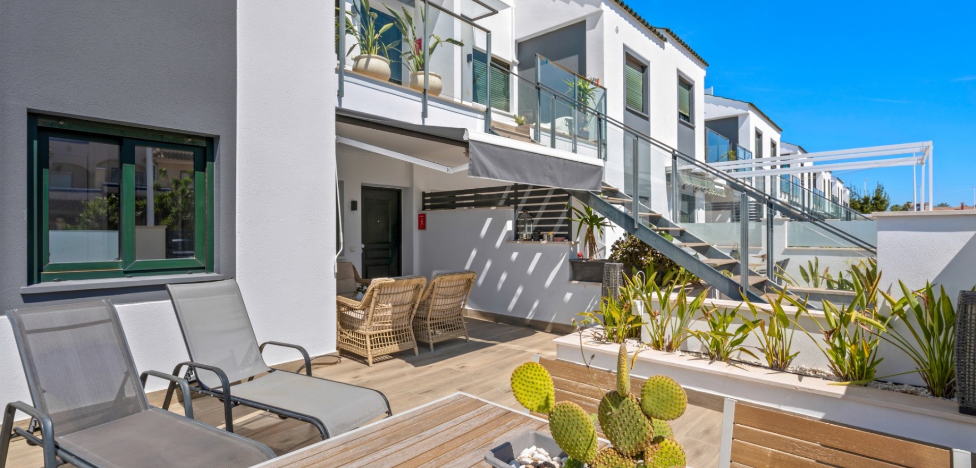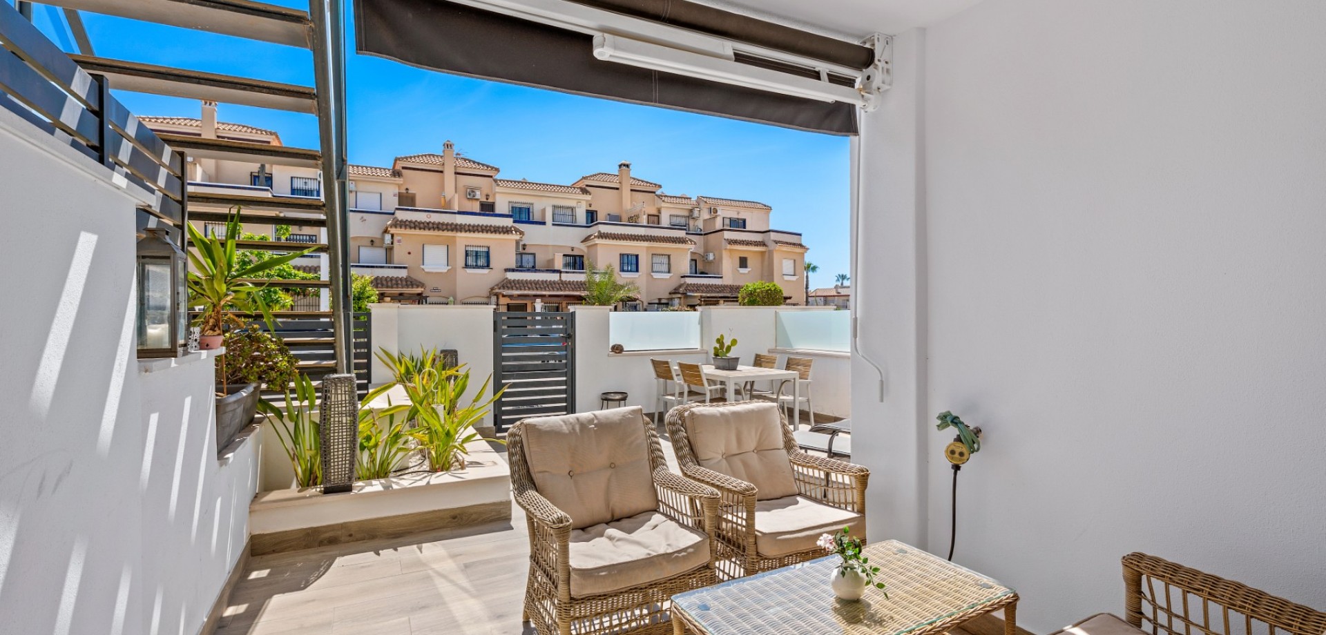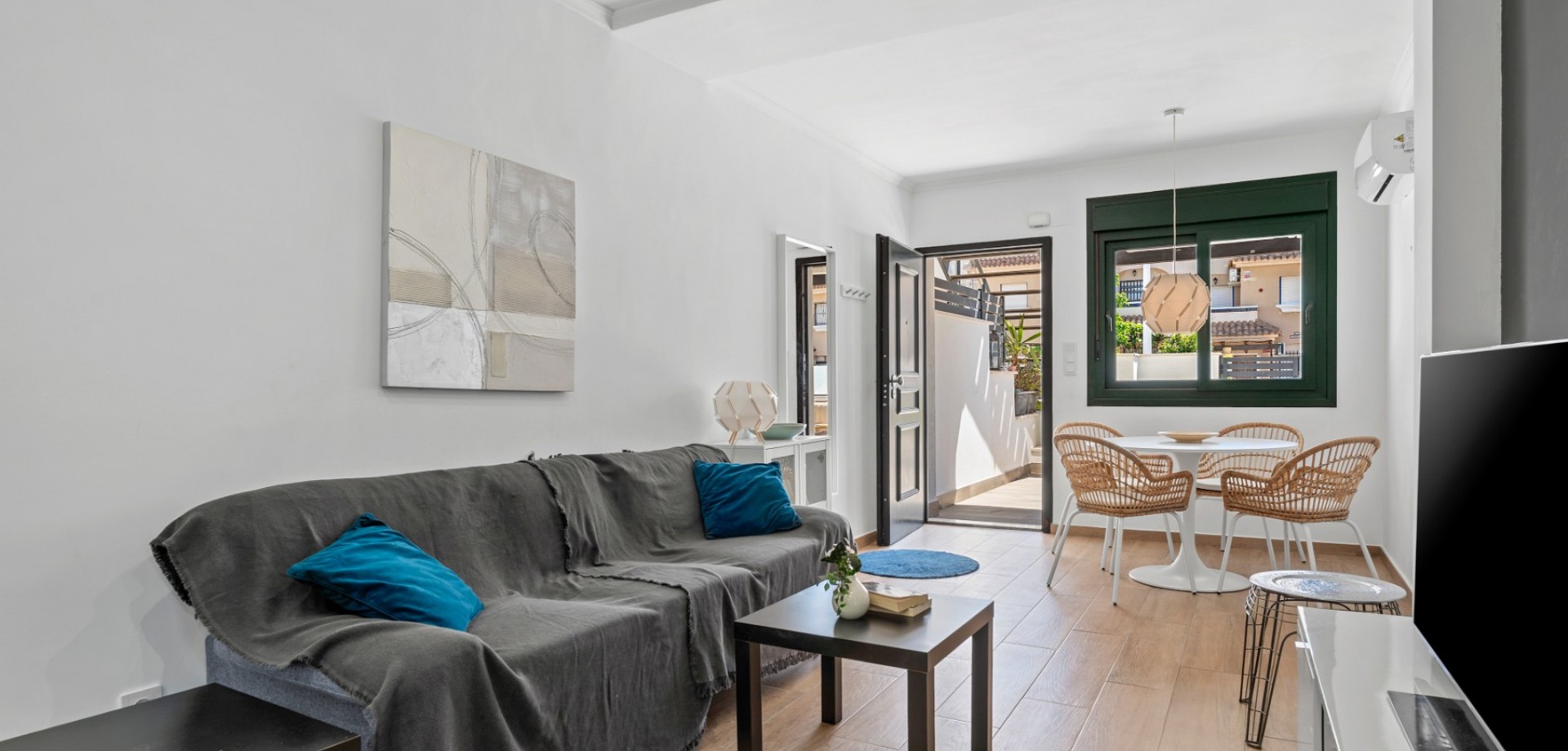 Este moderno apartamento en planta baja se encuentra en la codiciada zona de La Zenia, a pocos pasos de la playa y cerca de tiendas, restaurantes y todos los servicios. Con acceso directo desde la calle, ofrece comodidad y un estilo de vida contemporáneo y confortable en la Costa Blanca. La propiedad cuenta con 2 dormitorios y 1 baño, con un diseño luminoso y práctico, ideal tanto para vacaciones como para residencia permanente. En el corazón de la casa se encuentra un elegante salón-comedor diáfano con una moderna cocina, que crea un ambiente amplio y acogedor. Desde el salón se accede directamente a una gran terraza frontal, perfecta para comer al aire libre, relajarse o disfrutar del clima mediterráneo. Ubicado en un complejo residencial bien mantenido, los residentes disfrutan de una hermosa piscina comunitaria, ideal para disfrutar del soleado estilo de vida español. El apartamento también incluye aparcamiento subterráneo, lo que aporta mayor comodidad y seguridad. Gracias a su diseño moderno, su excelente ubicación y su amplio espacio exterior, esta propiedad es una opción ideal como casa de vacaciones, inversión para alquiler o residencia permanente en La Zenia.