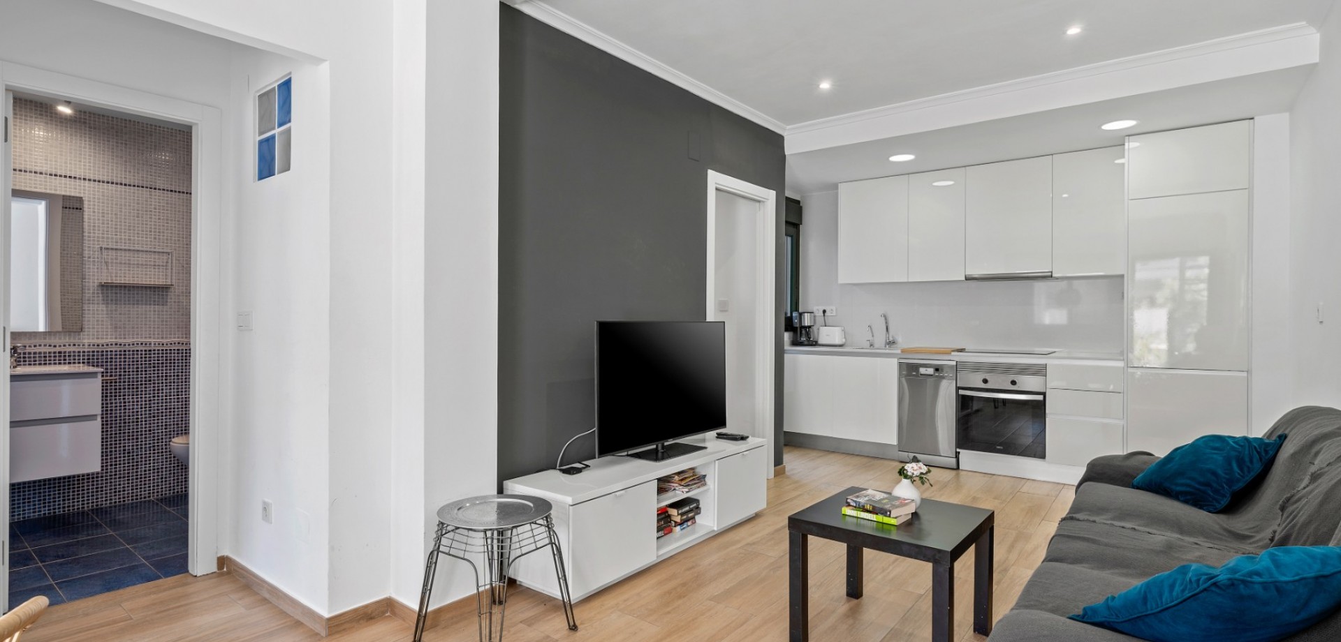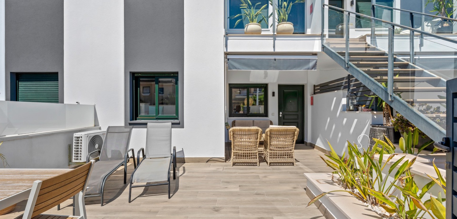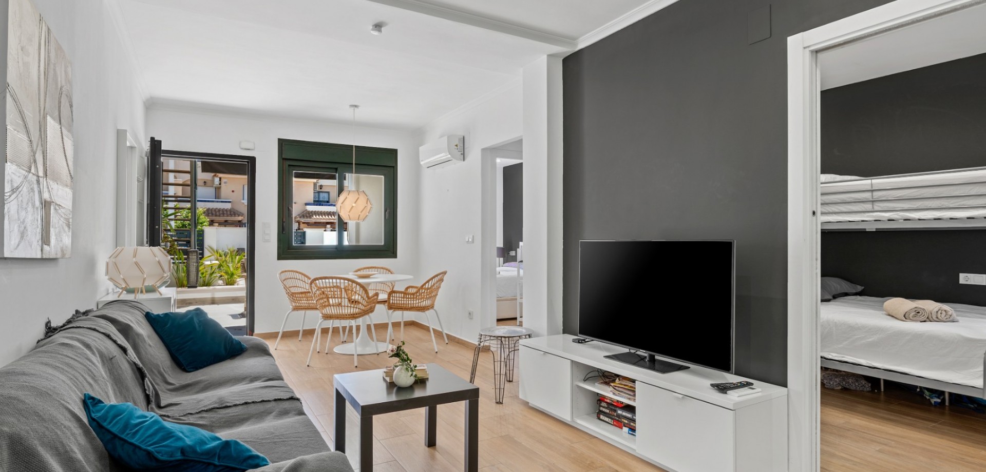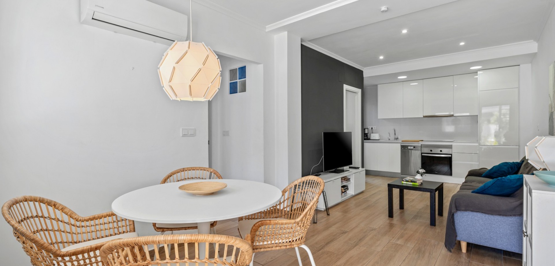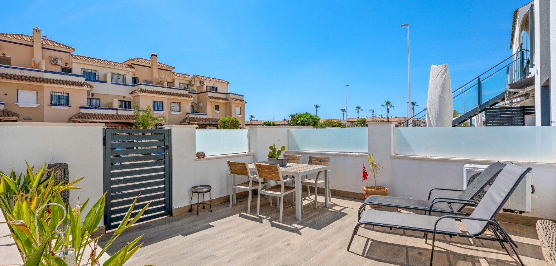 Este moderno apartamento en planta baja se encuentra en la codiciada zona de La Zenia, a pocos pasos de la playa y cerca de tiendas, restaurantes y todos los servicios. Con acceso directo desde la calle, ofrece comodidad y un estilo de vida contemporáneo y confortable en la Costa Blanca. La propiedad cuenta con 2 dormitorios y 1 baño, con un diseño luminoso y práctico, ideal tanto para vacaciones como para residencia permanente. En el corazón de la casa se encuentra un elegante salón-comedor diáfano con una moderna cocina, que crea un ambiente amplio y acogedor. Desde el salón se accede directamente a una gran terraza frontal, perfecta para comer al aire libre, relajarse o disfrutar del clima mediterráneo. Ubicado en un complejo residencial bien mantenido, los residentes disfrutan de una hermosa piscina comunitaria, ideal para disfrutar del soleado estilo de vida español. El apartamento también incluye aparcamiento subterráneo, lo que aporta mayor comodidad y seguridad. Gracias a su diseño moderno, su excelente ubicación y su amplio espacio exterior, esta propiedad es una opción ideal como casa de vacaciones, inversión para alquiler o residencia permanente en La Zenia.