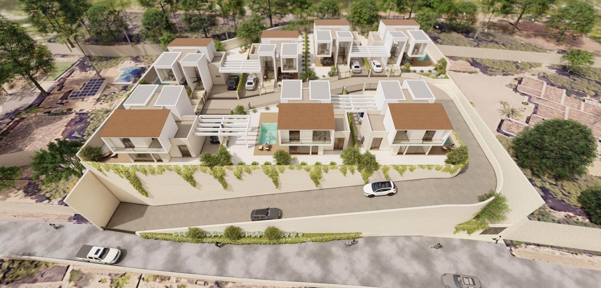 Nieuwbouw van 7 villa's in La Nucía Ontdek deze prachtige nieuwbouwvilla's in La Nucía, elk met privézwembad en parkeerplaats. Deze onafhankelijke villa's hebben 3 slaapkamers en 3 badkamers, verdeeld over twee verdiepingen. Op de begane grond bevindt zich een van de slaapkamers, die gemakkelijk toegankelijk is. Op de eerste verdieping biedt een terras van 14 m² een helder, onbelemmerd uitzicht en sommige woningen hebben uitzicht op zee. Modern wonen in een besloten en veilige omheinde gemeenschap Dit exclusieve project is volledig omheind en de villa's zijn toegankelijk via een privéweg, zodat de bewoners verzekerd zijn van optimale privacy en veiligheid. Elke villa is ontworpen met modern comfort in het achterhoofd, perfect om het hele jaar door te wonen of voor een ontspannen vakantieverblijf. Toplocatie in La Nucía Deze villa's liggen in een gerenommeerde woonwijk van La Nucía en worden omringd door essentiële dagelijkse voorzieningen, wat het leven gemakkelijk en aangenaam maakt. Op slechts 6 km van de populaire kustbestemmingen Benidorm en El Albir hebben bewoners gemakkelijk toegang tot prachtige stranden, een verscheidenheid aan entertainmentopties en een bruisende gastronomische scene. Nabijheid van belangrijke bezienswaardigheden Benidorm: 6 km Strand El Albir: 6 km Luchthaven Alicante: 60 km Winkelcentra: 5 km Golfbanen: 10 km Geniet van het mediterrane klimaat Met een warm, mild klimaat en veel zonnige dagen het hele jaar door is La Nucía een ideale locatie, of je nu een vakantiehuis of een permanente verblijfplaats plant. Ervaar het beste van de Costa Blanca in deze prachtige villa's, perfect gelegen voor zowel ontspanning als avontuur.
