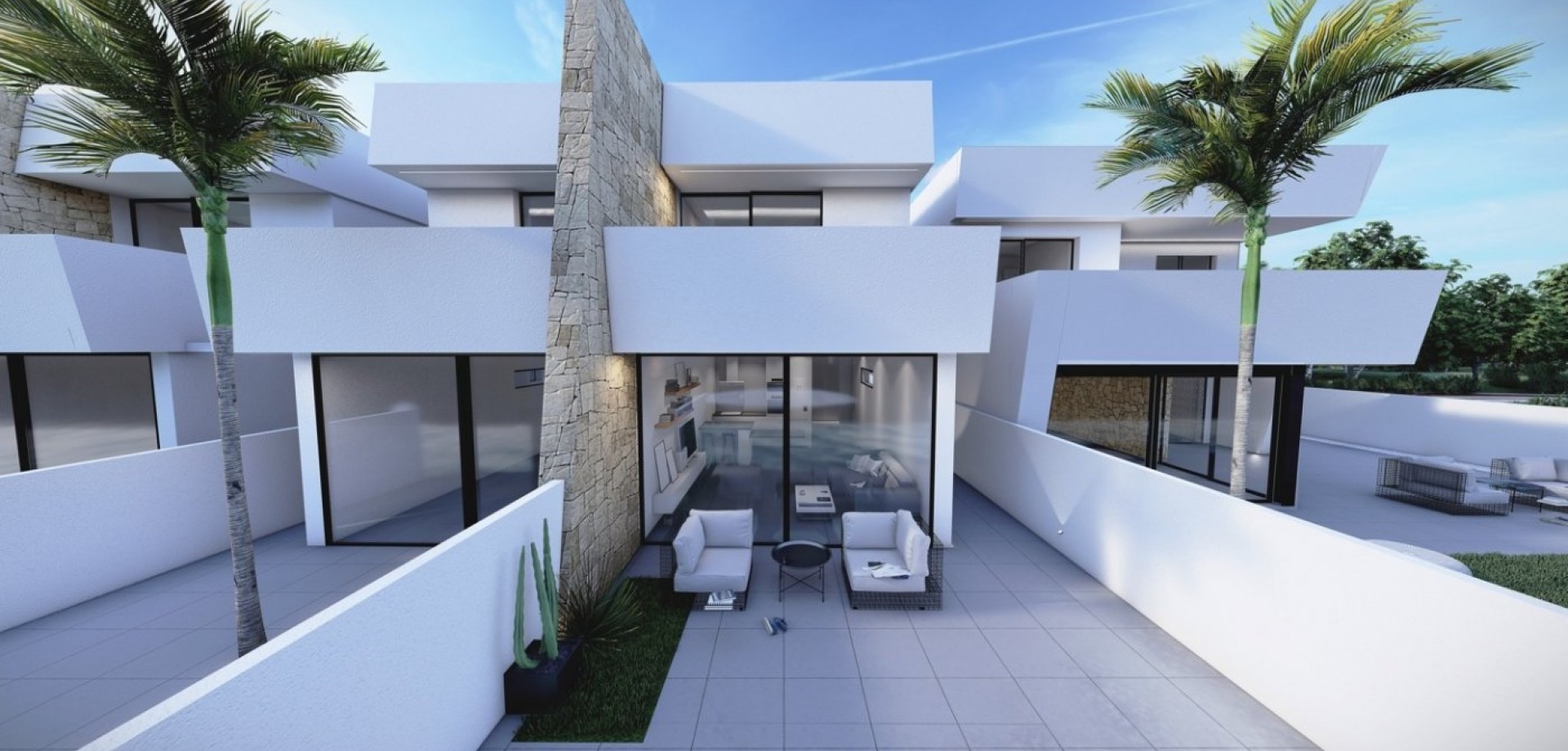 NIEUWBOUW HALFVRIJSTAANDE VILLA'S IN SANTIAGO DE LA RIBERA Nieuwbouw woonwijk van vrijstaande en half vrijstaande villa's met privé zwembaden in Santiago de la Ribera (650 meter van de stranden) Eigenschappen ontworpen om de allerbeste open leefruimte te bieden, met dubbele volledig glazen schuifdeuren die direct uitkomen op een groot terras met privézwembad, terras en parkeerplaats. Villa's bieden 3 royale slaapkamers (eerste verdieping met en-suite), en nog een badkamer op de begane grond met inloopdouche. De woonkamer op de begane grond beschikt over een volledig ingerichte keuken met openklapbare tafel, open lounge / eetkamer, volledig ingerichte keukenzone met inbouwapparatuur, externe berging en terrassen aan de zijkant van de villa, vanuit de hoofdslaapkamer en vanuit de woonkamer. De villa's zijn perfect gelegen, aangezien ze op loopafstand van het winkelcentrum Dos Mares en vele andere winkels, bars, restaurants en de prachtige stranden van de Mar Menor liggen. De straatmarkt op woensdag en zaterdag ligt op slechts 150 meter afstand. Slechts 20 minuten naar de populaire Zenia Boulevard, 30 minuten van de stad Cartagena. Dit gebied biedt een verscheidenheid aan sportieve activiteiten, waaronder seizoensgebonden watersporten … Met enkele bijzonder goede golfbanen in de buurt! Santiago de la Ribera is een kustplaats die administratief afhankelijk is van de gemeente San Javier. Het heeft 4 km strand dat een grote attractie is voor toeristen van verschillende afkomst. De luchthaven van Murcia/Corvera ligt op 30 minuten afstand en de luchthaven van Alicante ligt op een uur rijden.