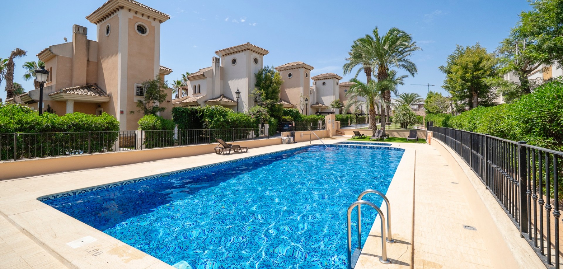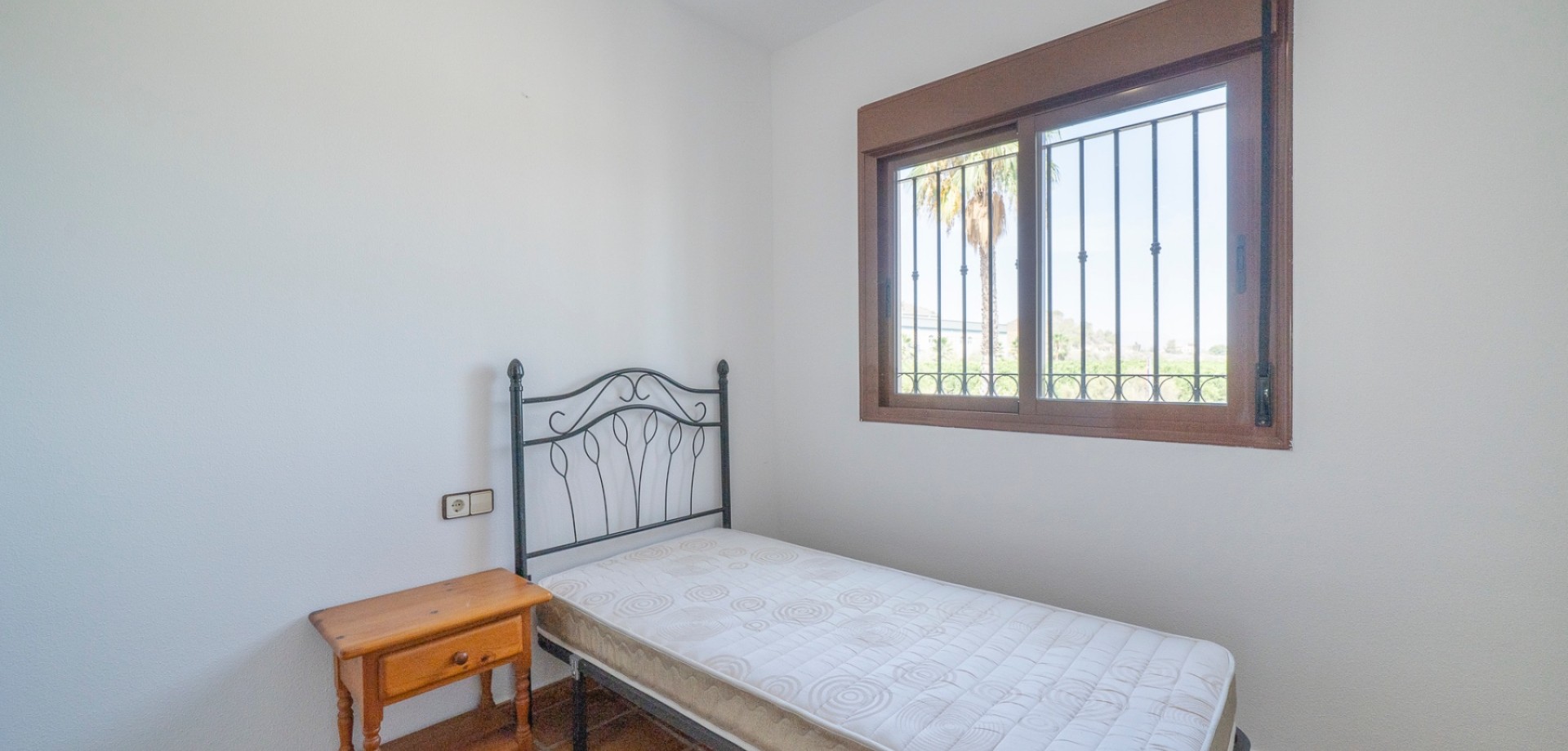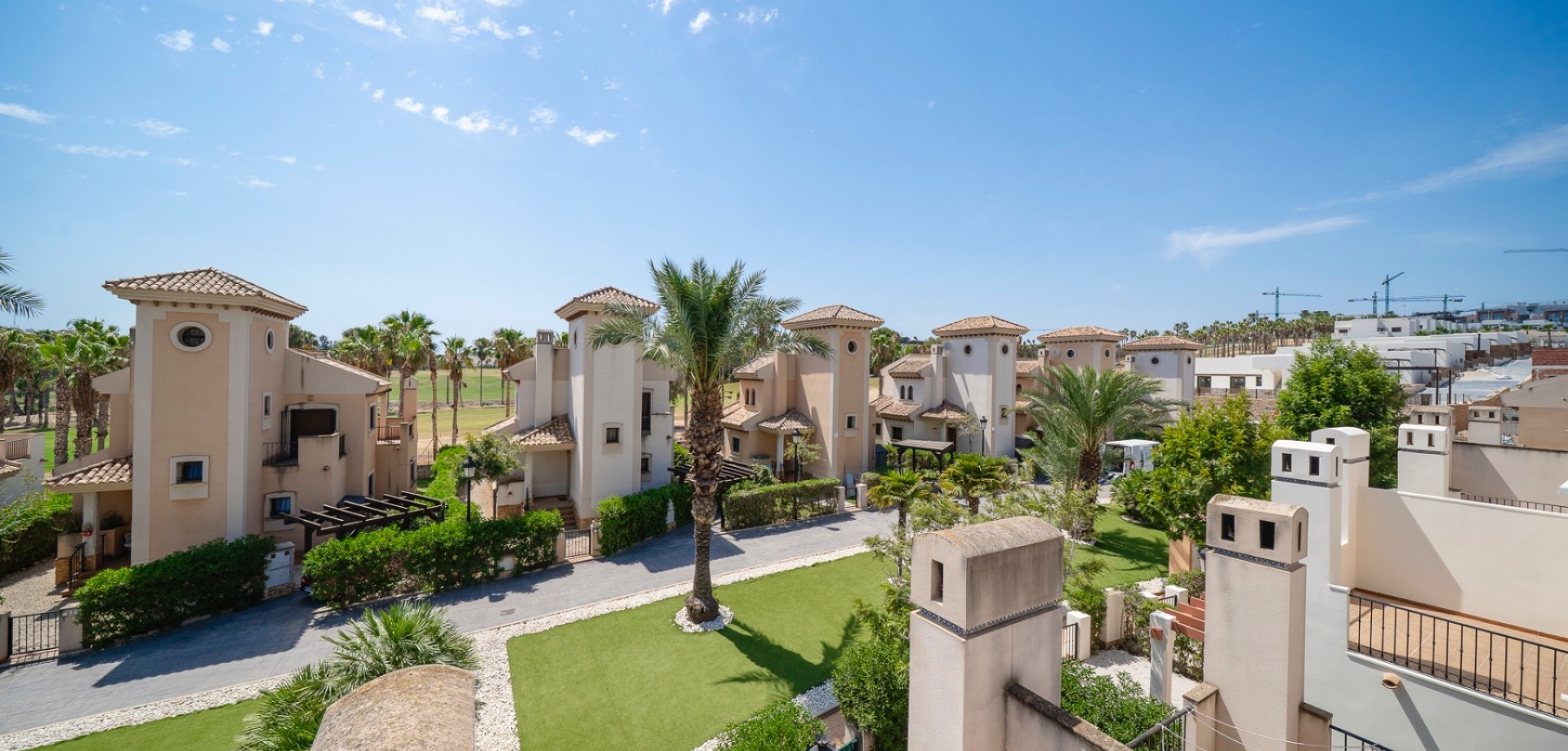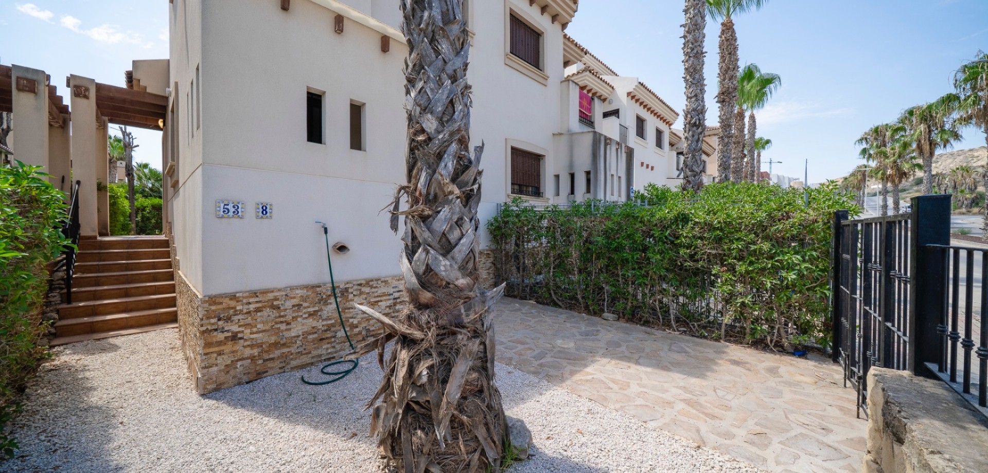 Charmante halfvrijstaande bungalow in het exclusieve wooncomplex Paradise Golf, instapklaar. Aan de voorkant beschikt de woning over een tuin met parkeermogelijkheid en aan de achterkant een overdekte porch met barbecue, die directe toegang biedt tot de woonkamer. Op de begane grond vindt u een woonkamer met open haard, een slaapkamer met inbouwkast, een badkamer met douche en een aparte keuken met bijkeuken. De eerste verdieping omvat een complete badkamer en twee slaapkamers met inbouwkasten – één met balkon en de andere met een prachtig privéterras. Op de bovenste verdieping bevindt zich een solarium dakterras met vrij uitzicht, ideaal om te ontspannen en van de zon te genieten. Het wooncomplex beschikt over een gemeenschappelijk zwembad. De bungalow is recent geschilderd en verkeert in uitstekende staat. Wordt verkocht zonder meubels.