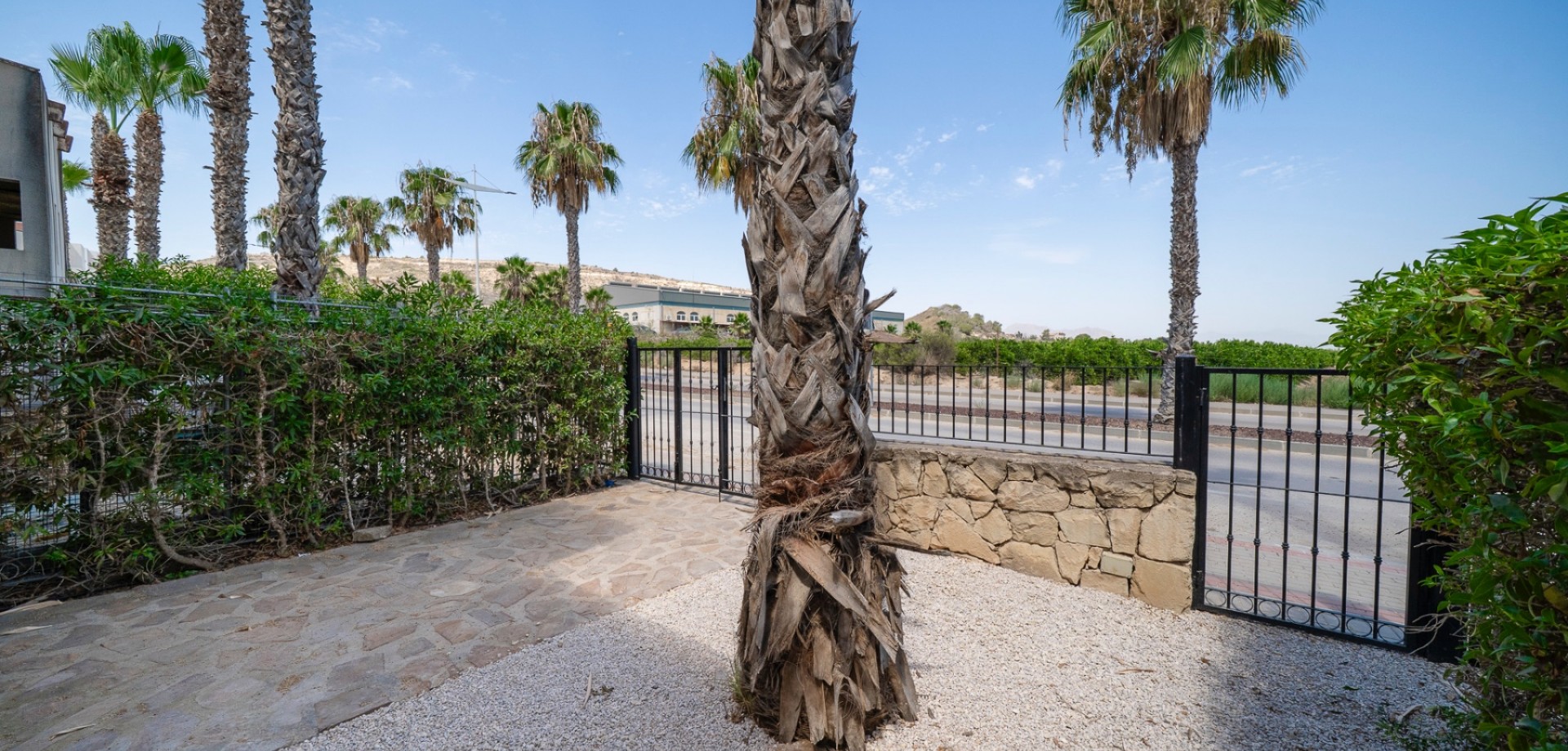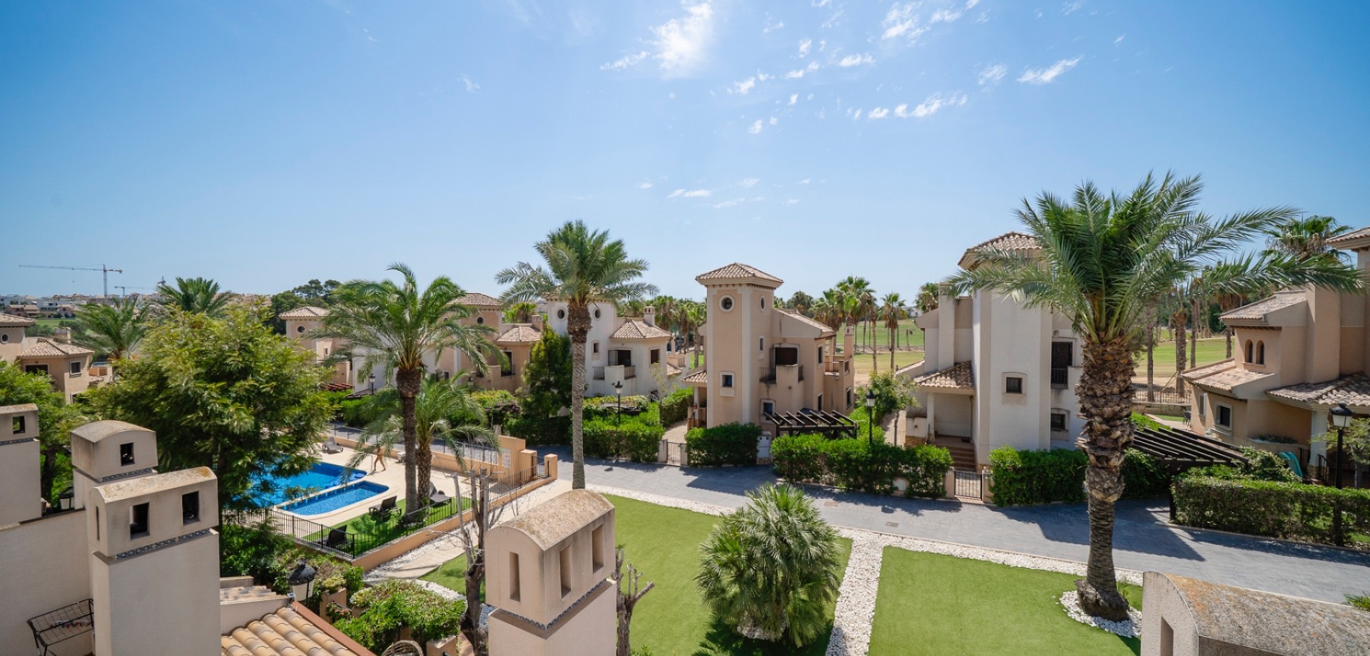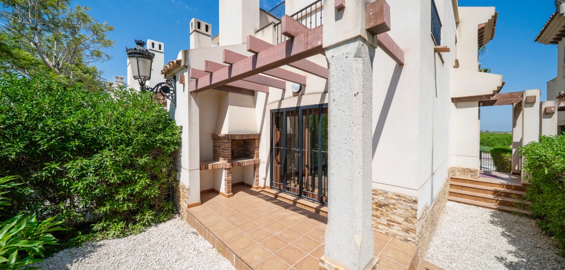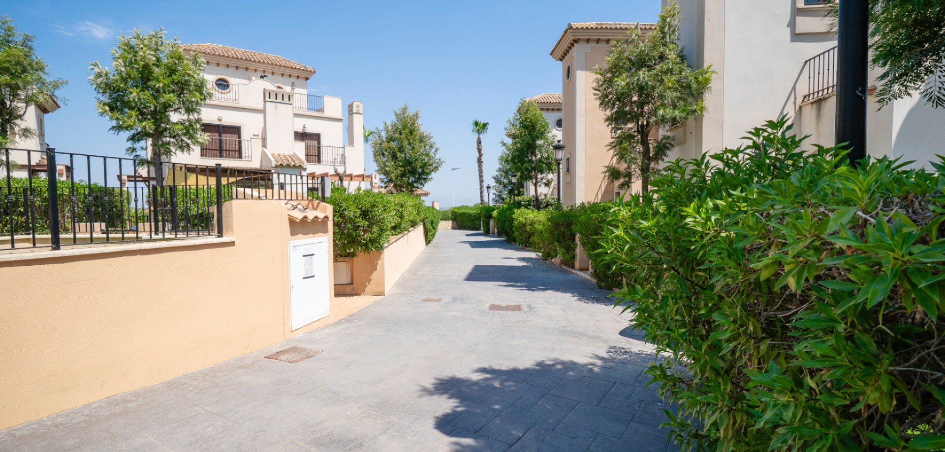 Charmante halfvrijstaande bungalow in het exclusieve wooncomplex Paradise Golf, instapklaar. Aan de voorkant beschikt de woning over een tuin met parkeermogelijkheid en aan de achterkant een overdekte porch met barbecue, die directe toegang biedt tot de woonkamer. Op de begane grond vindt u een woonkamer met open haard, een slaapkamer met inbouwkast, een badkamer met douche en een aparte keuken met bijkeuken. De eerste verdieping omvat een complete badkamer en twee slaapkamers met inbouwkasten – één met balkon en de andere met een prachtig privéterras. Op de bovenste verdieping bevindt zich een solarium dakterras met vrij uitzicht, ideaal om te ontspannen en van de zon te genieten. Het wooncomplex beschikt over een gemeenschappelijk zwembad. De bungalow is recent geschilderd en verkeert in uitstekende staat. Wordt verkocht zonder meubels.