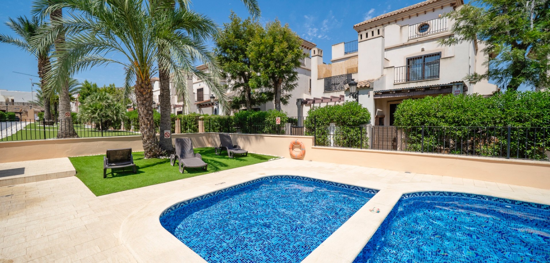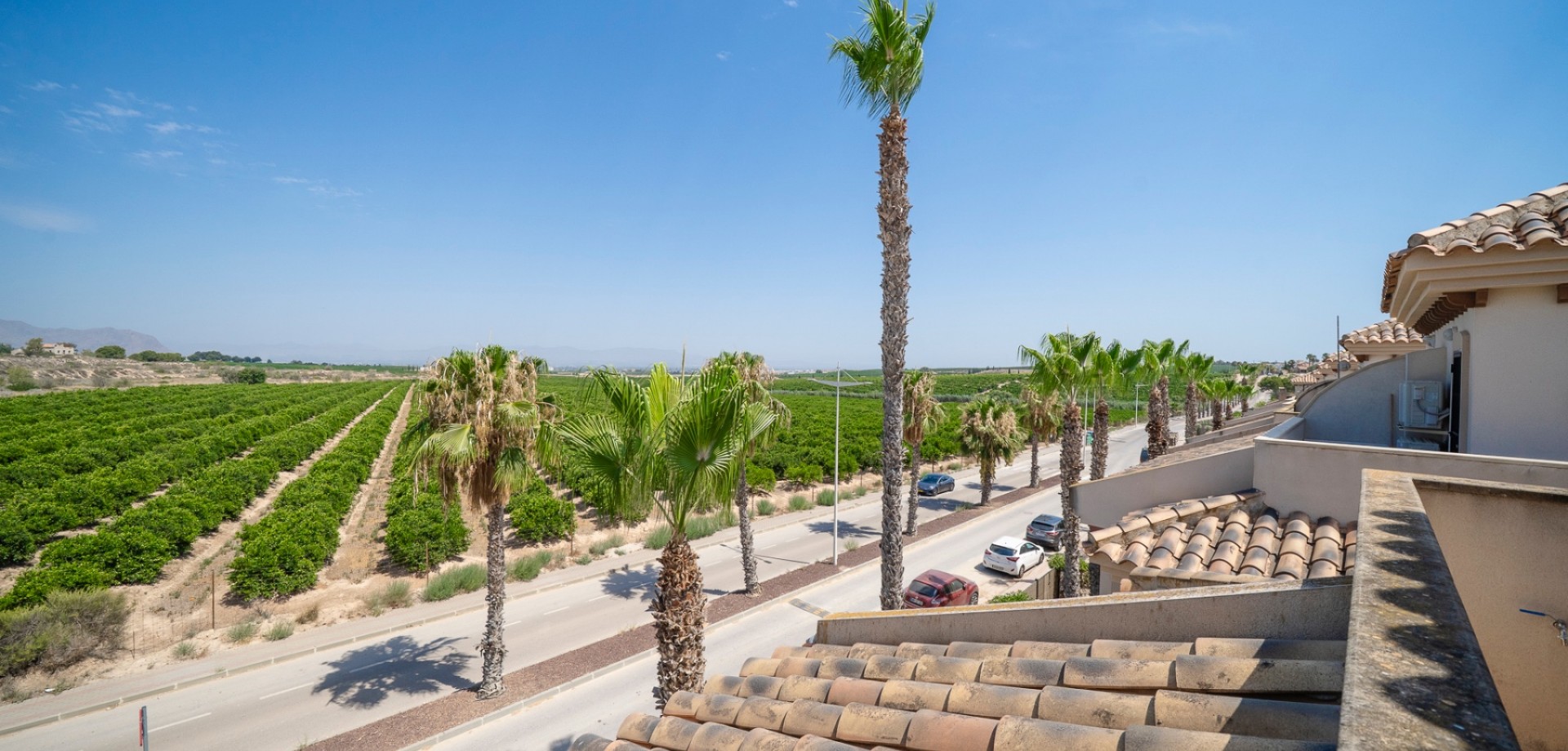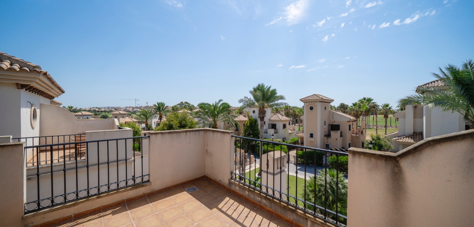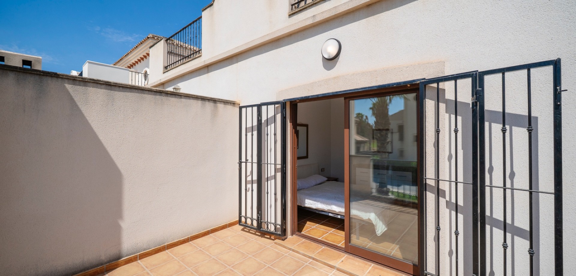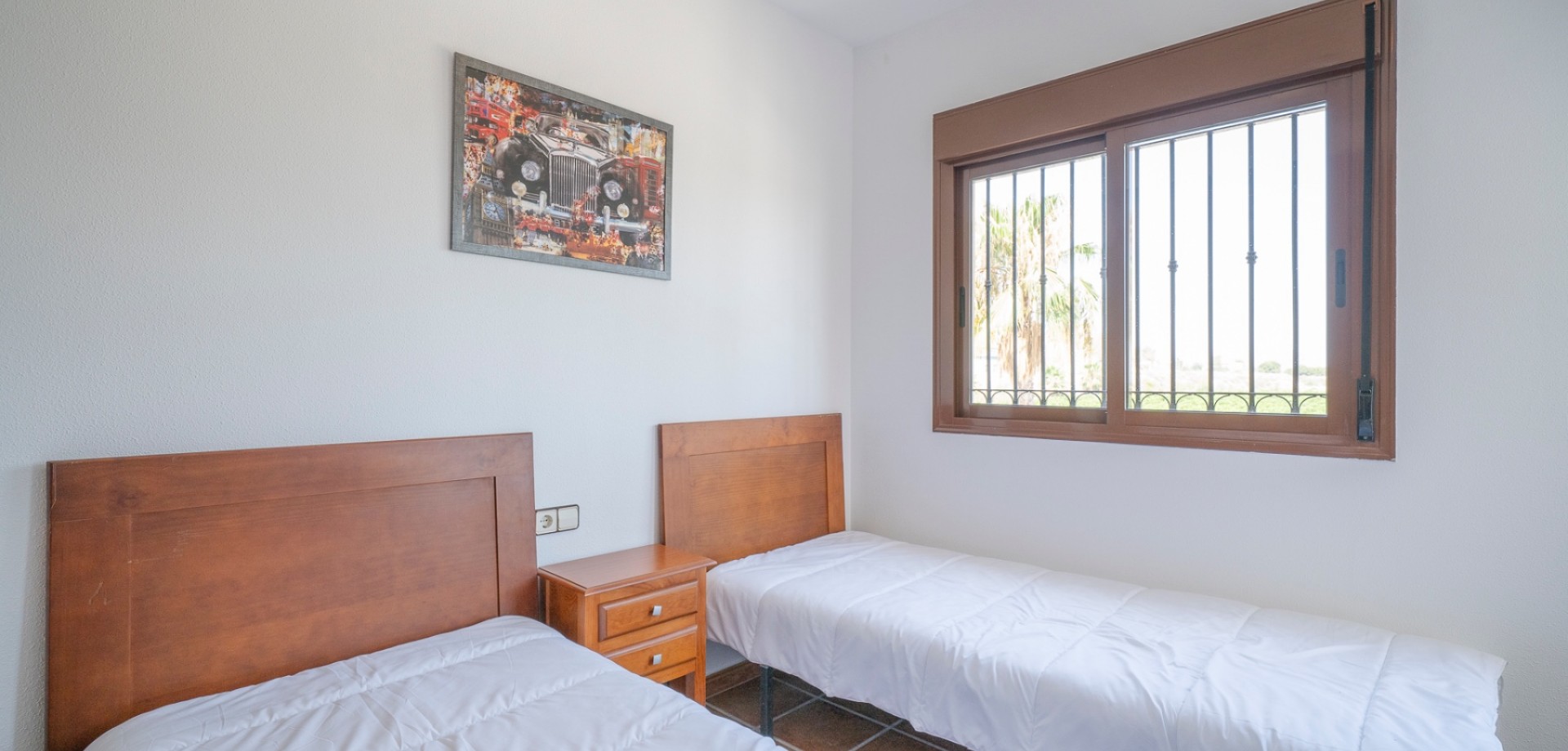Charmante halfvrijstaande bungalow in het exclusieve wooncomplex Paradise Golf, instapklaar. Aan de voorkant beschikt de woning over een tuin met parkeermogelijkheid en aan de achterkant een overdekte porch met barbecue, die directe toegang biedt tot de woonkamer. Op de begane grond vindt u een woonkamer met open haard, een slaapkamer met inbouwkast, een badkamer met douche en een aparte keuken met bijkeuken. De eerste verdieping omvat een complete badkamer en twee slaapkamers met inbouwkasten – één met balkon en de andere met een prachtig privéterras. Op de bovenste verdieping bevindt zich een solarium dakterras met vrij uitzicht, ideaal om te ontspannen en van de zon te genieten. Het wooncomplex beschikt over een gemeenschappelijk zwembad. De bungalow is recent geschilderd en verkeert in uitstekende staat. Wordt verkocht zonder meubels.