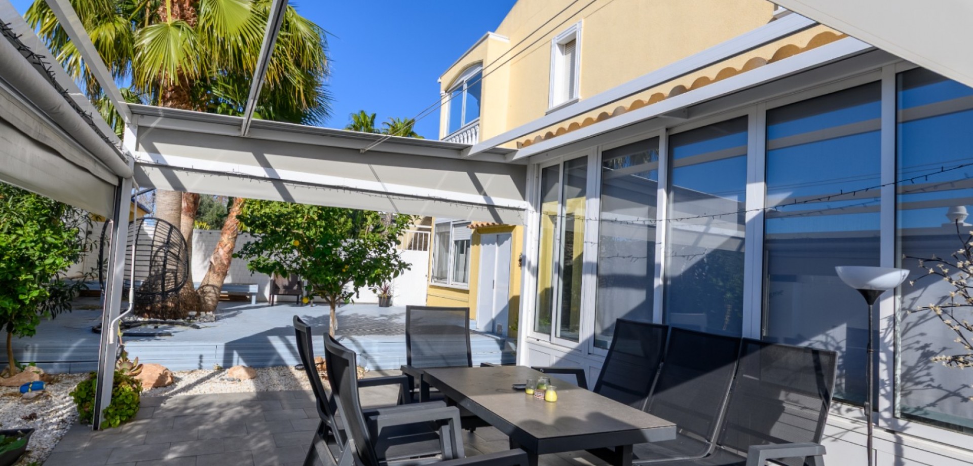 Wij presenteren deze charmante bungalow op de begane grond, gelegen in een beveiligde woningontwikkeling, die uitzonderlijk buitenleven en een uitstekende locatie biedt op loopafstand van het strand en alle voorzieningen. Het pand profiteert van een enorm terras dat rondom loopt, waardoor er zowel zon als schaduw gedurende de dag is, en kijkt uit op het prachtig onderhouden gemeenschappelijke zwembad en tuingebieden. De buitenruimte is ideaal voor entertainment en ontspanning, met een volledig uitgeruste buitenkeuken, volwassen palmbomen en gevestigde sinaasappel- en citroenbomen, wat een privé-Mediterrane sfeer creëert. Binnen bestaat de bungalow uit twee slaapkamers en één badkamer. Het pand is recentelijk vernieuwd met een nieuwe moderne keuken, inclusief een geïntegreerd drinkwaterfilter, en een nieuwe badkamer met een verwarmde handdoekradiator. De voor- en zijterrassen zijn verglazen, wat het gebruik het hele jaar door mogelijk maakt en extra leefruimte biedt. Comfort is verzekerd met warme en koude airconditioning door het hele huis, evenals plafondventilatoren in beide slaapkamers. Extra praktische kenmerken zijn onder andere een opslagruimte, een buitenberging en een ondergrondse parkeerplaats in een nabijgelegen gebouw. De locatie is bijzonder aantrekkelijk, met gemakkelijke toegang te voet tot het strand, winkels, restaurants, openbaar vervoer en het La Mata-lagune en natuurgebied, waardoor het ideaal is als permanente woning, vakantiehuis of huurinvestering. De gemeenschapskosten bedragen ongeveer €700 per jaar, met jaarlijkse SUMA-kosten van rond de €200.
