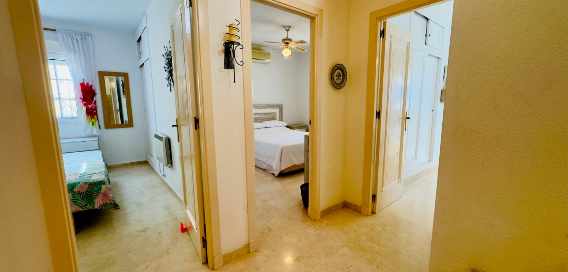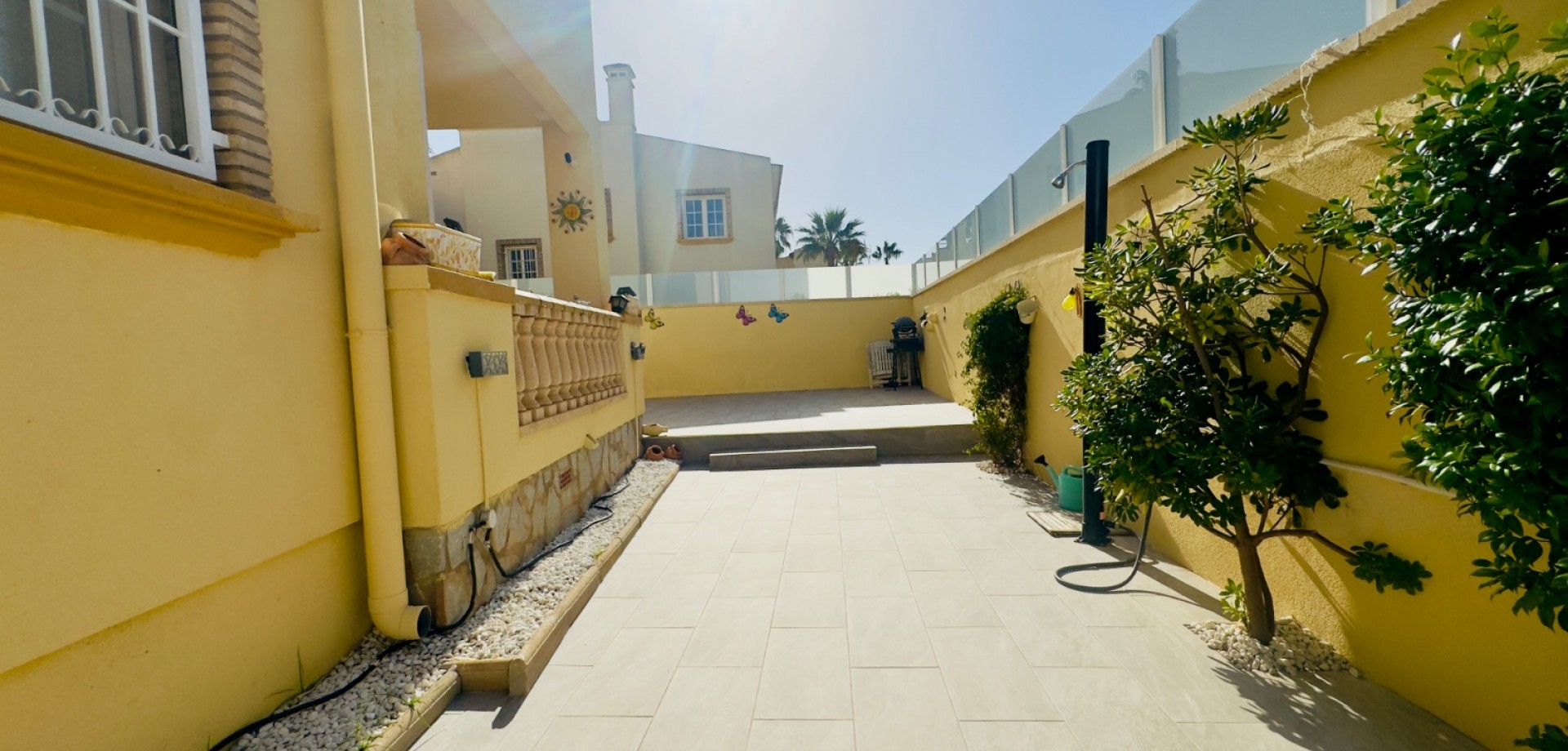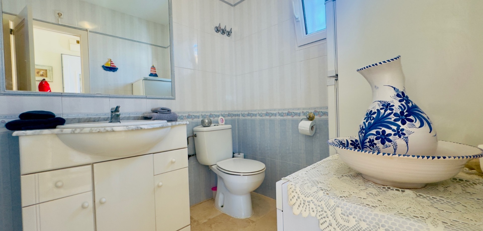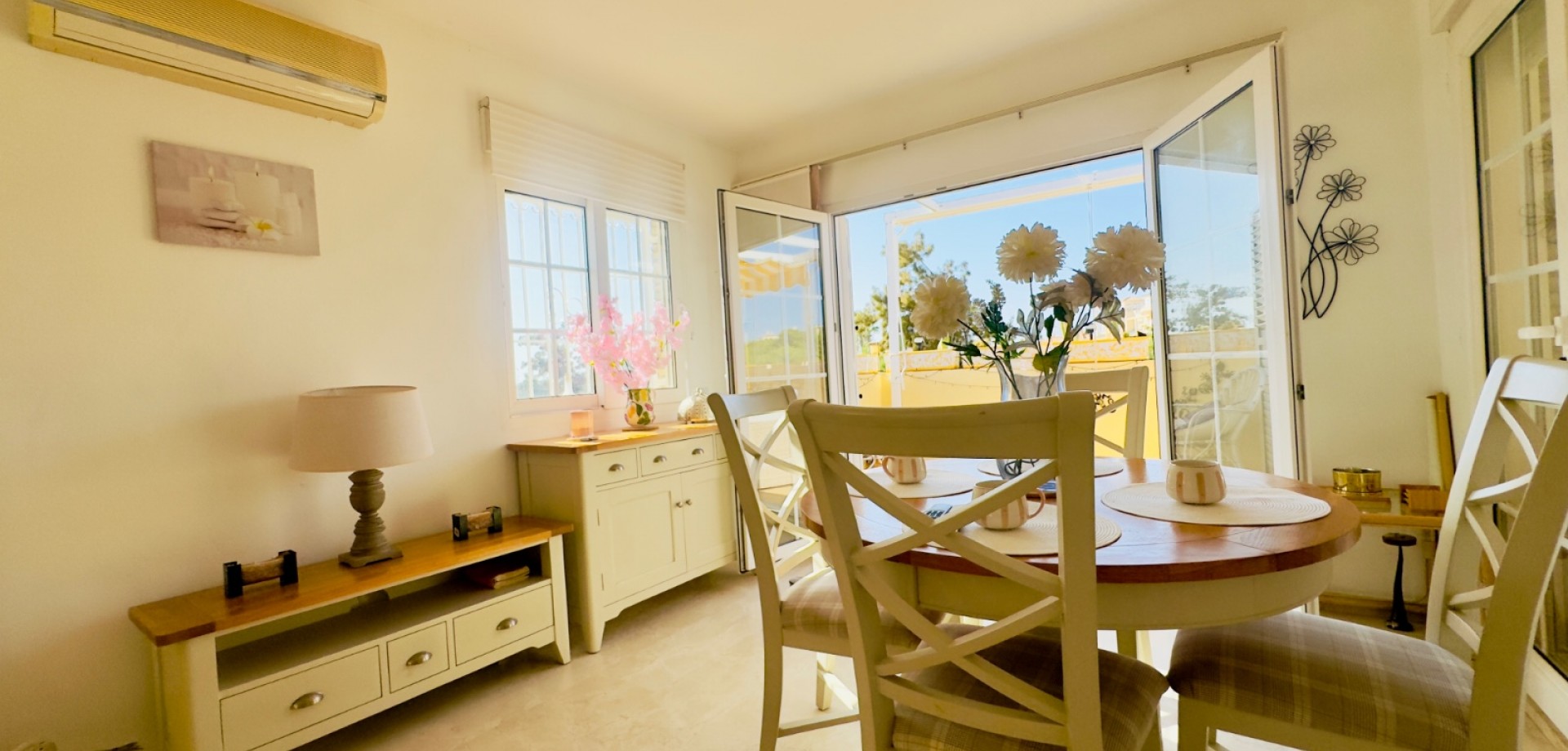 Perfect gelegen in de zeer gewilde wijk Playa Flamenca, Orihuela Costa, biedt deze prachtige villa met 3 slaapkamers en 3 badkamers (waarvan één en suite) een harmonieuze combinatie van modern comfort, privacy en mediterrane charme. De woning beschikt over verwarming, met elektrische wandkachels in elke kamer, warme en koude airconditioning en een nieuwe open haard met lage emissie, wat zorgt voor comfort het hele jaar door. De villa is gebouwd op een zuidelijk gelegen hoekperceel van 325 m² en heeft een bebouwde oppervlakte van 125 m². De woning biedt royale binnen- en buitenruimtes, ideaal om te ontspannen, gasten te ontvangen of het hele jaar door van de Spaanse zon te genieten. Vanaf het terras is er zelfs gedeeltelijk zeezicht, wat een extra vleugje kustleven toevoegt. Een van de meest opvallende kenmerken van deze villa is de uitstekende locatie. Op slechts enkele minuten loopafstand bevindt zich de bekende zaterdagmarkt van Playa Flamenca, waar u kunt genieten van lokale producten, eetkraampjes en een levendige sfeer. In minder dan 10 minuten lopen bereikt u winkelcentrum La Zenia Boulevard, een van de grootste openluchtwinkelcentra van Spanje, met bekende merken, restaurants, cafés en recreatieve voorzieningen. Alle essentiële voorzieningen — supermarkten, scholen, stranden en vervoersverbindingen — zijn binnen handbereik. De woning is gelegen in een goed onderhouden, afgesloten gemeenschap waar bewoners kunnen genieten van twee prachtige gemeenschappelijke zwembaden, fraai aangelegde tuinen en toegewezen parkeerplaatsen, wat comfort en rust garandeert. Of het nu gaat om een permanente woning onder de zon, een vakantiehuis of een rendabele investering, deze villa is instapklaar en perfect om te genieten van het mediterrane leven. Belangrijkste kenmerken: • Toplocatie – op loopafstand van de markt van Playa Flamenca en La Zenia Boulevard • 3 slaapkamers / 3 badkamers (1 en suite) • Zuidgericht hoekperceel van 325 m² • Bebouwde oppervlakte van 125 m² • Twee gemeenschappelijke zwembaden en aangelegde tuinen • Gedeeltelijk zeezicht vanaf het terras • Volledig gemeubileerd en instapklaar • Airconditioning (warm/koud) • Verwarming met elektrische wandkachels in alle kamers • Nieuwe open haard met lage emissie • Privé- en gemeenschappelijke parkeergelegenheid