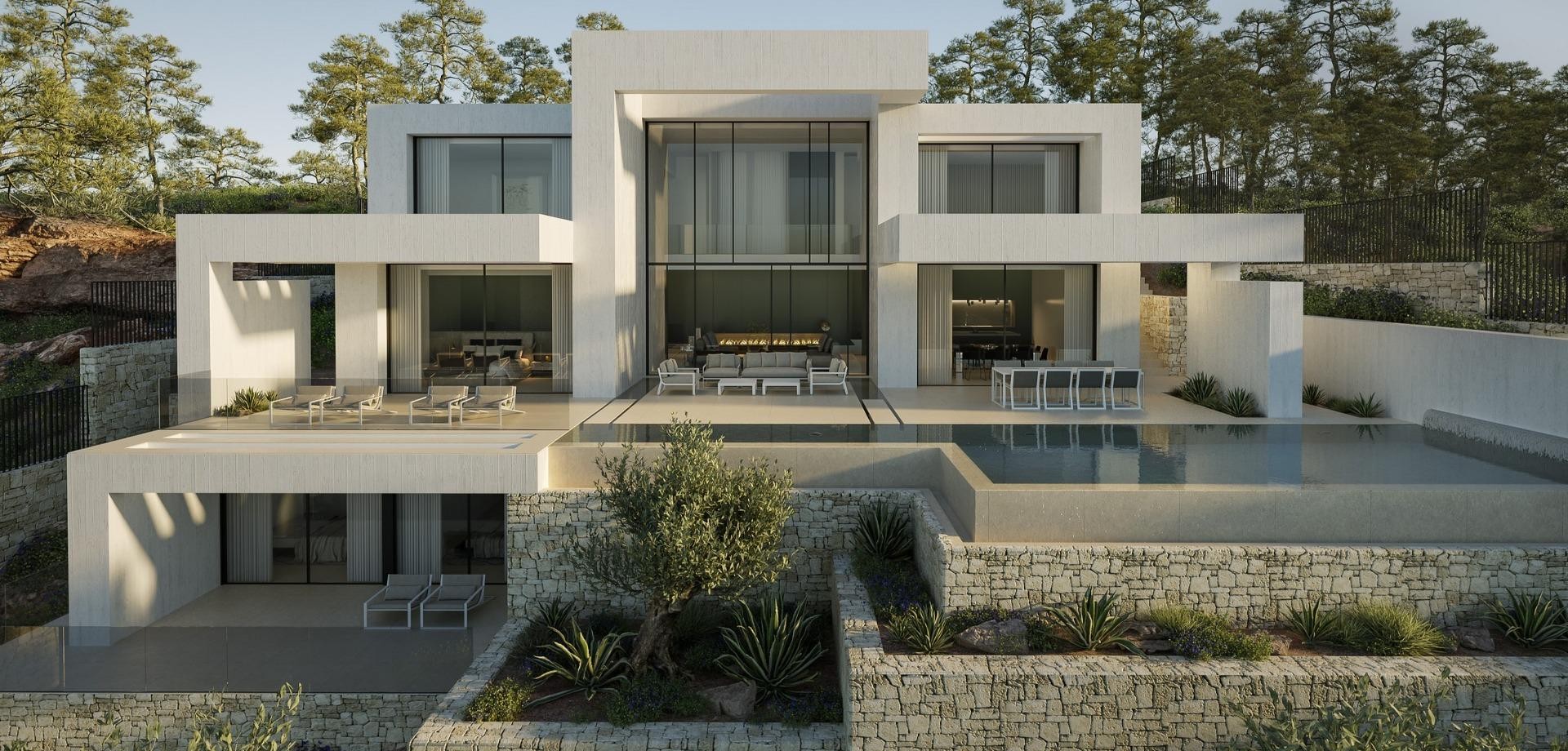 Luxe nieuwbouwwilla met zeezicht nabij het strand van Granadella in Jávea Exclusieve villa in de prestigieuze wijk Granadella in Jávea Ontdek een uitzonderlijke luxe villa die momenteel in aanbouw is in de zeer gewilde wijk Granadella in Jávea, aan de noordelijke Costa Blanca. Gelegen in een rustige, natuurlijke omgeving naast het beschermde bospark en op korte afstand van de beroemde Cala Granadella, biedt deze woning een zeldzame combinatie van privacy, spectaculair uitzicht op zee en de nabijheid van een van de mooiste baaien van Spanje. Javea staat bekend om zijn prachtige kustlijn, charmante oude binnenstad en uitstekende klimaat het hele jaar door. De stad biedt een bruisende levensstijl met internationale restaurants, jachthavens, golfbanen en een breed scala aan buitenactiviteiten. De mix van mediterrane charme en moderne voorzieningen maakt het tot een van de meest gewilde bestemmingen aan de Costa Blanca, zowel voor permanente bewoning als voor luxe vakantiehuizen. Moderne architectuur met ruime woonruimtes Deze elegante designvilla staat op een royaal perceel van 925 m² en biedt een indrukwekkende bebouwde oppervlakte van ongeveer 677 m², verdeeld over drie verdiepingen. De eigentijdse architectuur gaat naadloos op in het omringende natuurlijke landschap en benut het natuurlijke licht en het panoramische uitzicht optimaal. De woning beschikt over vier ruime slaapkamers, vijf badkamers en een gastentoilet. Grote open woonruimtes sluiten naadloos aan op de buitenterrassen, waardoor een lichte en comfortabele leefomgeving ontstaat die is ontworpen voor het moderne mediterrane leven. De villa beschikt tevens over een privékantoor, een volledig uitgeruste fitnessruimte, bergingen en een overdekte parkeerplaats voor twee auto's. Een lift verbindt de verschillende verdiepingen van de woning voor maximaal gemak en toegankelijkheid. Panoramisch uitzicht op zee en buitenleven Een van de meest indrukwekkende kenmerken van het pand is de buitenruimte. De villa beschikt over ongeveer 140 m² aan open terrassen die een spectaculair uitzicht bieden op de Middellandse Zee en de omliggende bergen. Het infinity-zwembad kijkt uit over de kustlijn en het nabijgelegen strand van Granadella, waardoor een unieke omgeving ontstaat om te ontspannen en te genieten van de natuurlijke schoonheid van de omgeving. De aangelegde tuin met bomen en een automatisch irrigatiesysteem versterkt de rustige sfeer van het pand nog verder. Hoogwaardige afwerking en smart home-technologie De villa is gebouwd met hoogwaardige materialen en de nieuwste bouwtechnologieën om comfort, veiligheid en energie-efficiëntie te garanderen. Infinity-zwembad met uitzicht op zee Lift die alle verdiepingen met elkaar verbindt Designkeuken uitgerust met NEFF-apparatuur Vloerverwarming door het hele pand Luchtkanalensysteem met onafhankelijke AIRZONE-thermostaten NIESSEN Free Home domoticasysteem voor de bediening van verlichting en zonwering Gemotoriseerde zonwering in de hele villa Video-intercom en voorinstallatie voor alarmsysteem Aangelegde tuin met irrigatiesysteem Deze voorzieningen zorgen voor een moderne, comfortabele en veilige omgeving, ontworpen voor een luxe levensstijl. Toplocatie dicht bij stranden en voorzieningen Cala Granadella 0,3 km Arenal-strand 7 km La Sella Golf 18 km Denia 20 km Luchthaven Alicante-Elche 100 km Luchthaven Valencia 120 km Verzeker uzelf van uw luxe villa in Jávea Deze uitzonderlijke villa biedt een eigentijds ontwerp, adembenemend uitzicht op zee en een toplocatie nabij een van de mooiste stranden aan de Costa Blanca. Neem vandaag nog contact met ons op voor meer informatie of om een privébezichtiging te regelen en ontdek uw toekomstige luxe woning in Jávea. 466