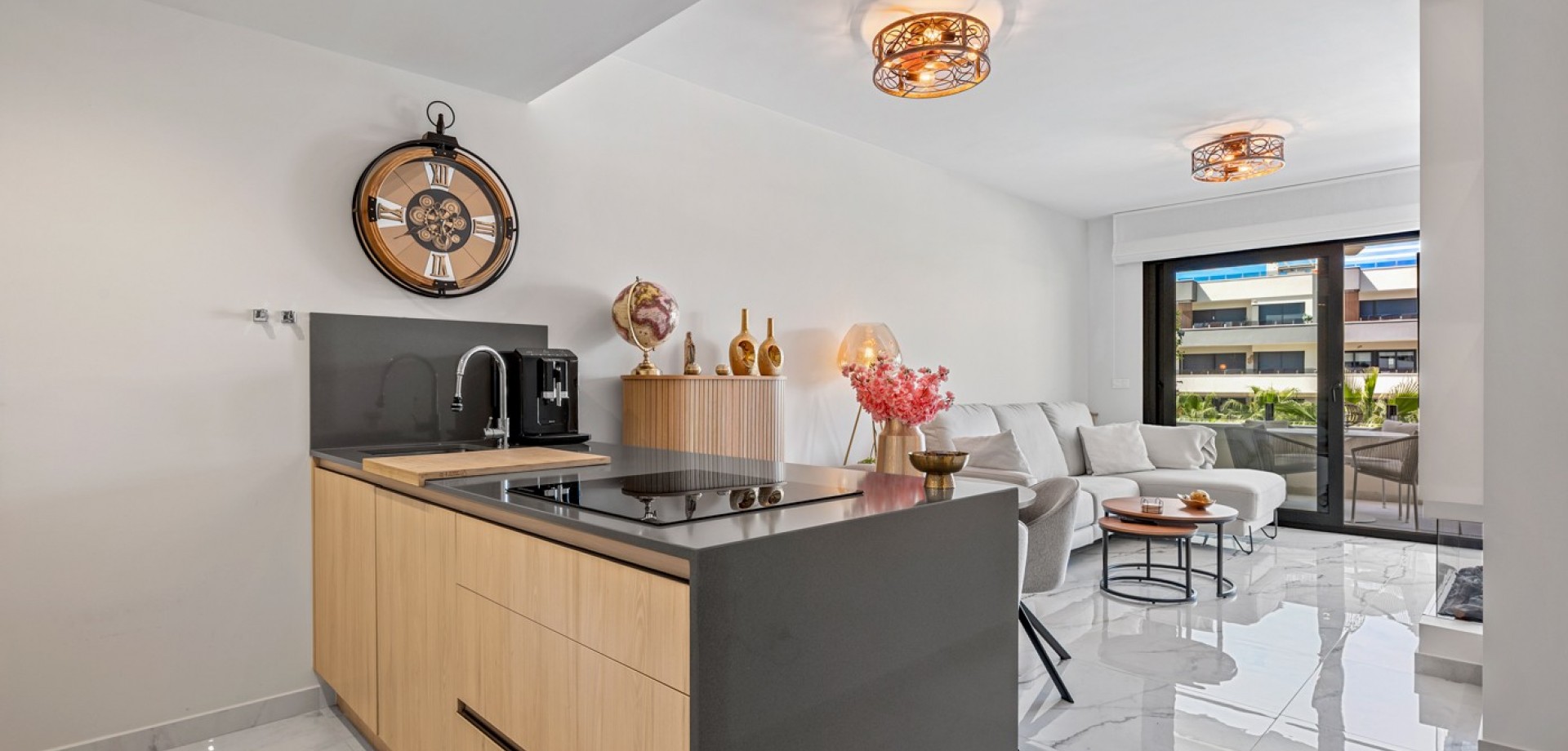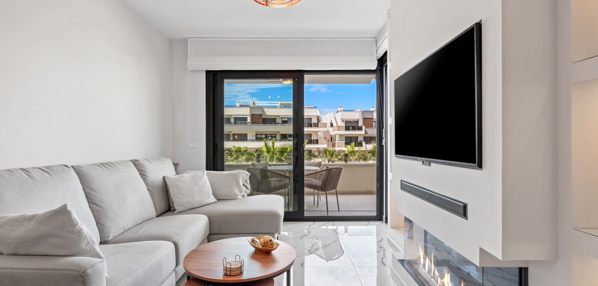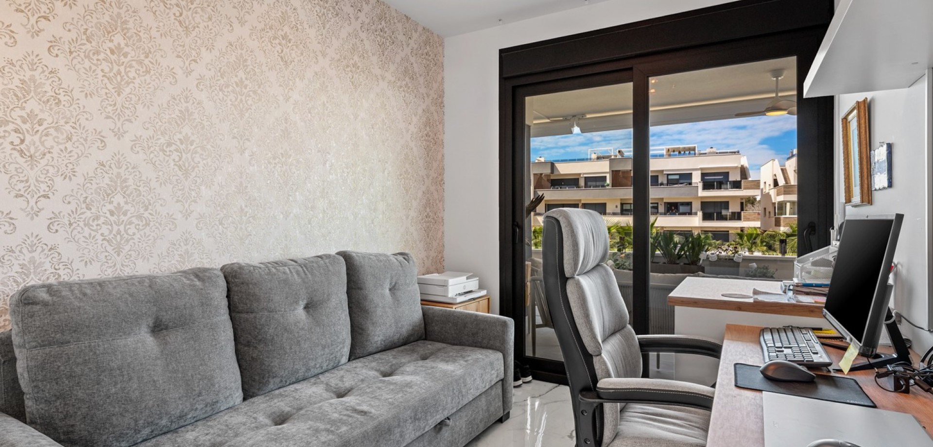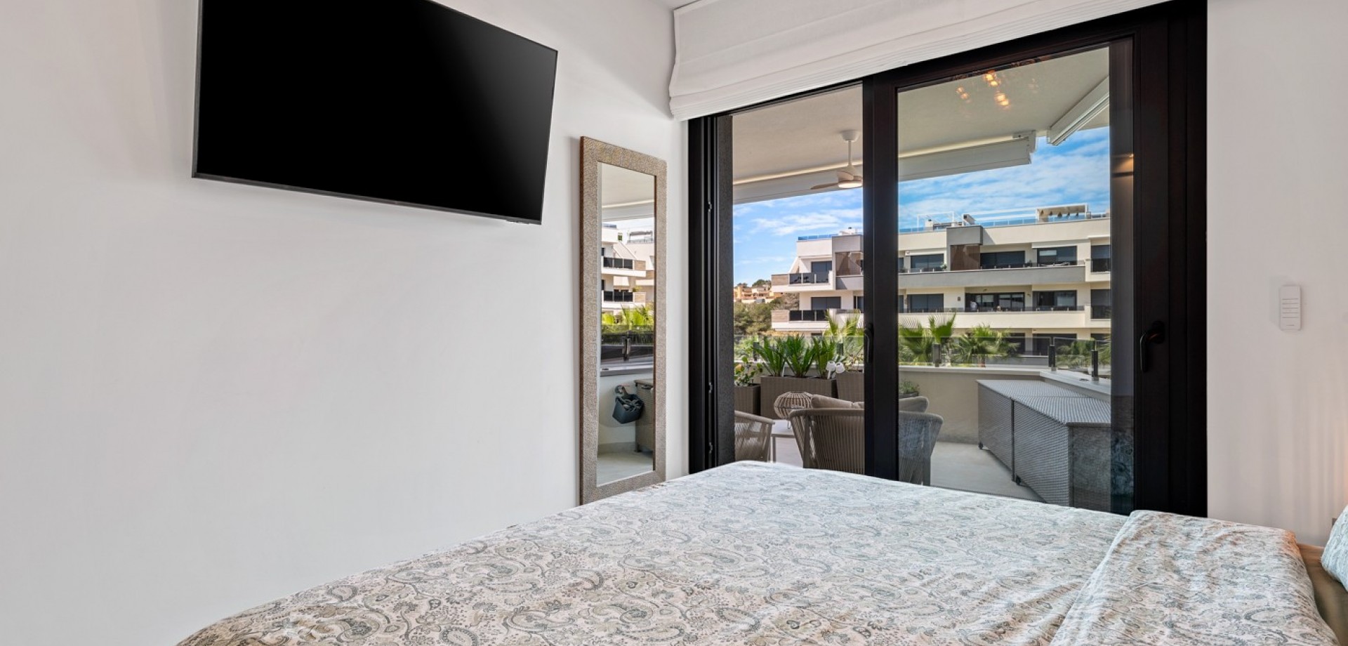 Luxe appartement in Resort Amanecer X, gelegen in de populaire wijk Los Altos in Orihuela Costa. Dit stijlvolle en eigentijdse appartement werd opgeleverd in 2024 en vormt een uitstekende kans zowel als vakantieverblijf, permanente woning of investering met een sterke verhuurpotentie. Het appartement beschikt over een lichte, open woonkamer met keuken en eetgedeelte, ontworpen om optimaal gebruik te maken van de ruimte en het natuurlijke licht. Grote ramen zorgen voor een luchtige sfeer en geven direct toegang tot een ruim privéterras, waardoor binnen en buiten naadloos in elkaar overgaan. De keuken is volledig uitgerust met moderne apparaten en afgewerkt in een strakke, eigentijdse stijl, die moeiteloos aansluit bij de leefruimte. Er zijn twee ruime slaapkamers, beide voorzien van inbouwkasten en gesitueerd aan de terraszijde van het appartement, plus twee moderne badkamers die afgewerkt zijn op hoog niveau. Het appartement wordt volledig gemeubileerd opgeleverd en heeft een totale oppervlakte van 65 m², met een praktische en uitgebalanceerde indeling. Een van de opvallendste kenmerken is het royale privéterras van maar liefst meer dan 25 m², met uitzicht op de aangelegde tuinen en het gemeenschappelijke zwembad. Dankzij de zuidwestelijke ligging geniet het terras van uitstekende zon, wat het ideaal maakt om te ontspannen of buiten te eten. Het appartement bevindt zich op de eerste verdieping van een gebouw nummer 8 met lift en beschikt over een ondergrondse parkeerplaats en een privéberging. Het is uitgerust met airconditioning, een Airzone-klimaatregelsysteem, vloerverwarming in de badkamers en elektrische rolluiken, wat zorgt voor het hele jaar door comfort. Het appartement wordt opgeleverd in perfecte staat, volledig gemeubileerd en klaar om in te trekken! Bewoners van Amanecer X genieten van een resortachtige omgeving met toegang tot een groot gemeenschappelijk zwembad, een peuterbad, een volledig uitgeruste fitnessruimte, en ook een jacuzzi en sauna. Dit alles wordt omringd door prachtig onderhouden tropische tuinen met aangepaste buitentoegang voor mensen met een beperkte mobiliteit. De locatie is bijzonder praktisch: restaurants, cafés en supermarkten liggen op loopafstand, en La Zenia Boulevard bevindt zich op slechts een paar minuten rijden. Voor golfliefhebbers biedt de omgeving een ruime keuze aan nabijgelegen banen, waaronder Villamartín Golf op slechts 5 minuten, Real Club de Golf Campoamor en Las Ramblas Golf op ongeveer 10 minuten, en de prestigieuze Las Colinas Golf & Country Club op ongeveer 15 minuten van het appartement. De zandstranden van Orihuela Costa, zoals La Zenia Beach, Playa Flamenca, Cabo Roig en Campoamor, liggen allemaal op maximaal 10 minuten rijden. Het appartement ligt ideaal tussen twee grote luchthavens en biedt uitstekende verbindingen: Alicante Airport ligt op ongeveer 45 minuten en Murcia International Airport op circa 35 tot 40 minuten rijden.