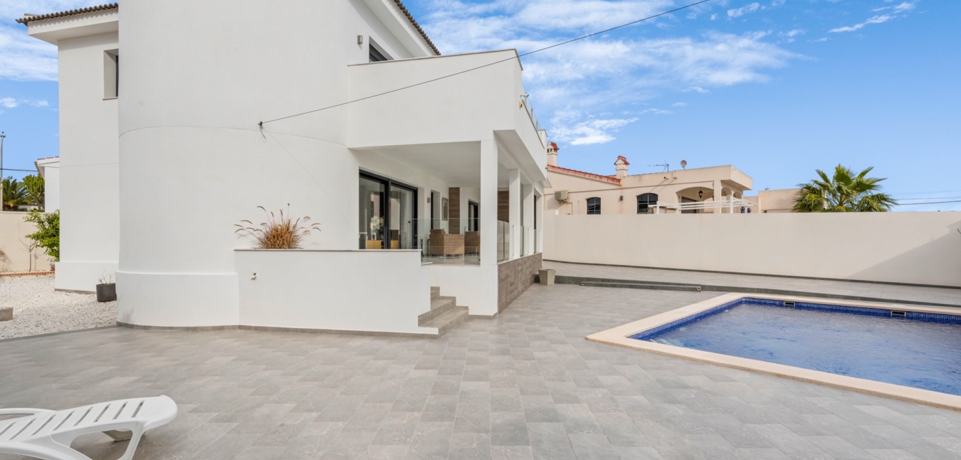Ligger i et av de mest eksklusive og rolige områdene i Ciudad Quesada, er denne moderne villaen med samtidsdesign det ideelle hjemmet for de som søker luksus, komfort og en utmerket livskvalitet. Med totalt 160 m² bygget på en tomt på 500 m², tilbyr denne eiendommen den perfekte kombinasjonen av romslige områder, førsteklasses finish og et privilegert miljø, alt i en godt tilkoblet beliggenhet med enkel tilgang til regionens viktigste attraksjoner. Denne imponerende villaen har 3 romslige og lyse soverom i øverste etasje, hver med eget bad og store vinduer som lar deg nyte skjønnheten i de naturlige omgivelsene. To av soverommene har direkte tilgang til en privat terrasse, som gir både privatliv og komfort. I tillegg er det et gjestetoalett på første etasje for beboernes og deres gjesters komfort. Kjøkkenet i uavhengig stil er utstyrt med høy kvalitetsapparater og en sentral øy. Den åpne, flytende designen integreres perfekt med husets utforming og skaper et ideelt rom for å sosialisere og nyte tid med familie eller venner. Fra stuen åpner panoramautsikten seg foran deg, og gir en avslappende og lys atmosfære. Den store hagen huser et privat svømmebasseng, hvor du kan nyte det varme middelhavsklimaet i full privatliv. Utendørsområdet er perfekt utstyrt med en terrasse designet for å hjelpe deg å slappe av og koble av i chillout-sonen, eller for å spise ute, sammen med et landskapsområde som er ideelt for de som ønsker å nyte utendørs uten å forlate hjemmet. Panoramautsikten fra eiendommen mot kysten og de omkringliggende naturlige omgivelsene er rett og slett imponerende. Det eksterne lagringsrommet, som er diskret plassert på en side av eiendommen, er et frittstående rom som smelter sømløst sammen med husets design og gir en utmerket løsning for ekstra lagring. For å sikre maksimal komfort året rundt, er villaen utstyrt med aircondition i alle rom. I tillegg har eiendommen privat parkering på tomten, hvor du kan parkere kjøretøyene dine trygt og komfortabelt. Eiendommen har sørvendt beliggenhet, noe som sikrer utmerket naturlig lys og en behagelig temperatur gjennom hele dagen. Denne orienteringen optimaliserer også utsikten, og gir en ideell setting for å nyte solfylte ettermiddager og milde middelhavskvelder. Villaen ligger bare 15 minutters kjøretur fra de beste strendene i Guardamar. Bare 5 minutter fra eiendommen finner du et bredt utvalg av butikker, supermarkeder og restauranter, slik at du har alt du trenger for dagliglivet uten å måtte reise langt. I tillegg vil golfentusiaster bli glade for å vite at de nærmeste golfbanene ligger bare 10 minutters kjøretur unna, noe som gjør denne villaen til det perfekte stedet for å nyte sporten. Denne eiendommen er designet for å tilby deg en komfortabel, avslappet og eksklusiv livsstil, og kombinerer luksus, funksjonalitet og en misunnelsesverdig beliggenhet. Enten som permanent bolig eller som feriehus, gir denne villaen deg alt du trenger for å utnytte det middelhavsklimaet og livet på Costa Blanca til det fulle. Ikke gå glipp av muligheten til å besøke den. Kontakt oss i dag for mer informasjon eller for å avtale en visning og oppdage ditt nye hjem på Costa Blanca!