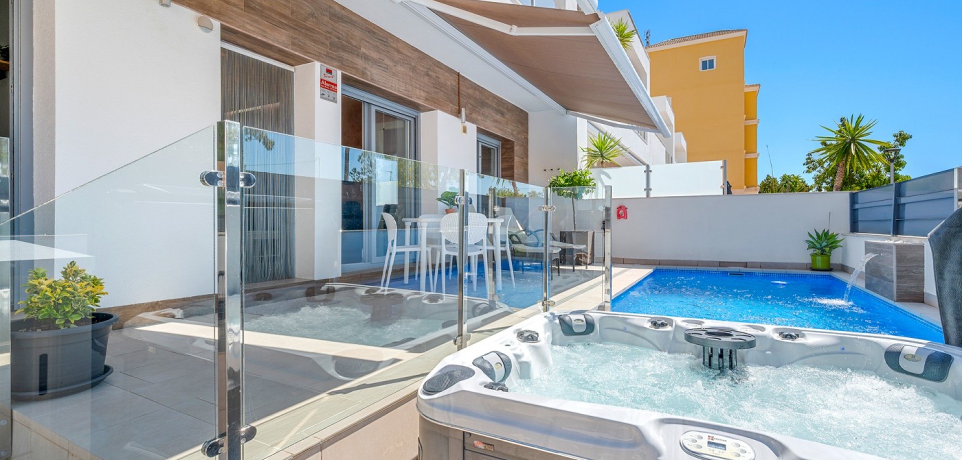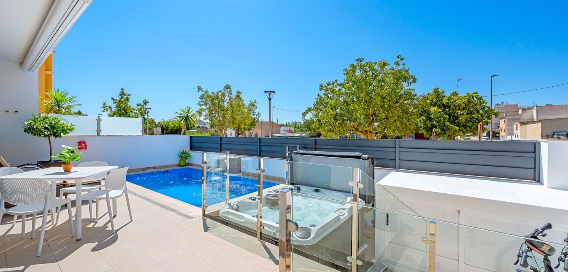 I hjertet av den sjarmerende og autentiske spanske landsbyen Formentera del Segura finner du dette velholdte rekkehuset, som kombinerer moderne komfort med tradisjonell atmosfære. Bygget i 2018, og en del av et lite og eksklusivt sameie med kun fire boliger. Dette er første gang en av boligene selges videre — en sjelden mulighet. Boligen har tre romslige soverom og to elegante bad, hvorav ett er en-suite. To av soverommene ligger praktisk plassert i første etasje, noe som gjør huset enkelt å bo i året rundt. Interiøret er smakfullt innredet med kvalitetsmøbler og materialer — alt inkludert i salget. Boligen er i svært god stand og klar til å flyttes rett inn i. Ute finner du et privat svømmebasseng med fossefall og en egen jacuzzi — perfekt for avslapning. Den store takterrassen er allerede klargjort for utvidelse med et tredje bad, med avløp og elektrisitet på plass. Med solskjerming, privat skjermering og en koselig lounge, er takterrassen ideell for sosiale kvelder eller rolige stunder med fantastisk utsikt. Boligen er utstyrt med: Vannfiltreringssystem for hele huset (drikkbart vann fra springen) Aircondition: sentral i første etasje og separat enhet i andre etasje God ventilasjon uten fuktproblemer Fiberinternett med sterk dekning også på takterrassen — perfekt for hjemmekontor Selges fullt møblert. Formentera del Segura byr på et gjestfritt, internasjonalt miljø, samtidig som det bevarer sin spanske sjel. Her finner du kafeer, bakerier og restauranter i gangavstand, og nærmeste supermarked ligger bare to minutter unna. Den norske skolen ligger 8 minutter unna med bil, og de gyldne strendene i Guardamar del Segura er kun 10 minutter unna. Flere golfbaner, sykkelruter og naturområder finnes også i nærheten. Et unikt hjem på en fantastisk beliggenhet — perfekt for deg som søker komfort, stil og et rolig liv på Costa Blanca.