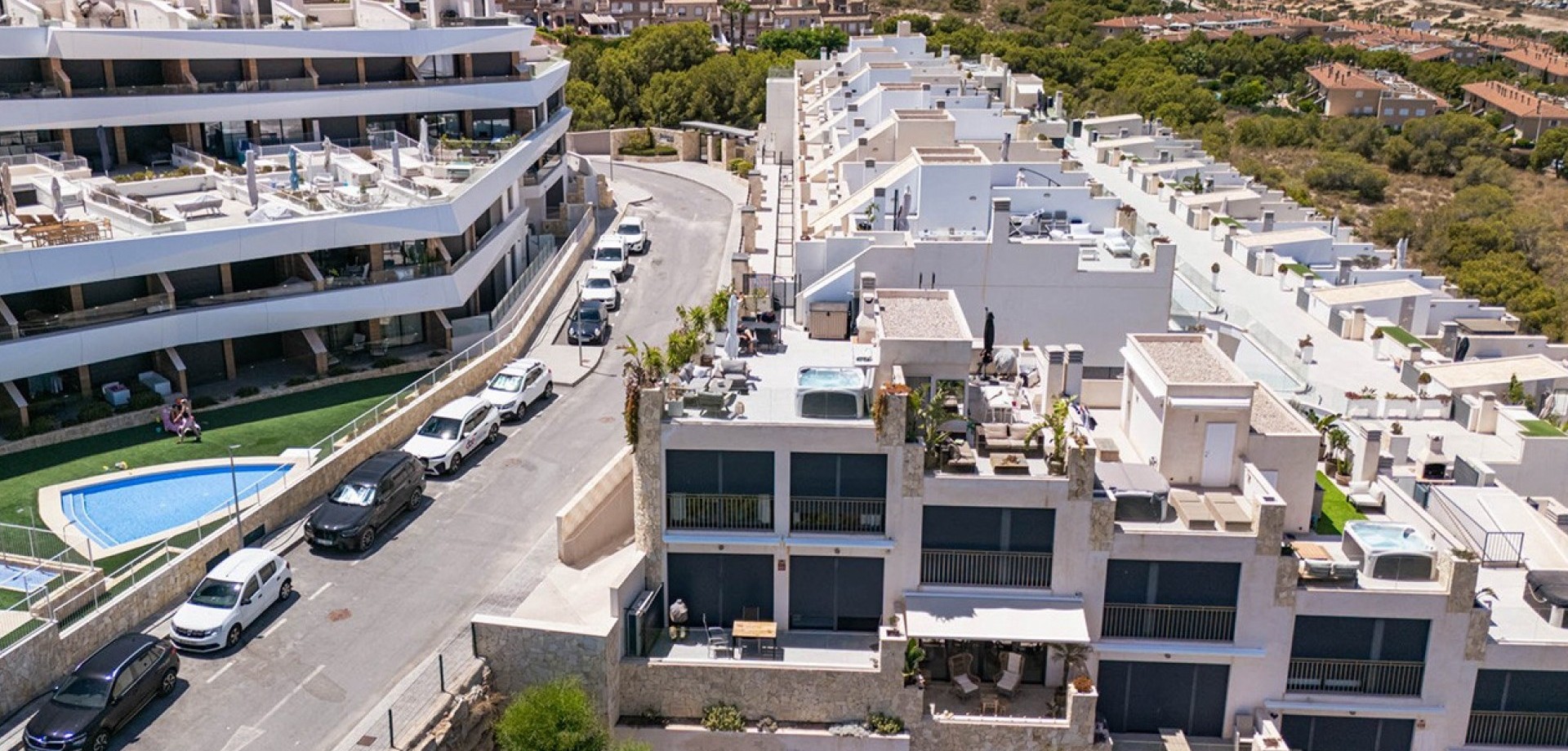 Costa Blanca Eiendom presenterer denne flotte boligen som ligger i et av de mest ettertraktede områdene i Gran Alacant, bare 1 km fra Carabassí-stranden. Dette elegante toppleiligheten ligger i et godt vedlikeholdt boligkompleks som kombinerer komfort, moderne design og en førsteklasses beliggenhet. Leiligheten har et bruksareal på 62,70 m² og er smart planlagt for best mulig utnyttelse. Den består av 2 romslige soverom med innebygde garderober, begge med godt naturlig lys, og 2 bad (ett komplett og ett gjestetoalett), med kvalitetsmaterialer og moderne stil. Stue og spisestue utmerker seg med sin romslighet og lysinnslipp takket være store vinduer som gir en åpen og luftig følelse. Det moderne, åpne kjøkkenet er fullt integrert i oppholdsrommet og gir en praktisk og sosial planløsning. Boligen har sentralisert klimaanlegg, noe som gir god komfort året rundt. Et av høydepunktene er det private solariumet på 57 m² som ligger på taket. Her finner du jacuzzi, grill, solsenger, dusj, vask med oppbevaring og spisebord – perfekt for å nyte utsikten og det fantastiske middelhavsklimaet. Boligen er en del av et privat boligkompleks med felles svømmebasseng, grøntområder og godt vedlikehold. Den inkluderer også parkeringsplass og bod i kjeller med enkel og direkte tilgang. Eiendommen ligger nær alle nødvendige tjenester, restauranter, supermarkeder og offentlig transport, og kun 10 minutter fra Alicante internasjonale flyplass. Ideell som fast bolig, feriebolig eller utleieinvestering. Ta kontakt med oss for mer informasjon, eller bli med på en av våre uforpliktende visninger av denne flotte boligen.