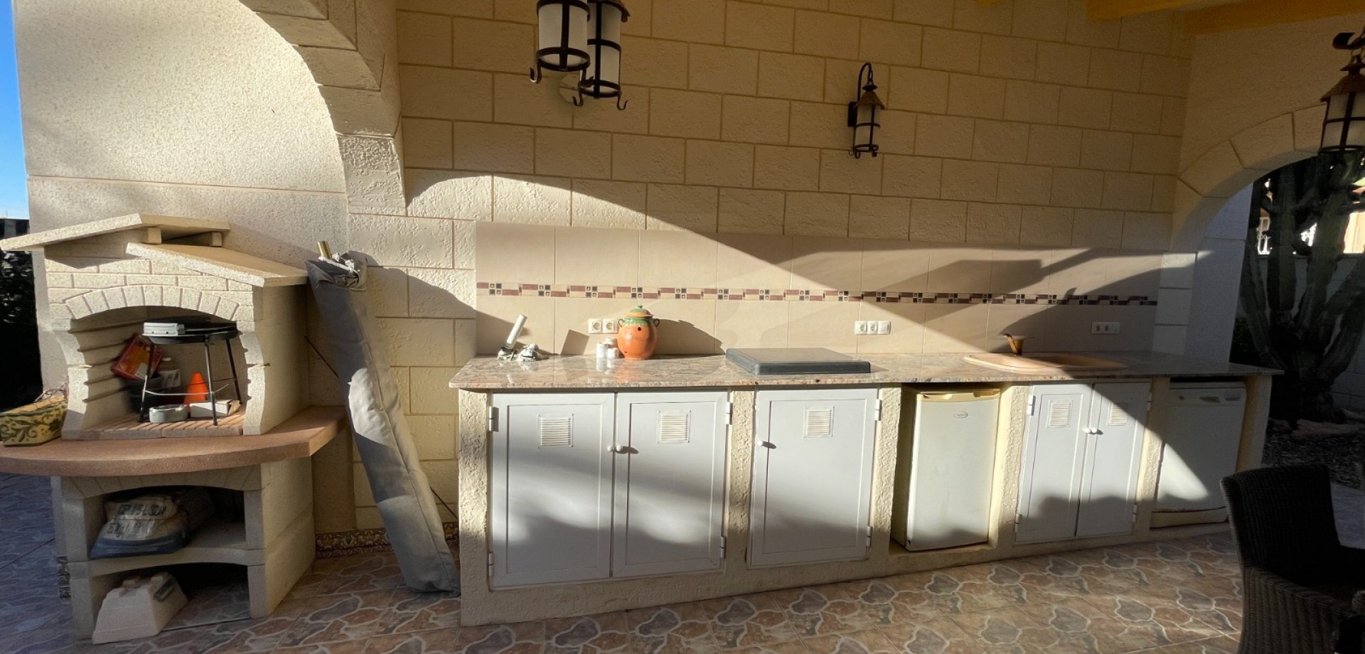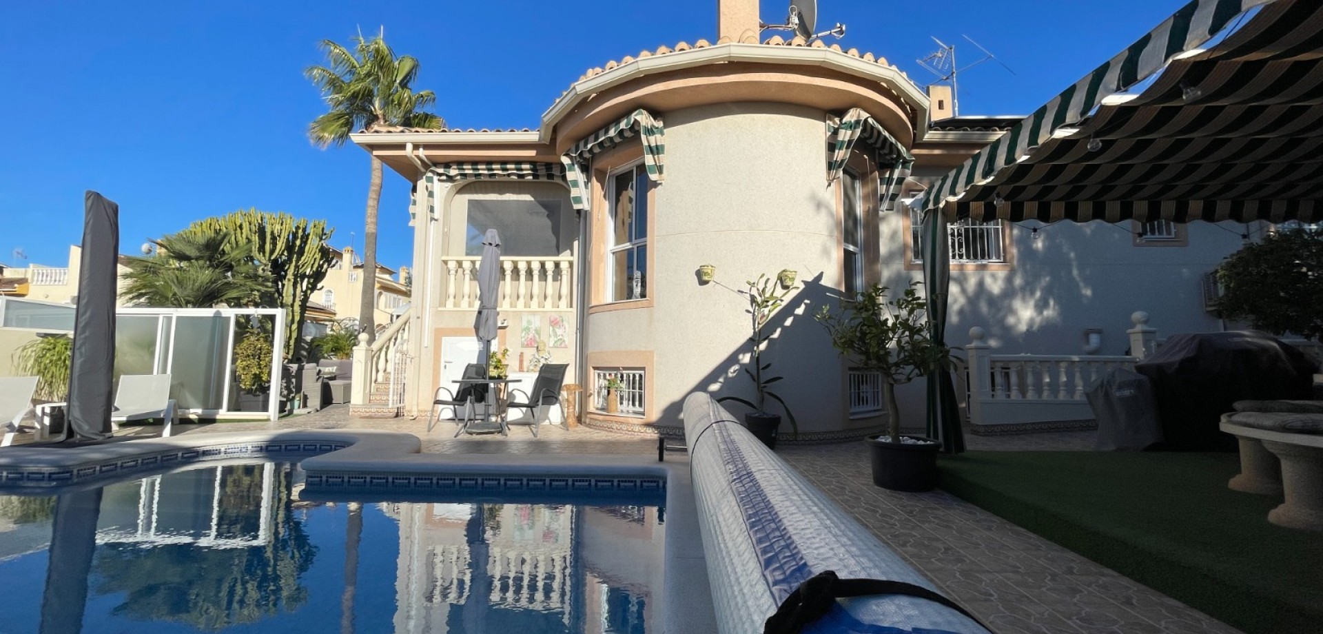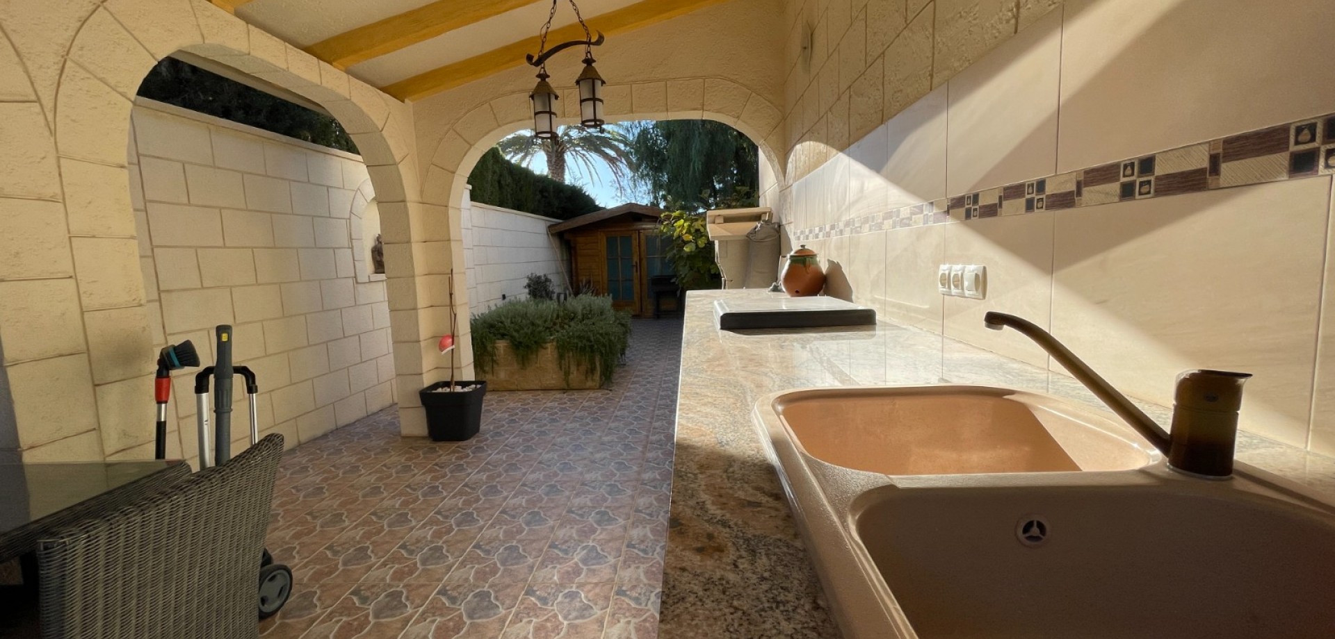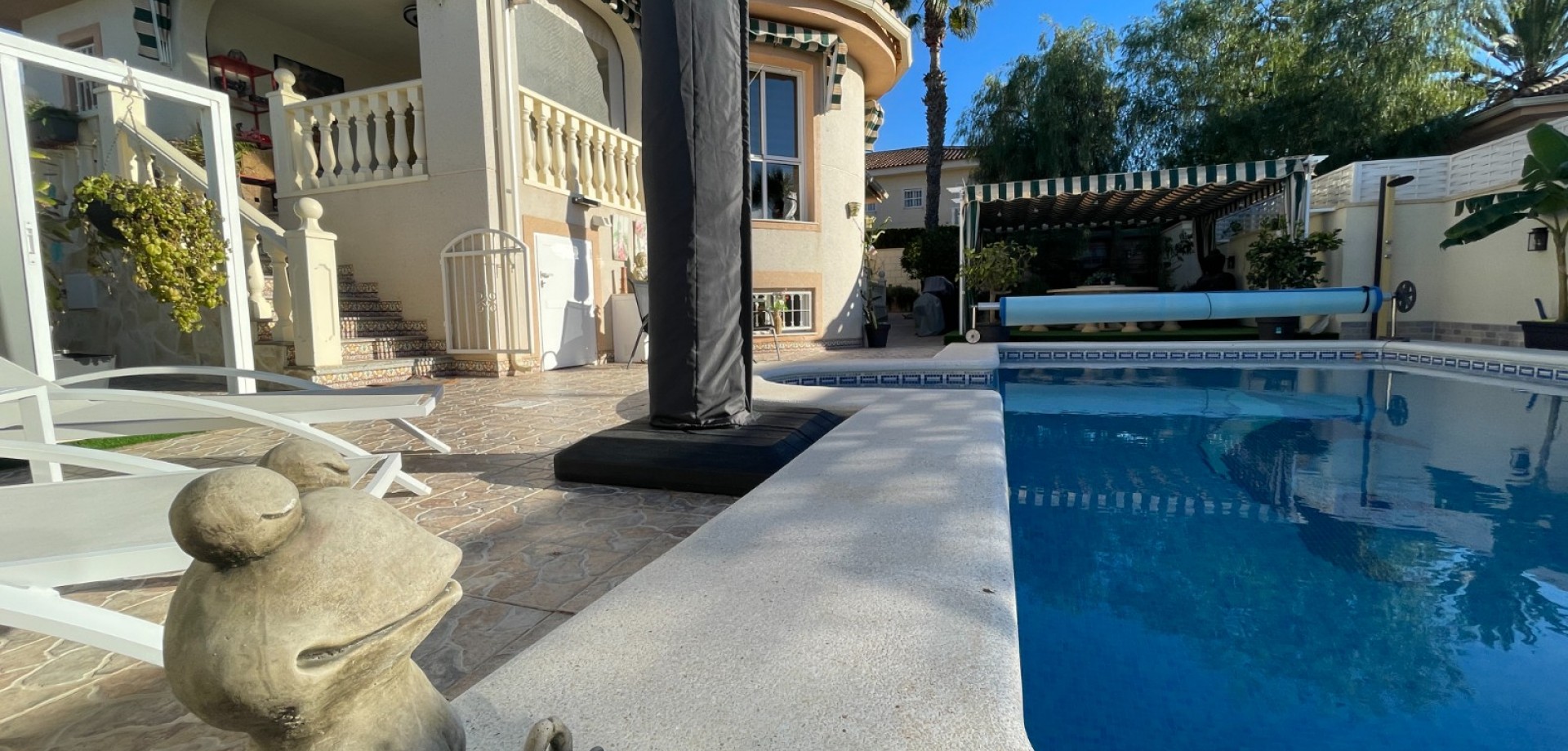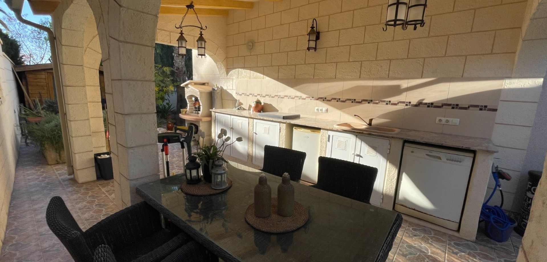 Sjarmerende villa i Benijófar Ligger i et rolig og populært område mellom Rojales og Ciudad Quesada, og denne villaen på to etasjer står på en tomt på 500 m². Øverste etasje har entre, stue, kjøkken med spisestue, to soverom og to bad (ett av dem en suite) med en koselig terrasse. Nederste etasje har ekstra stue/soverom, kjøkken, tre soverom og ett bad, totalt 5 soverom.Eiendommen har svømmebasseng, flere patioer, utendørs kjøkken med spiseområde, hage og parkeringsplass — perfekt for familier.Eiendommen har solcellepaneler for energieffektivitet, samt en varmepumpe til bassenget, perfekt for å nyte vannet året rundt.Benijófar er en autentisk spansk landsby med alle nødvendige tjenester: restauranter, apotek, bank og frisør, samt fritidsaktiviteter som golf og turstier. Stranden og Torrevieja ligger kun 15 minutter med bil.Perfekt for de som søker et romslig, velholdt hjem med en vakker hage. Velkommen hjem.