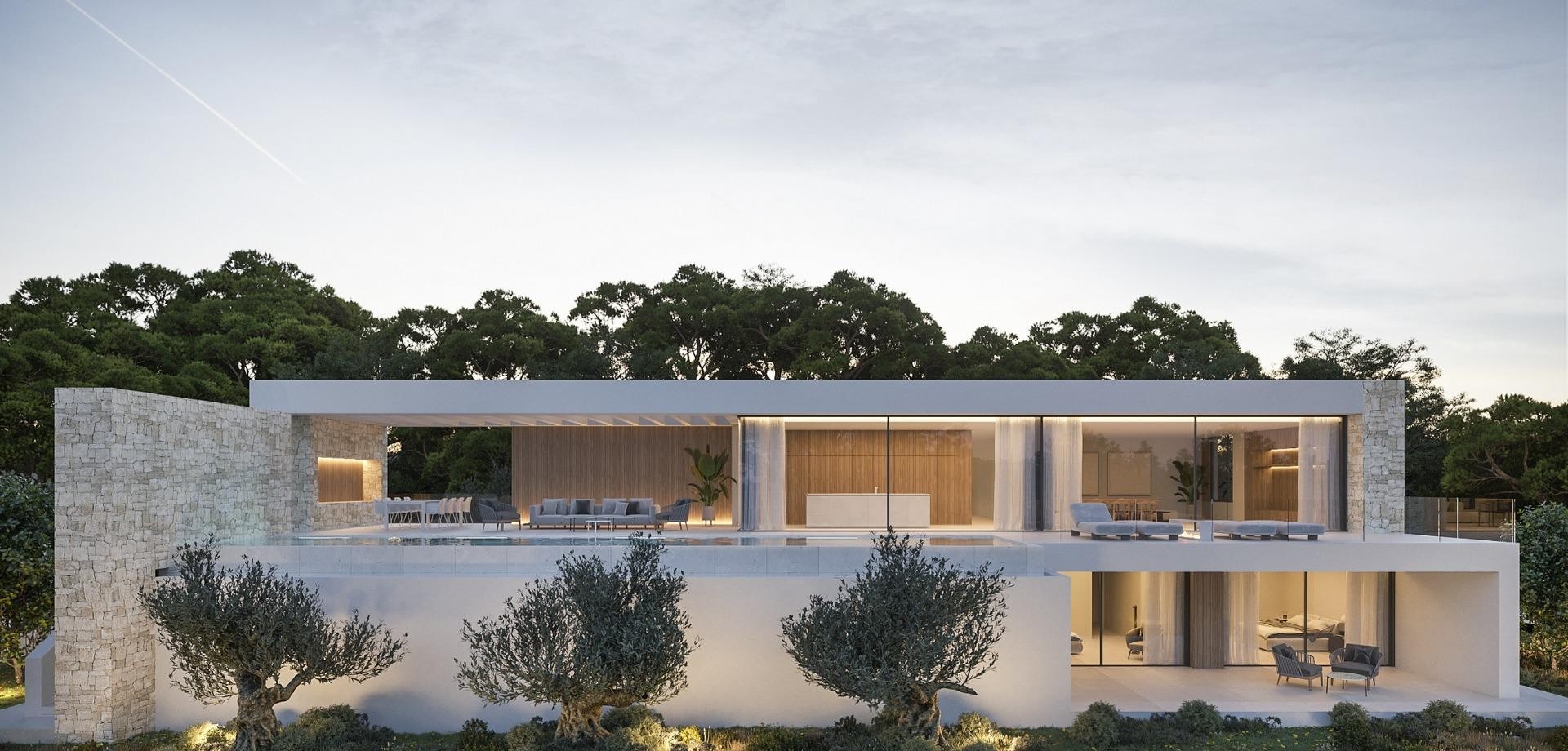 Luksuriøse nybyggvillaer til salgs i Moraira-Teulada nær sjøen Eksklusive, moderne villaer i Moraira, Nord-Costa Blanca Oppdag et eksklusivt boligprosjekt bestående av bare fire luksuriøse villaer, beliggende i det prestisjefylte Moravit-området i Moraira, i kommunen Teulada på Nord-Costa Blanca. Dette eksklusive prosjektet gir en enestående mulighet til å eie et moderne middelhavshjem bare 900 meter fra sjøen på et av de mest ettertraktede kyststedene i regionen. Moraira er kjent for sin sjarmerende fiskehavn, avslappede atmosfære og vakre strender med krystallklart vann. I motsetning til mange større feriebyer har Moraira bevart sin tradisjonelle karakter, samtidig som den tilbyr utmerkede restauranter, små butikker og fritidstilbud. Området rundt byr på naturskjønne kystbukter, vingårder og naturlandskap, noe som gjør det til et perfekt reisemål både for fastboende og luksuriøse ferieboliger. Avantgarde-arkitektur med romslige planløsninger Prosjektet tilbyr fire forskjellige villamodeller med bebygget areal fra ca. 250 m² til 380 m², alle beliggende på romslige tomter på over 1000 m². Arkitekturen kombinerer moderne design med tradisjonelle middelhavselementer som hvite pussede vegger, naturstein og varme treinnslag. Denne villamodellen er fordelt på to etasjer med en funksjonell og elegant planløsning. Første etasje rommer hovedsoveområdet med tre romslige soverom samt en privat garasje for to biler. Den øvre etasjen er utformet som hovedoppholdsrom, med en åpen stue, spiseplass og designerkjøkken med kjøkkenøy. Store vinduer fra gulv til tak åpner opp interiøret mot panoramautsikt over det omkringliggende landskapet og middelhavshimmelen. En pergola strekker seg ut mot terrassen og skaper et komfortabelt uteområde med grillplass, ideelt for å ha gjester eller slappe av med familie og venner. Luksuriøse overflater og moderne teknologi Hver villa er bygget med førsteklasses materialer og overflater av høy kvalitet for å gi komfort, effektivitet og moderne stil. Privat evighetsbasseng Anlagt hage med trær og automatisk vanningsanlegg Innebygd LED-belysning i hele boligen Sikkerhetsinngangsdør Designerkjøkken fullt utstyrt med BOSCH-apparater Gulvvarme og klimaanlegg med uavhengige termostater AIRZONE klimakontrollsystem Heis som forbinder begge etasjer Solcelleanlegg på 4 kW Alle oppholdsrom vender mot terrassen, hagen og bassengområdet, noe som skaper en naturlig forbindelse mellom inne- og utelivet. Førsteklasses beliggenhet nær strender og attraksjoner ved kysten Playa de l'Ampolla 1 km Cala Cap Blanc 1,2 km Cala del Moraig 7 km Club de Golf Ifach 5 km Moraira Marina og havn 2 km Alicante Elche lufthavn 90 km Valencia lufthavn 120 km De fredelige boligområdene i Moravit byr på grønne landskap og vakker utsikt, samtidig som de ligger nær Morairas livlige sentrum. Opplev luksuslivet i Moraira Disse eksepsjonelle villaene kombinerer elegant middelhavsdesign, romslige tomter og en privilegert beliggenhet nær sjøen. Kontakt oss i dag for å få mer informasjon eller avtale en privat visning, og sikre deg ditt nye luksushus i Moraira på Costa Blanca. 466