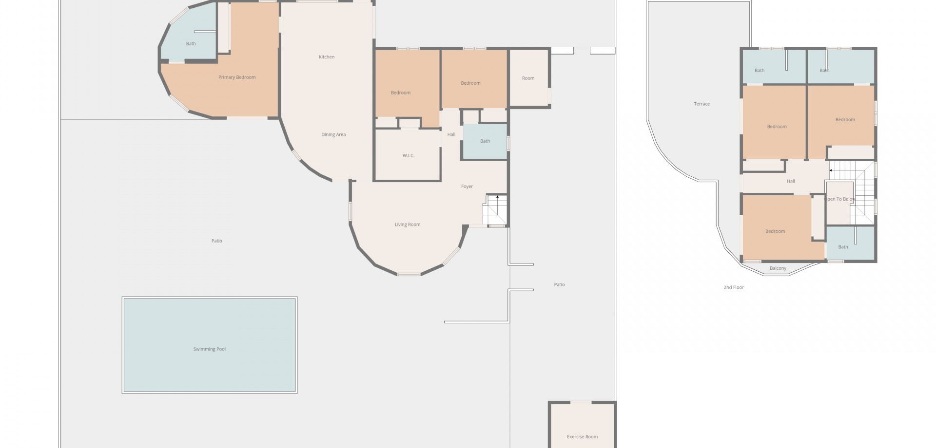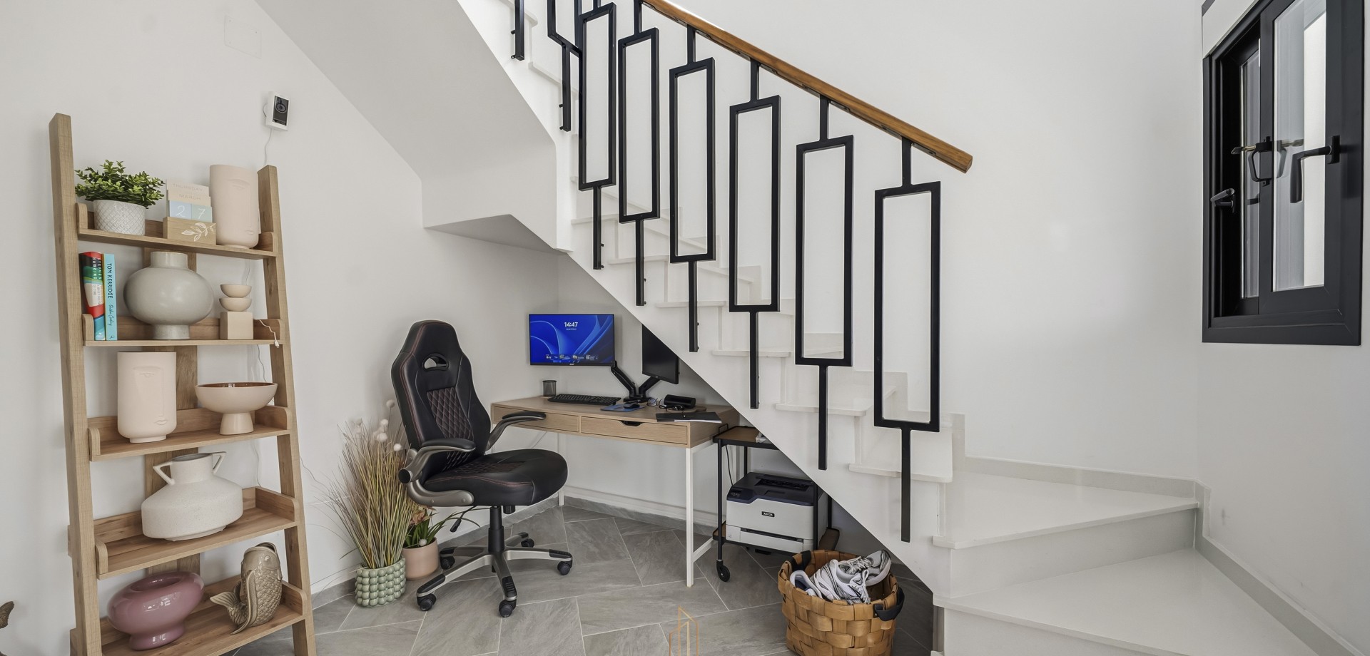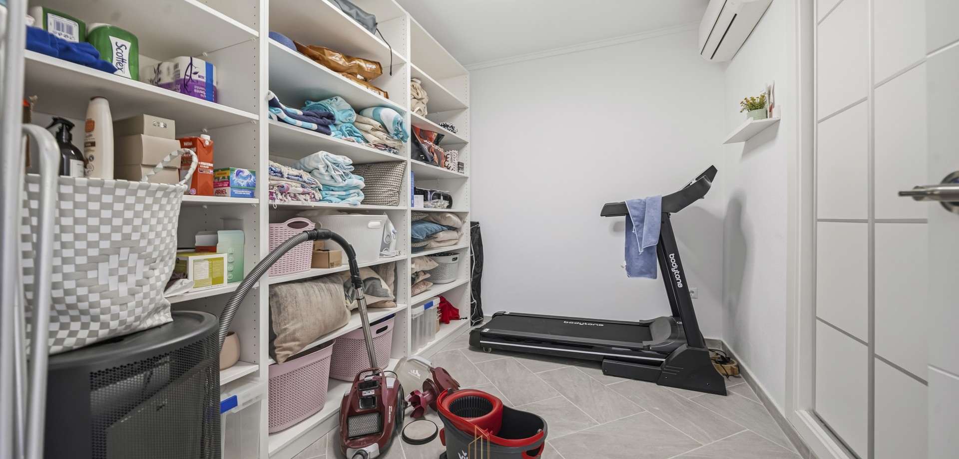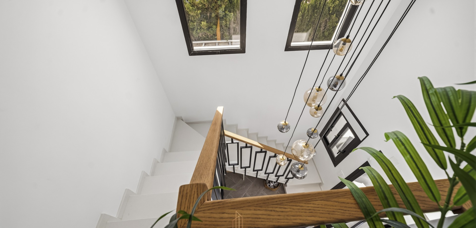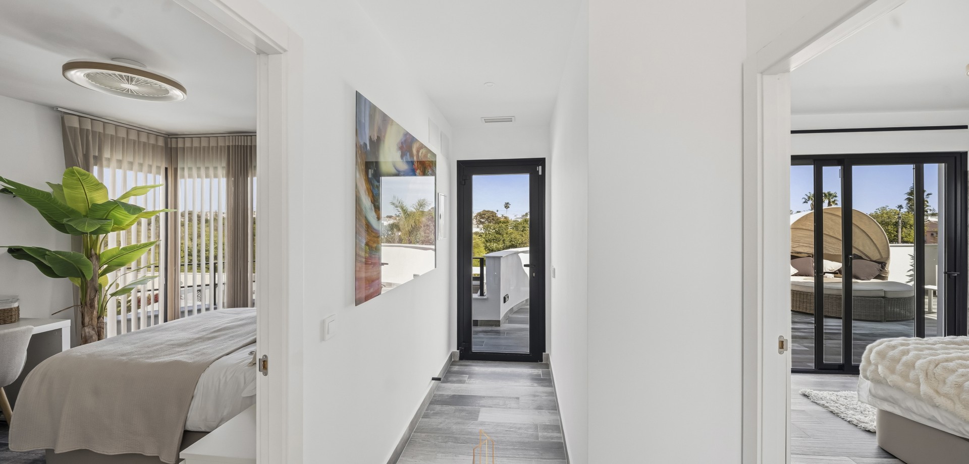 Første etasje har en lys stue med store vinduer, åpen kjøkkenløsning, 3 soverom, kontorområde og ekstra plass som kan brukes som et syvende soverom. Øverste etasje har 3 soverom med egne bad og terrasse med utsikt over saltsjøen.