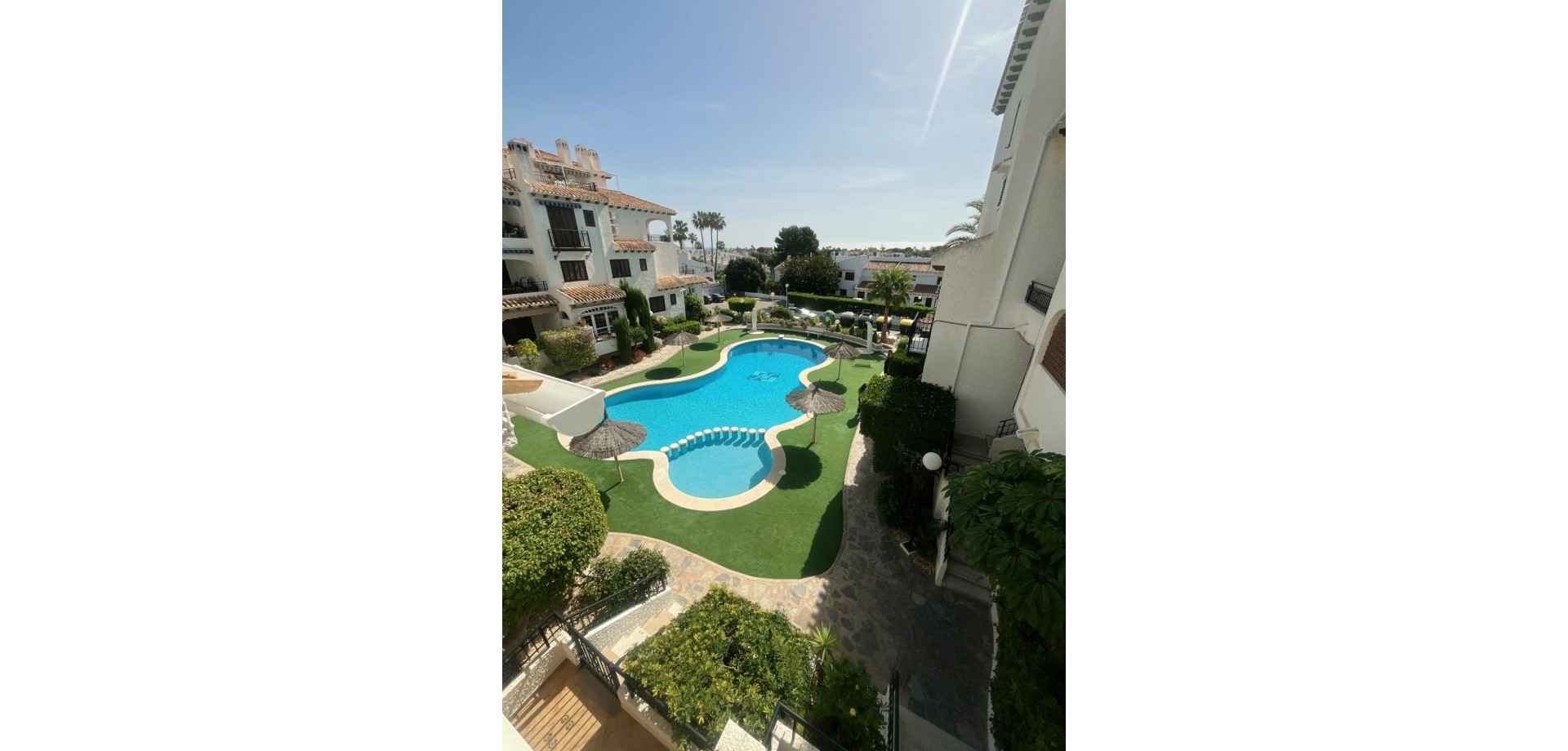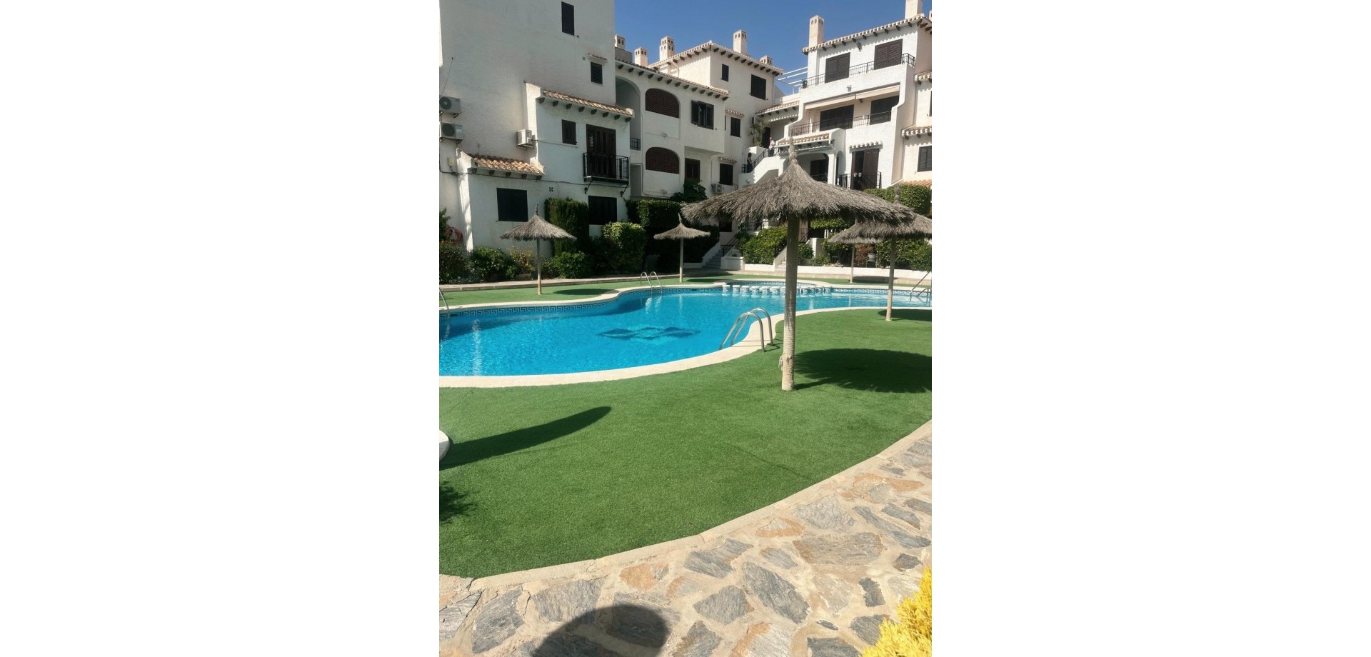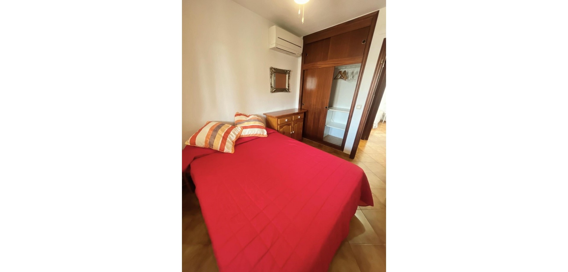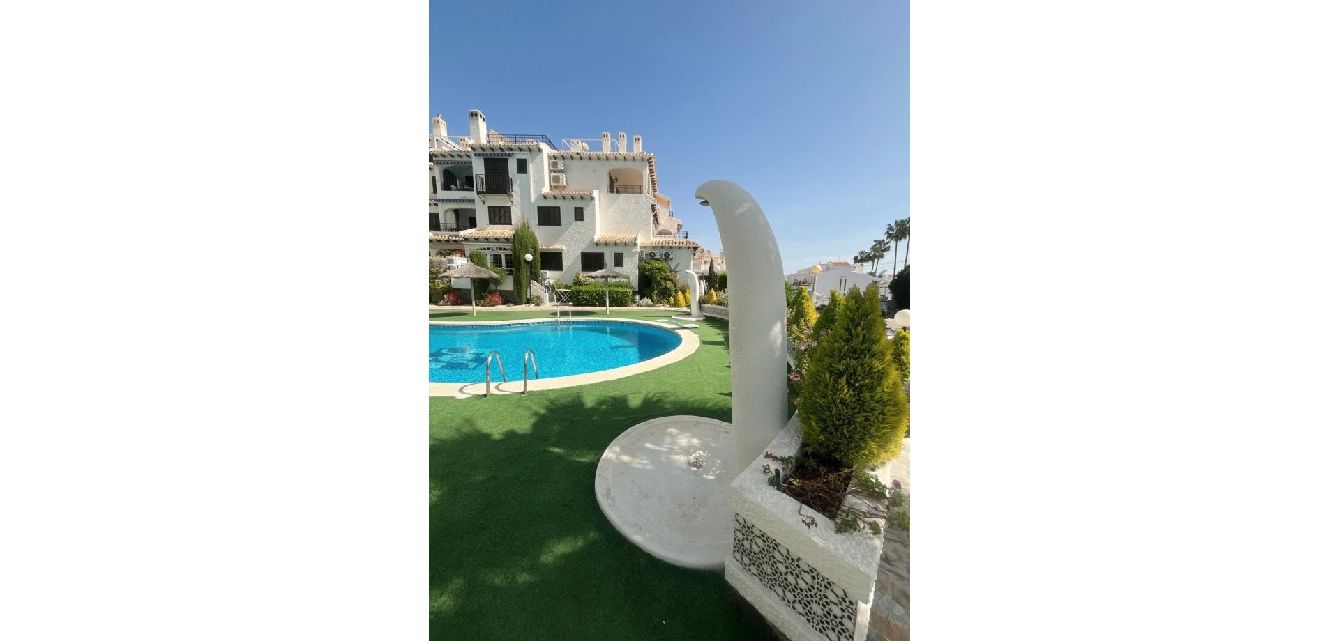 Denne velpresenterte leiligheten ligger nær strendene i Cabo Roig og tilbyr en praktisk planløsning med hyggelig utsikt over fellesområdene. Eiendommen har et lyst oppholdsrom med peis, med doble dører som fører ut til en dekket terrasse, stor nok for et bord, stoler og et avslappet sitteområde. Herfra nyter leiligheten utsikt over felles svømmebasseng og anlagte hager, som også inkluderer et utendørs dusjområde. Det er to doble soverom, begge med klimaanlegg og innebygde garderober. Hovedsoverommet har utsikt over terrassen, mens det andre soverommet har dobbeldører som åpner mot en liten privat balkong. Leiligheten inkluderer et familiebad, utstyrt med badekar og dusj over, bidet og standard sanitærutstyr. Det finnes også et komplett utstyrt separat kjøkken, sammen med et separat vaskerom utstyrt med vask, varmtvannstank og rørleggerarbeid for vaskemaskin. Eiendommen er ideelt plassert innen kort gangavstand til lokale fasiliteter og bare en kort avstand fra strendene i Cabo Roig, noe som gjør den egnet som feriebolig, fast bosted eller utleieinvestering på Costa Blanca.