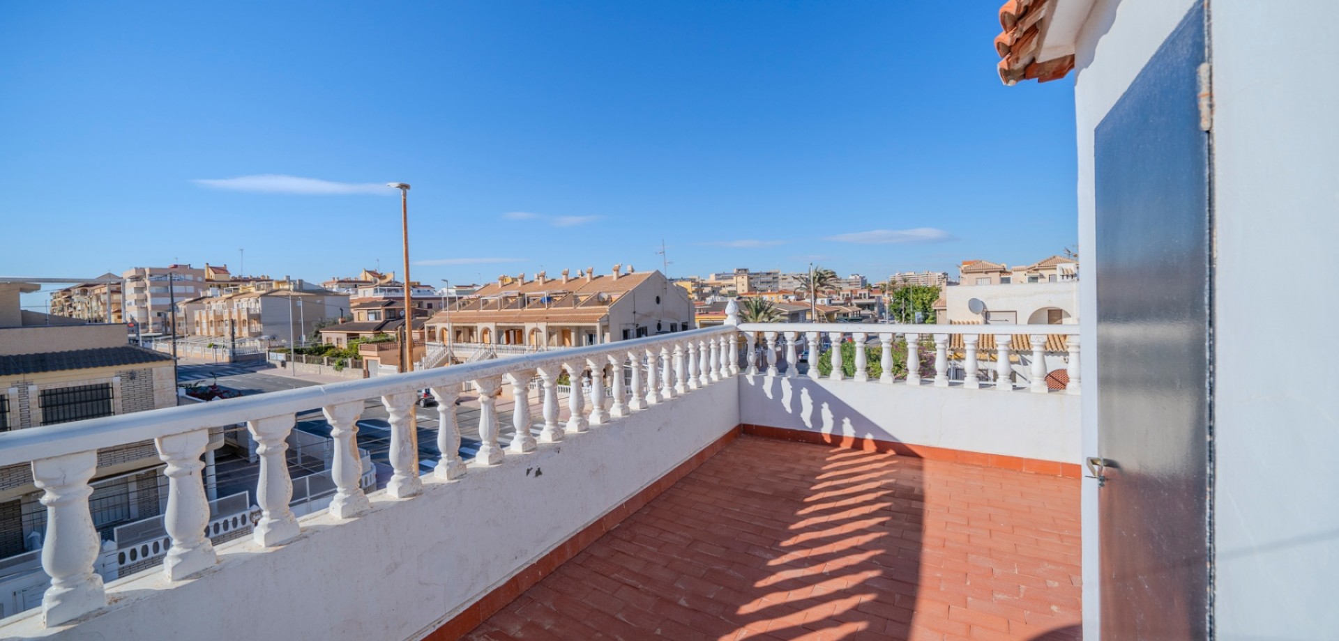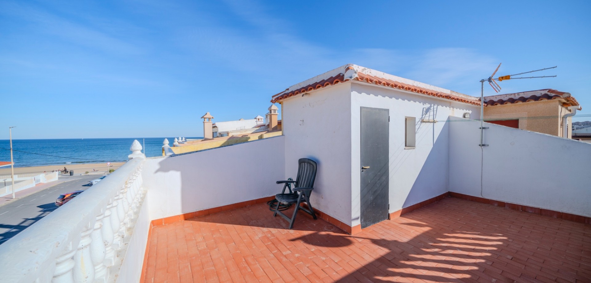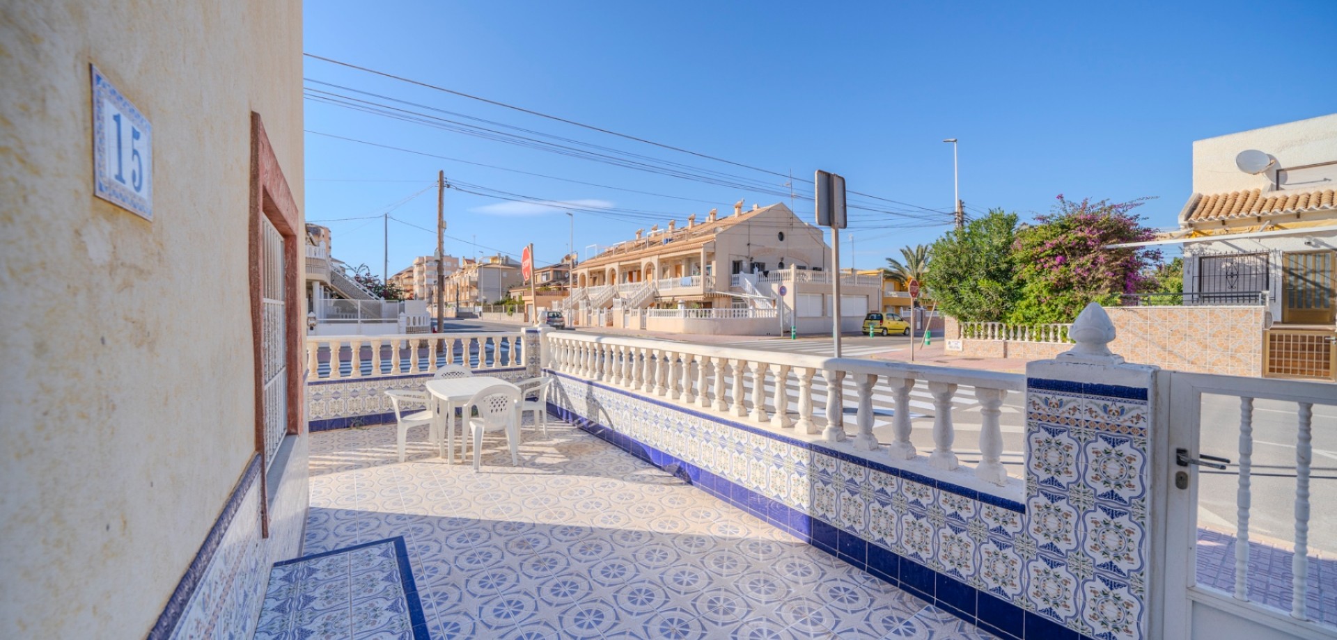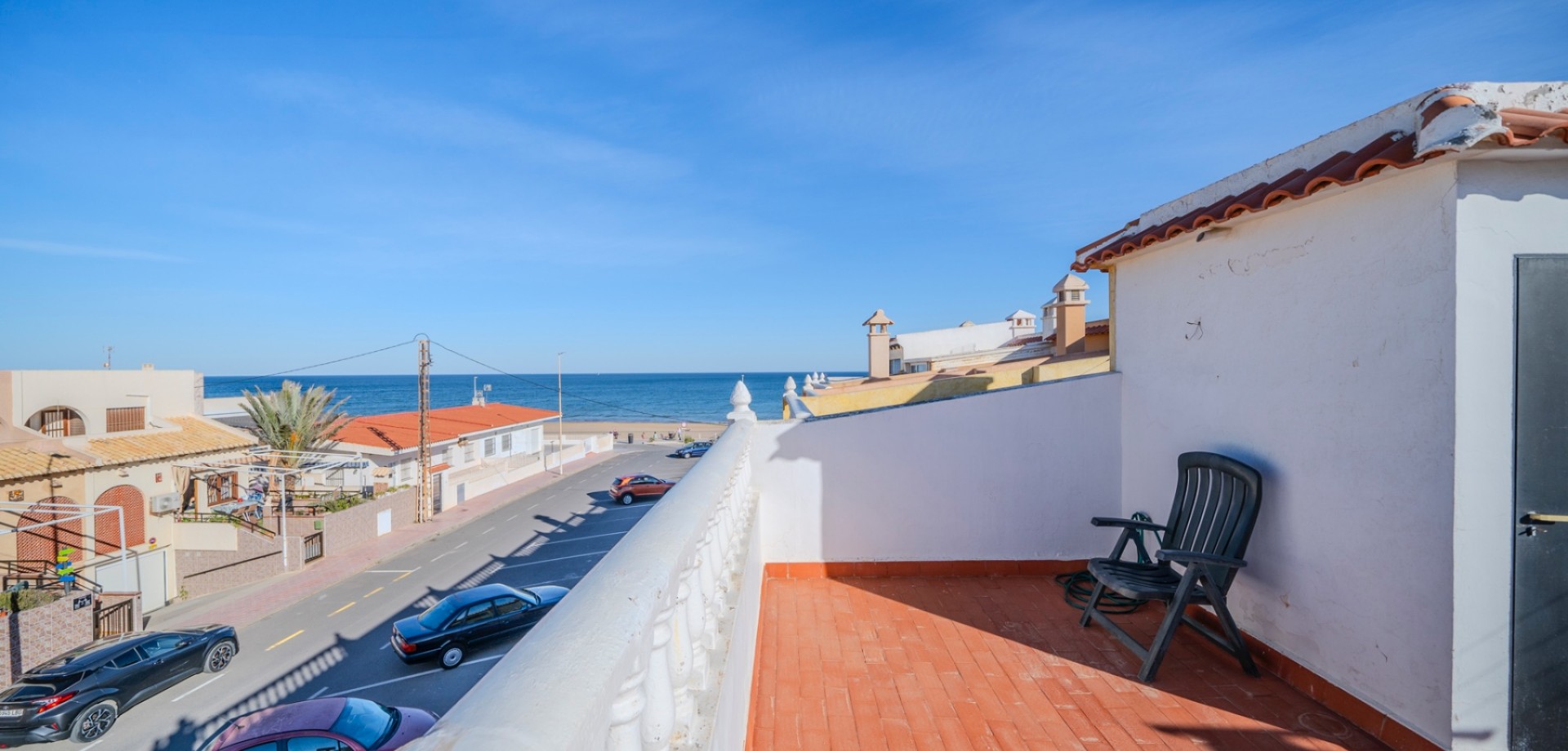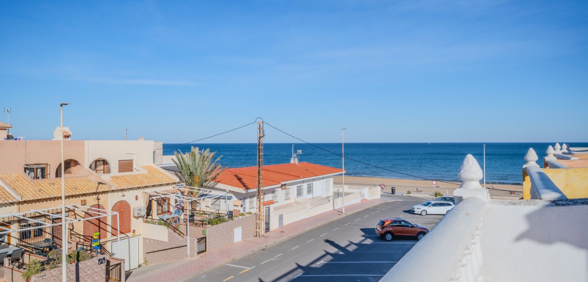 Hjørne rekkehus med havutsikt i La MataEiendommen ligger noen få meter fra La Mata-stranden. Den har 3 etasjer som er fordelt som følger. I første etasje finner vi stue og åpen kjøkkenløsning, samt bad. Huset har uteplass mot øst og nordøst som omkranser eiendommen. I første etasje finner vi to soverom, ett av dem med havutsikt, med innebygde garderober og takvifter. Det er også et bad med dusj og to vasker. I øverste etasje er det en utrolig terrasse med havutsikt.Det ligger i området La Mata, Torrevieja, som har utrolige strender med rikelig med sand og krystallklart vann, sanddyner og fantastiske landskap og naturparken Laguna Rosa de la Mata.Det er også nær alle nødvendige tjenester som busser, barer, restauranter, strender, supermarkeder, skoler, parker, etc.